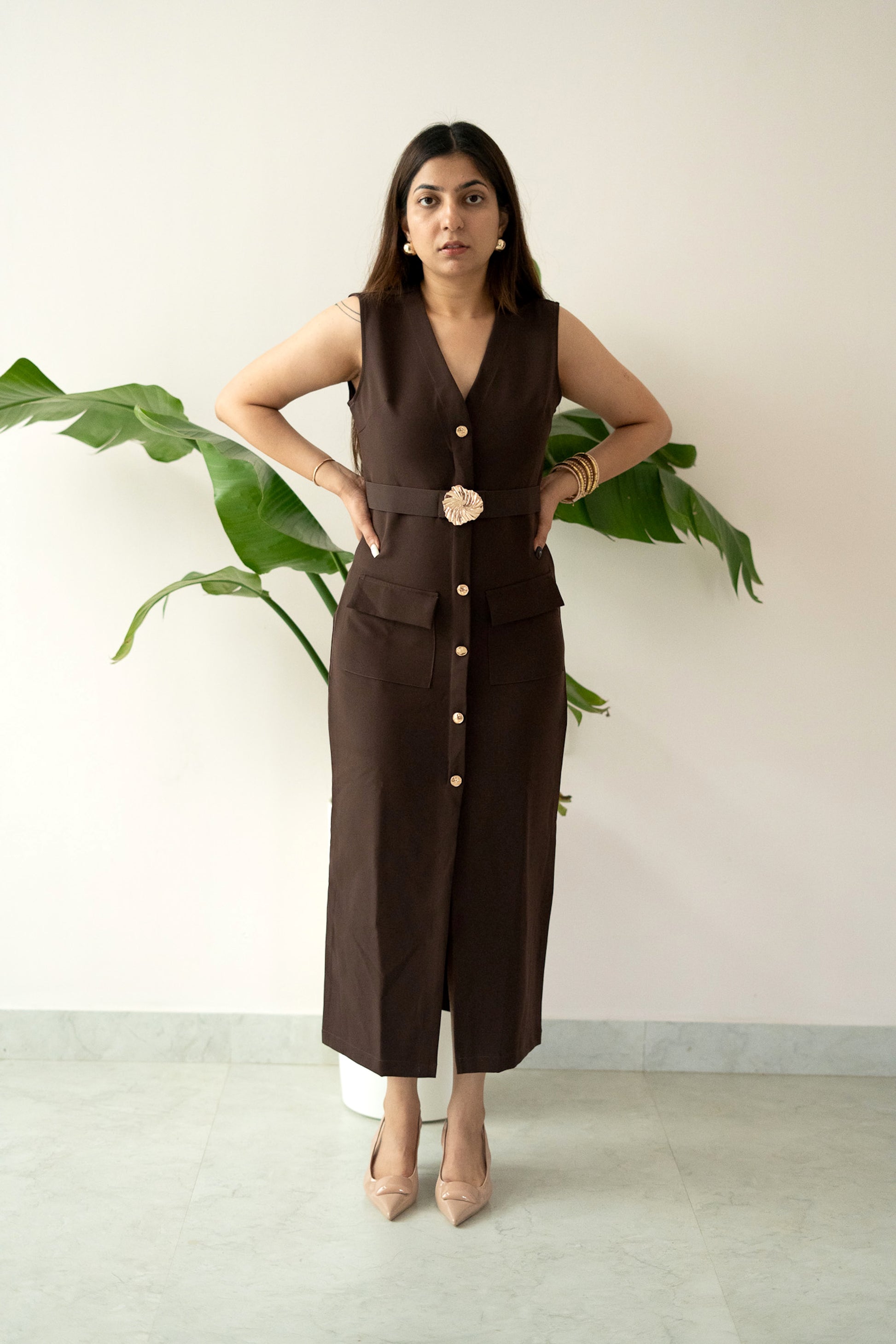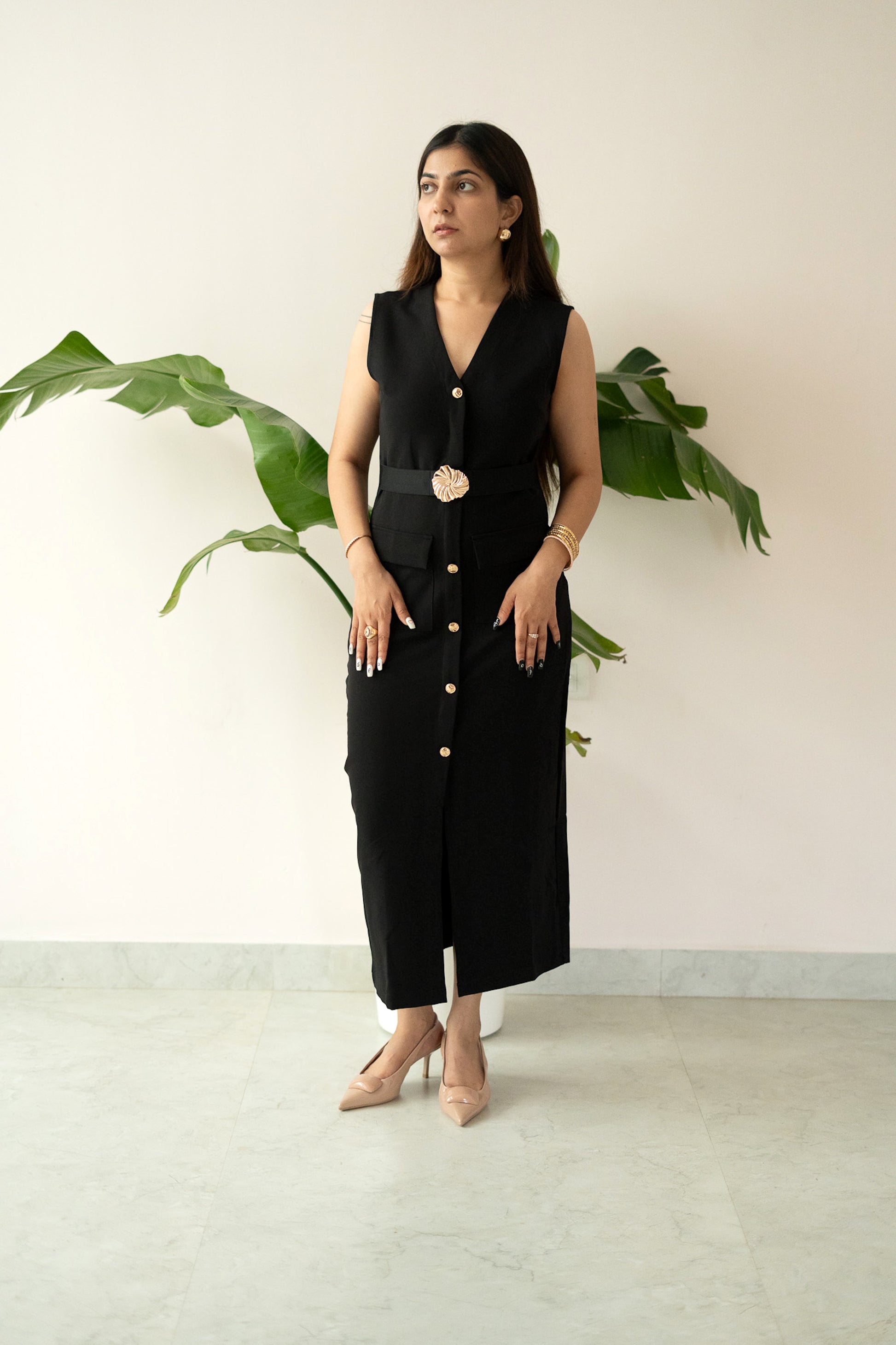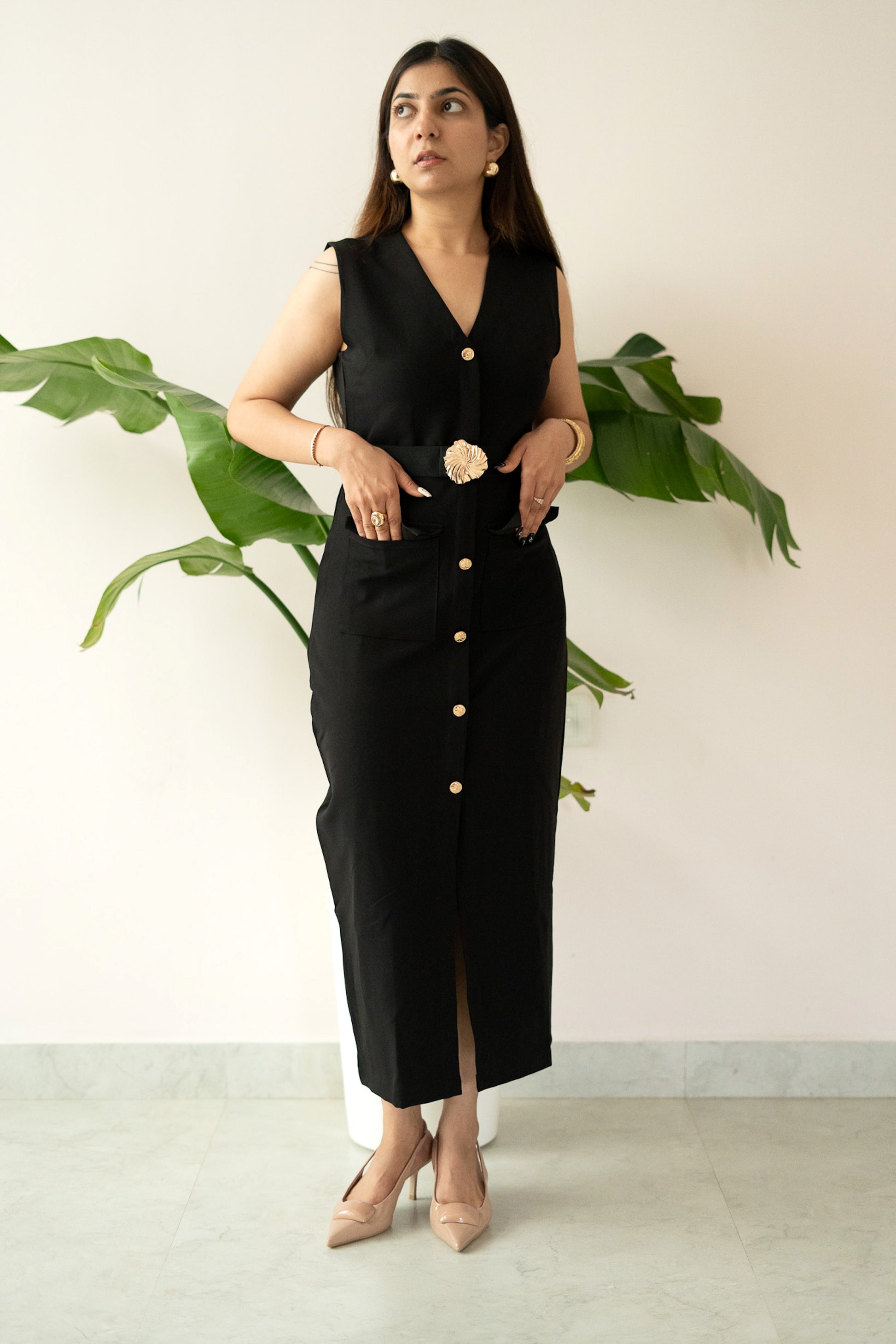 Featuring a deep V-neckline, front button detailing, and flap pockets, the dress is elevated with a statement gold-buckled belt that cinches the waist beautifully. The sleek midi-length silhouette transitions seamlessly from day sophistication to evening allure.