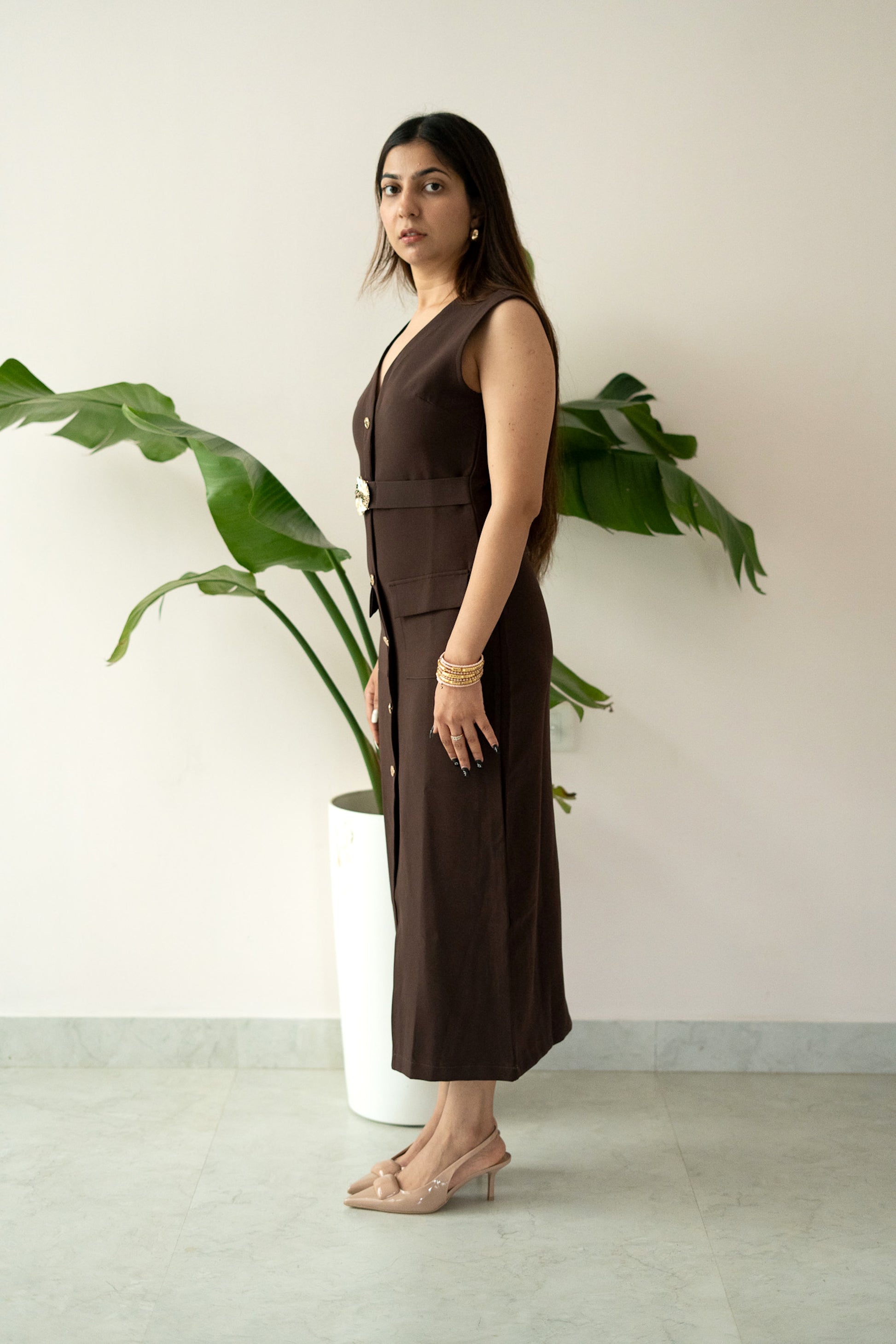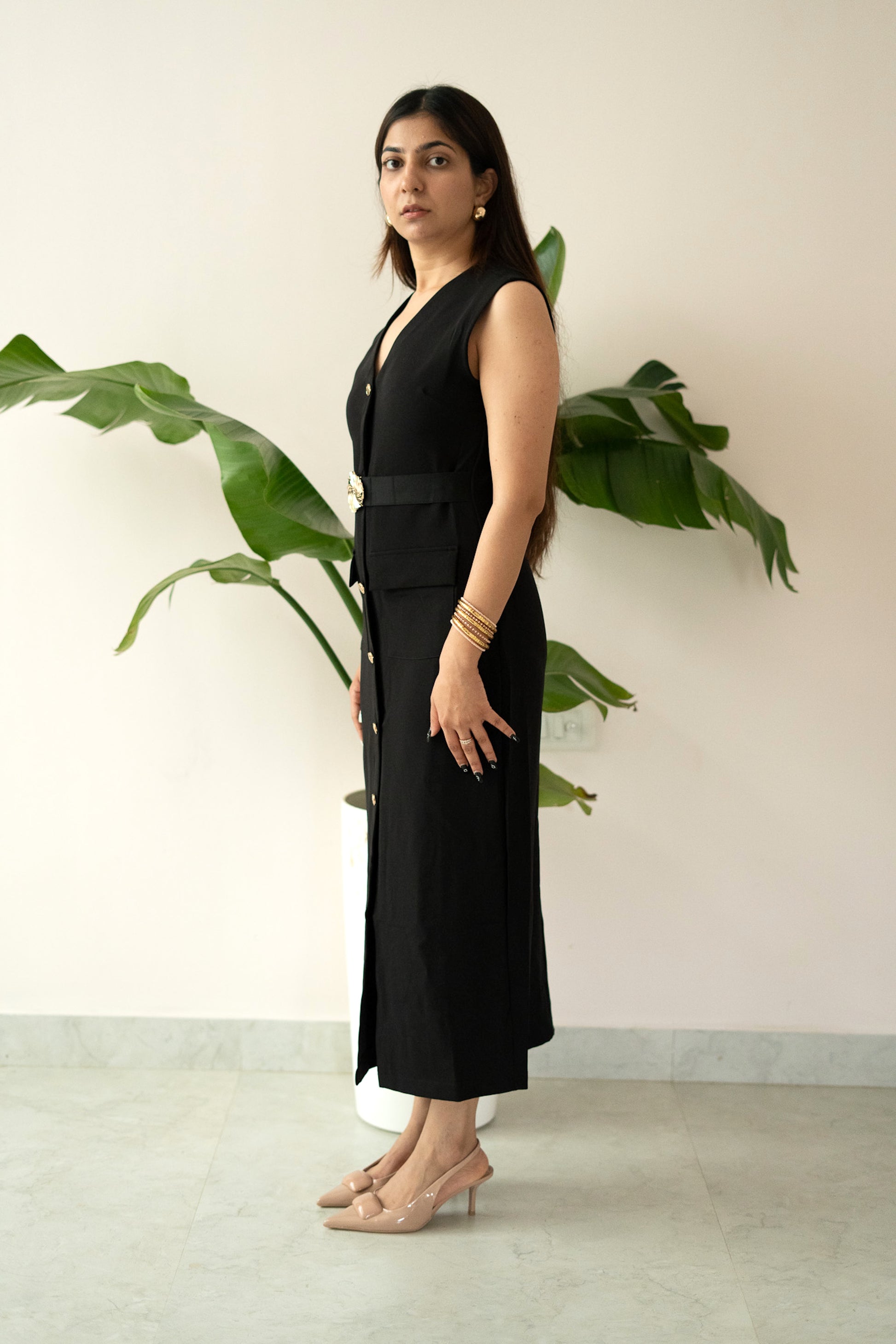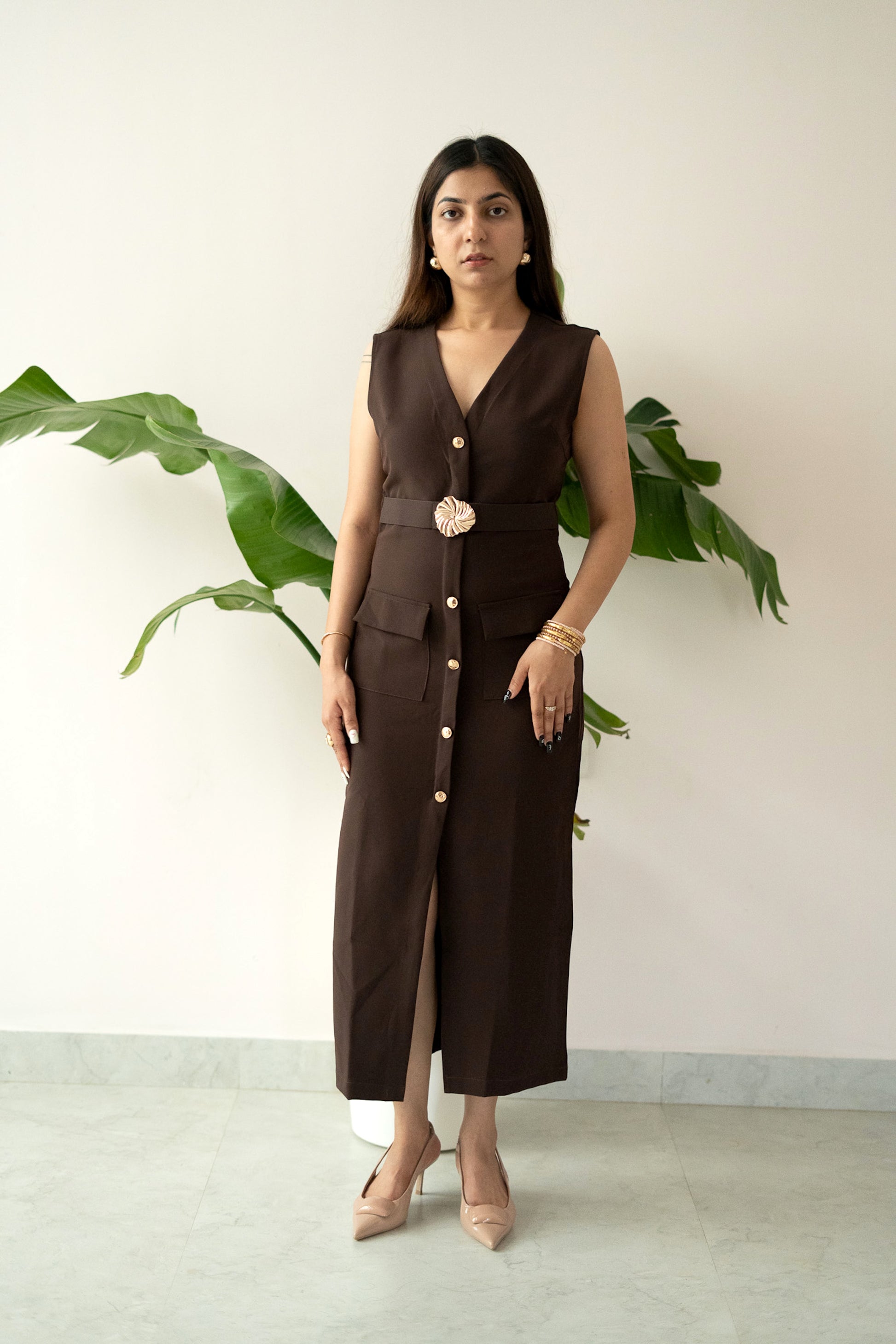Featuring a deep V-neckline, front button detailing, and flap pockets, the dress is elevated with a statement gold-buckled belt that cinches the waist beautifully. The sleek midi-length silhouette transitions seamlessly from day sophistication to evening allure.