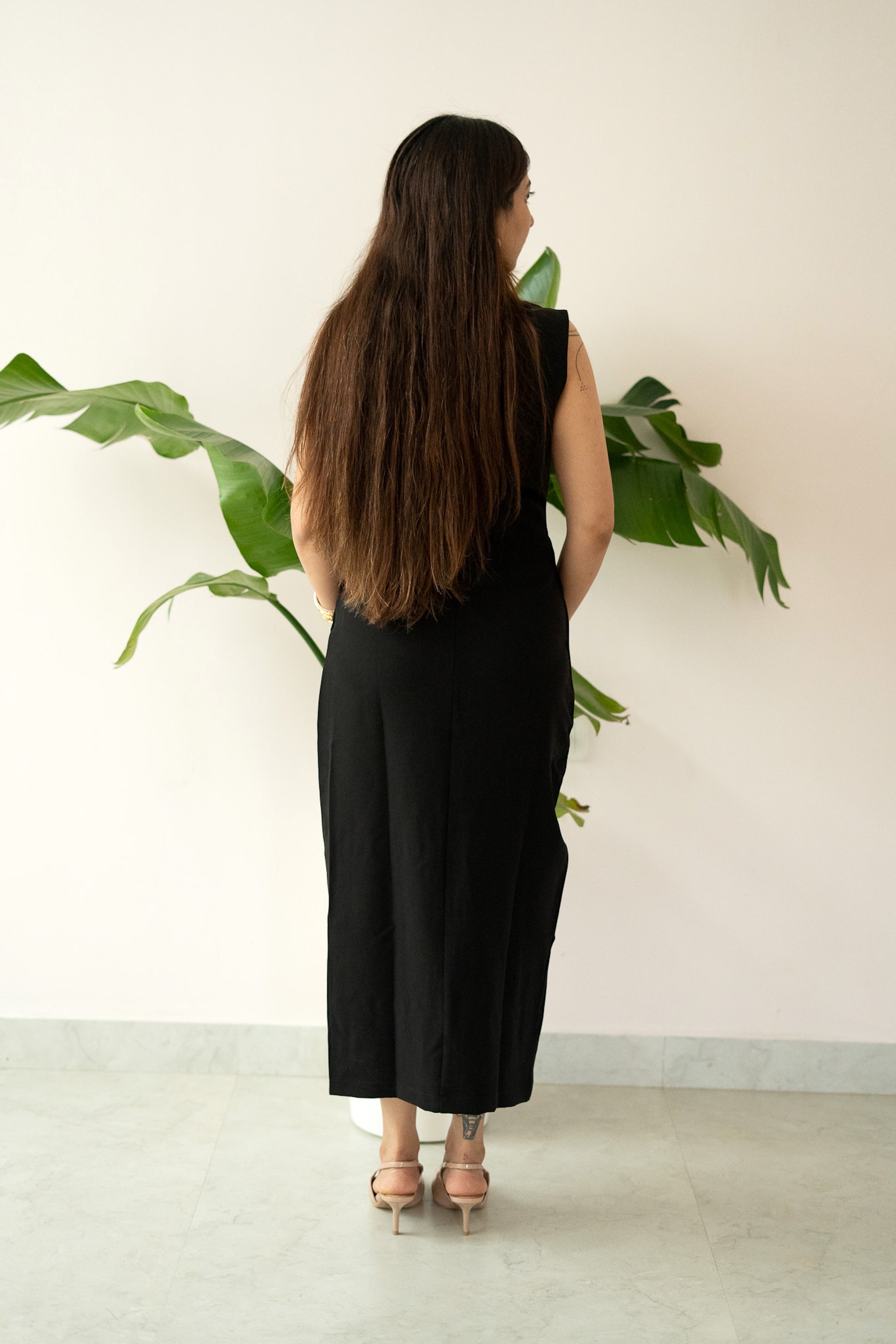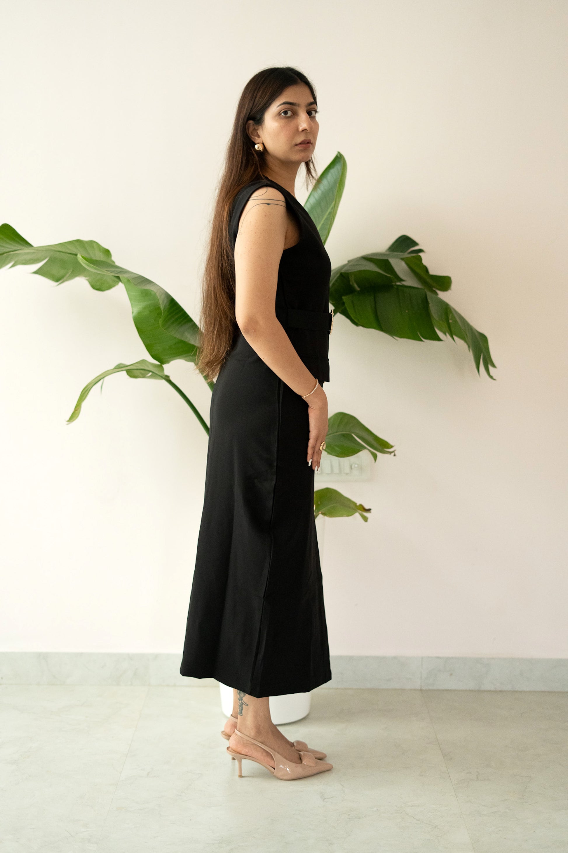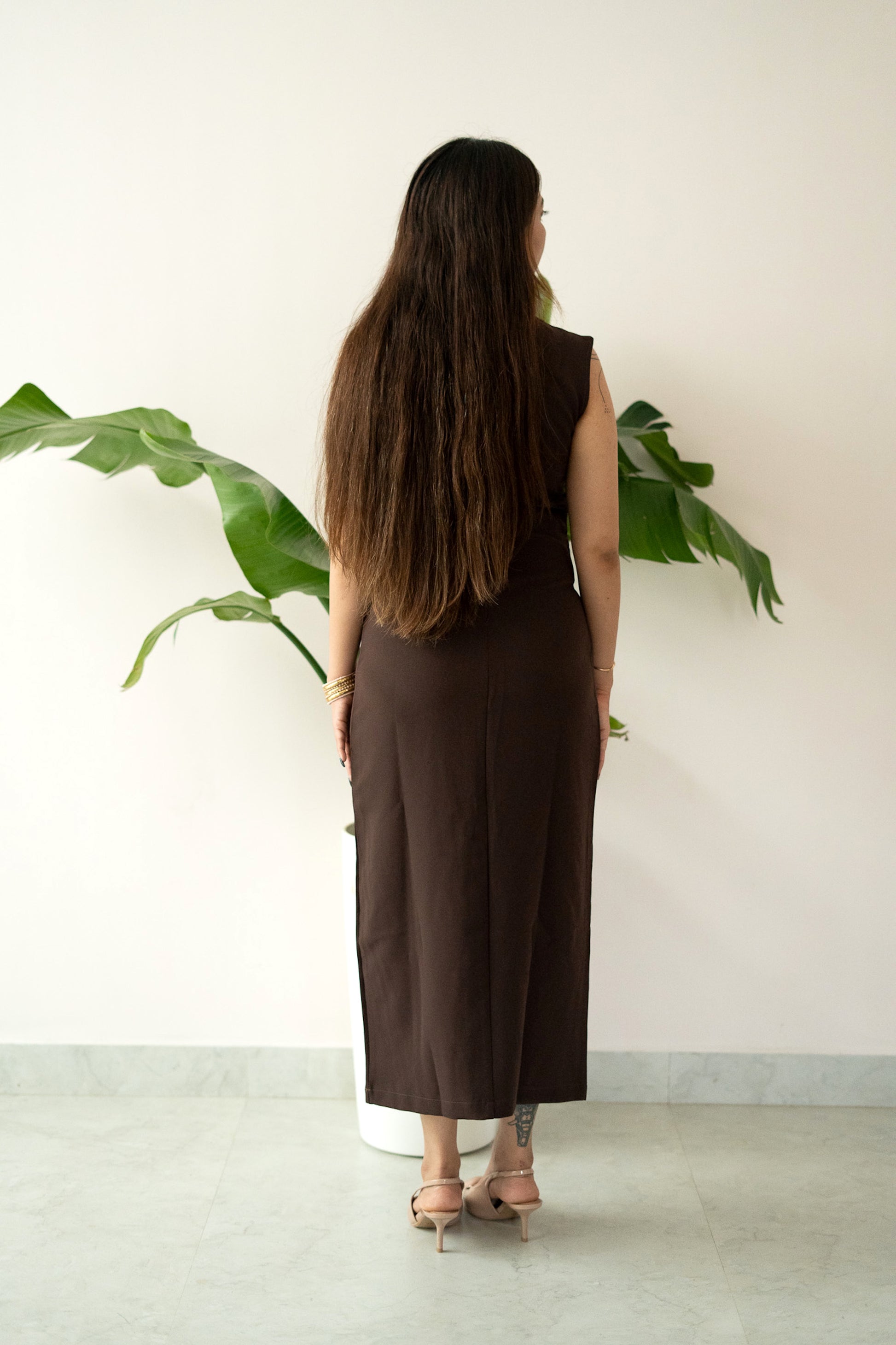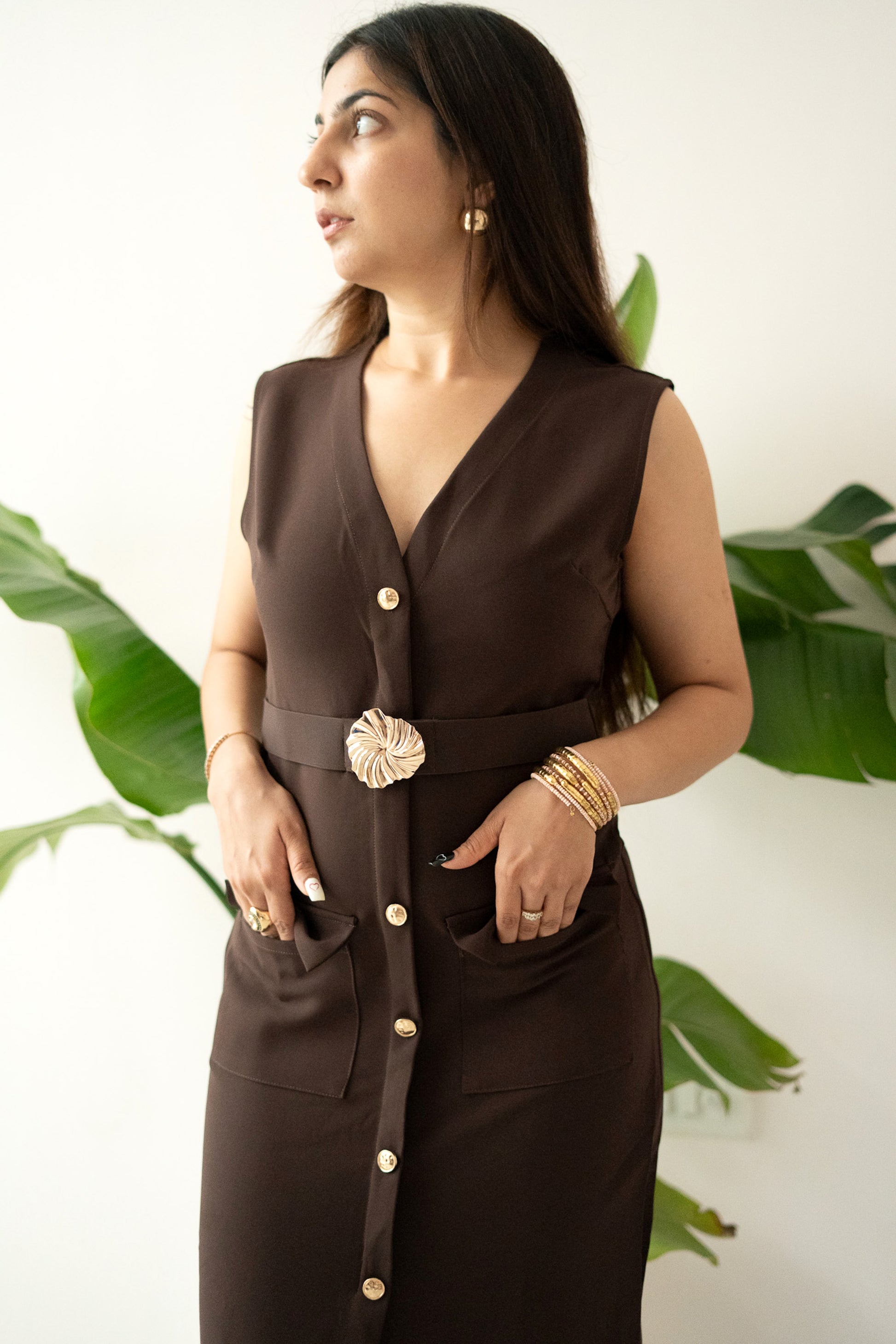 Chic, bold, and effortlessly refined — our “All Eyes On Me” dress is designed for the woman who commands attention with quiet confidence. Available in rich chocolate brown and classic black, this structured sleeveless piece brings together sharp tailoring and contemporary minimalism.