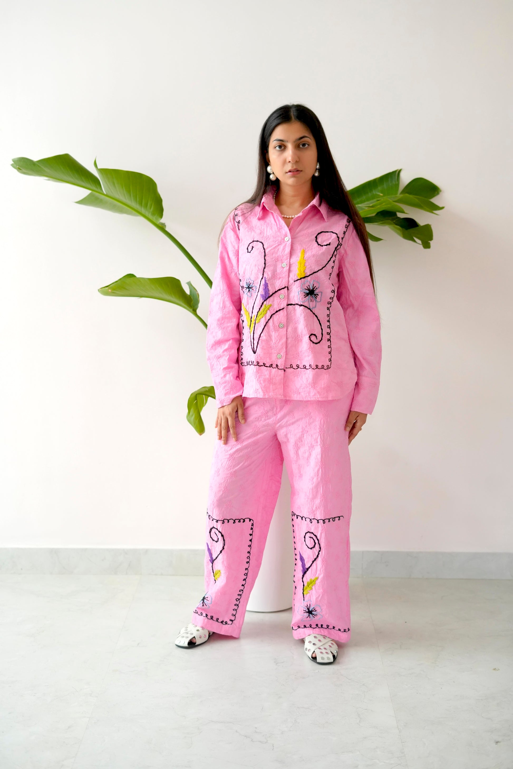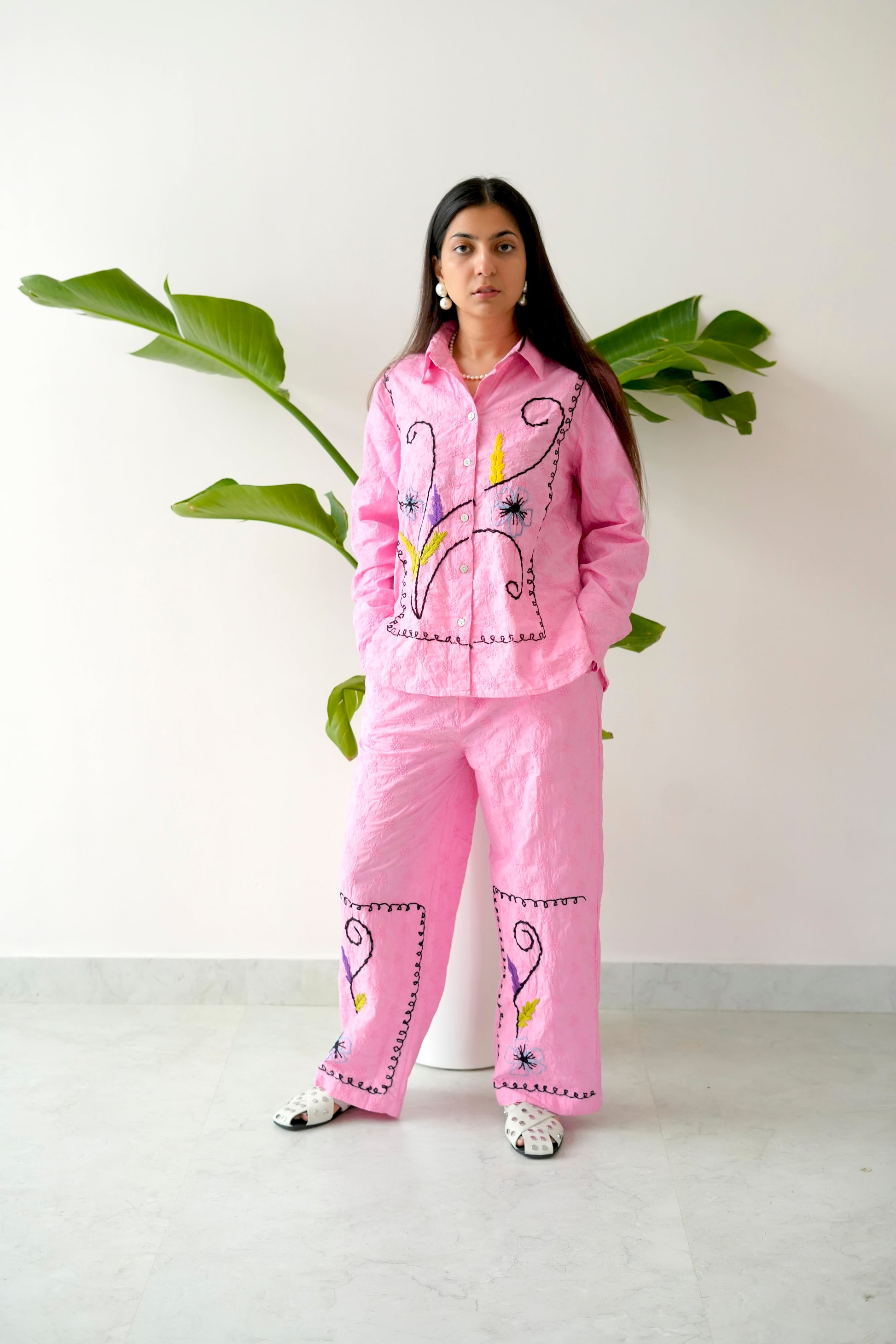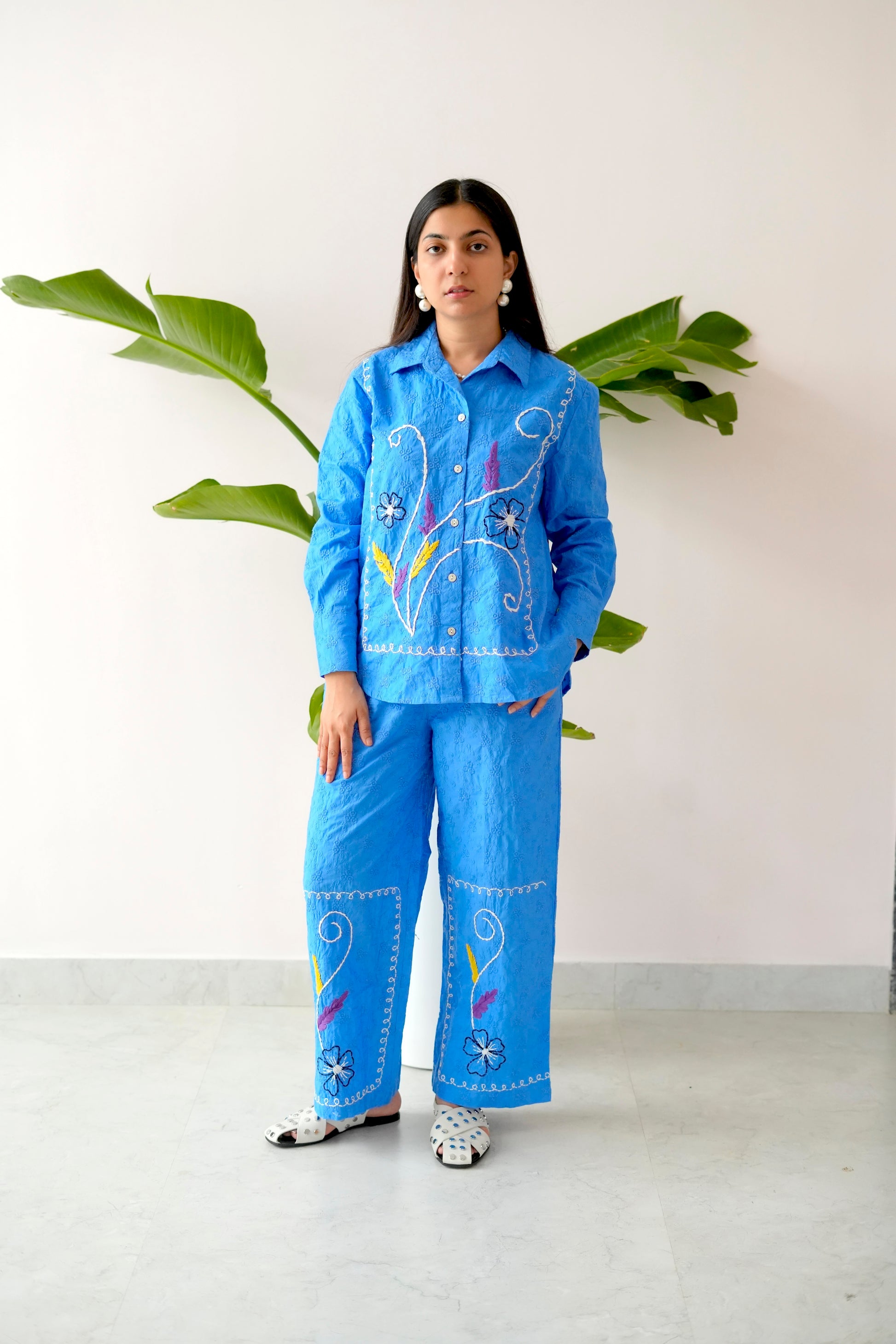Made from lightweight textured cotton fabric, the set features a front-button shirt with a structured collar, adorned with vibrant hand-inspired embroidery. The pants are equally striking, with symmetrical floral motifs and swirling patterns that elevate the design into wearable art.
