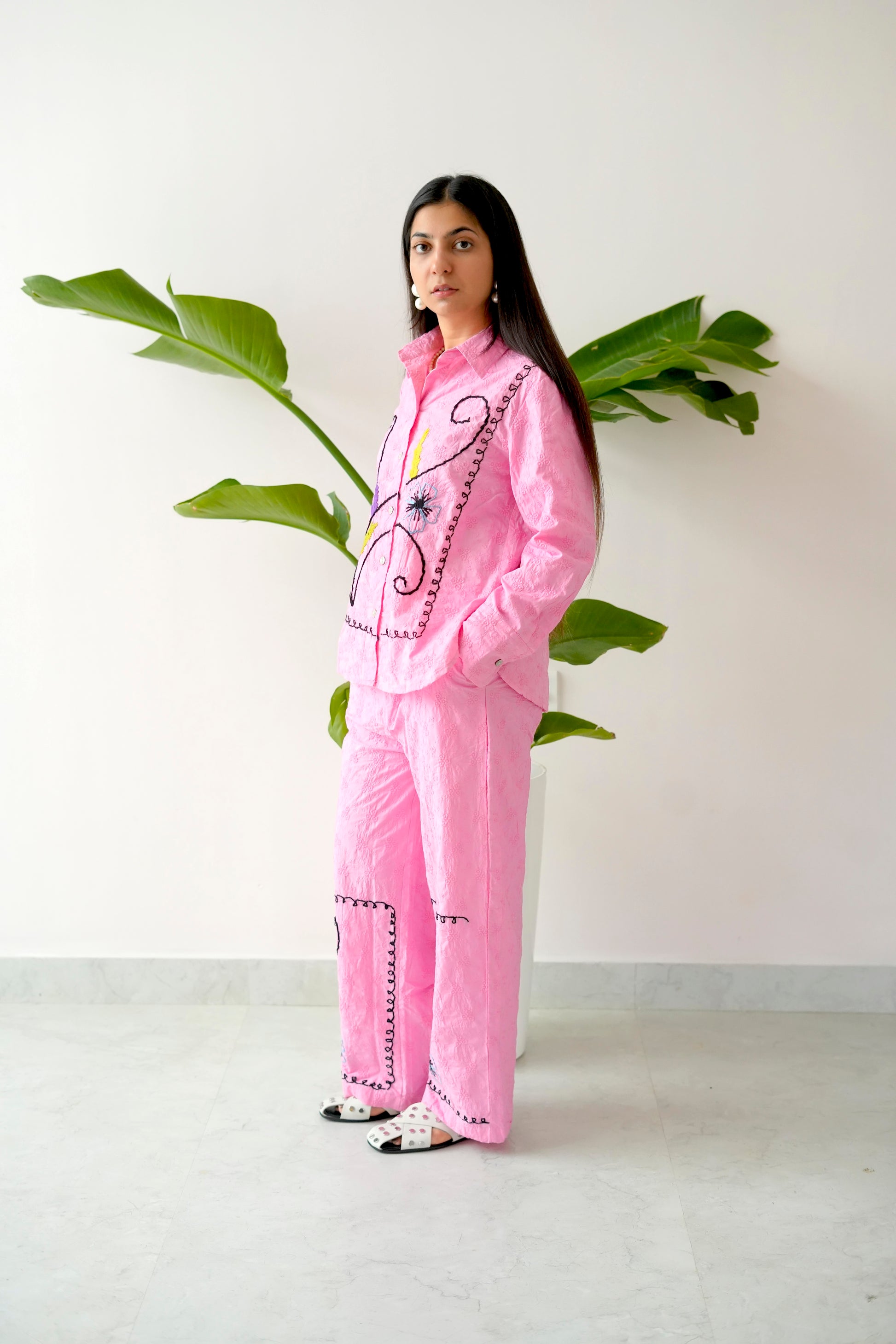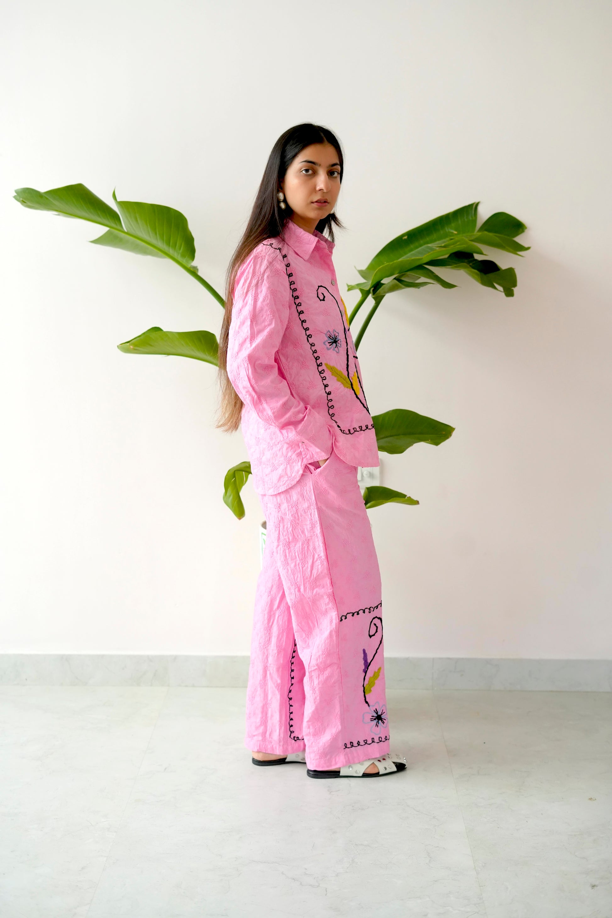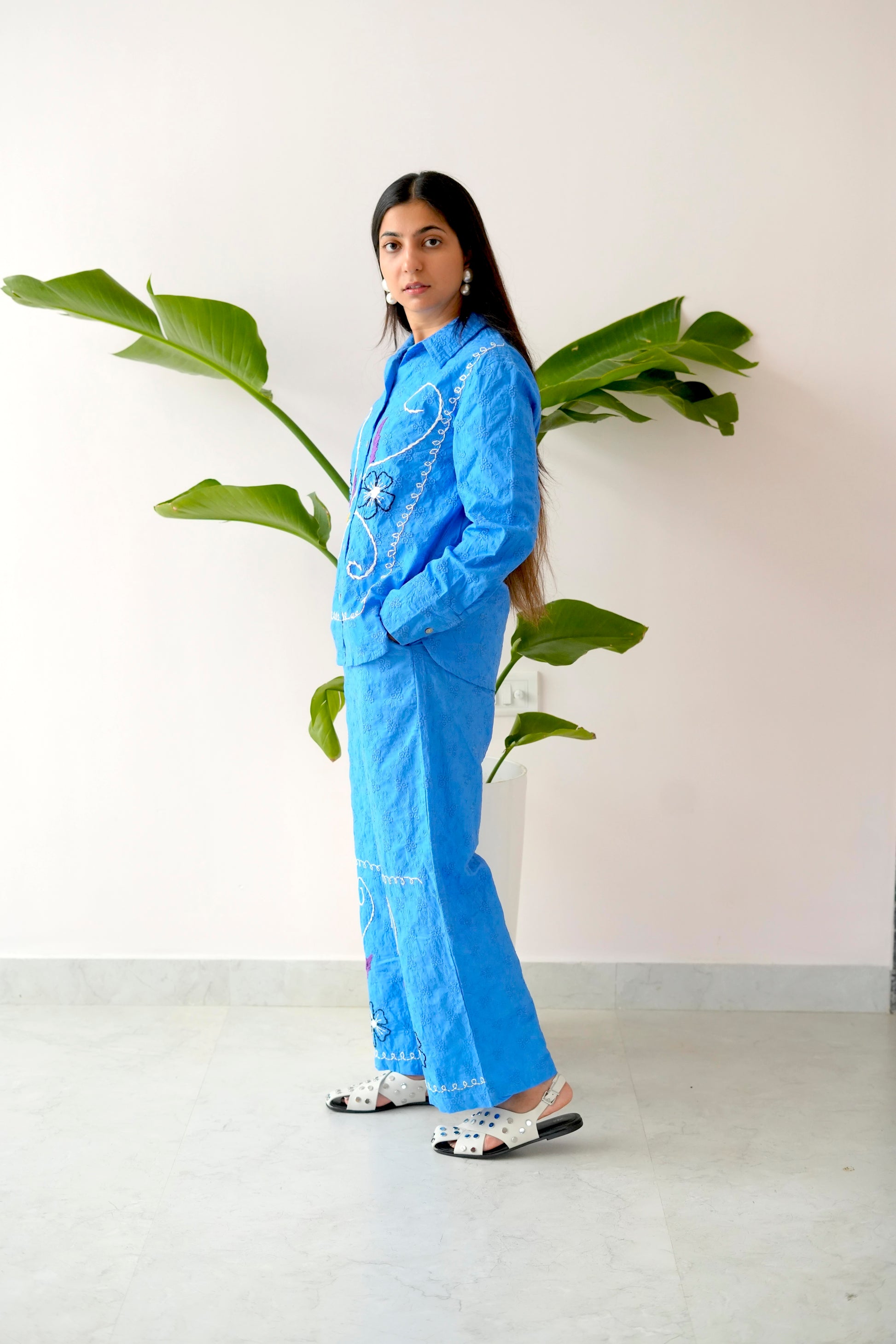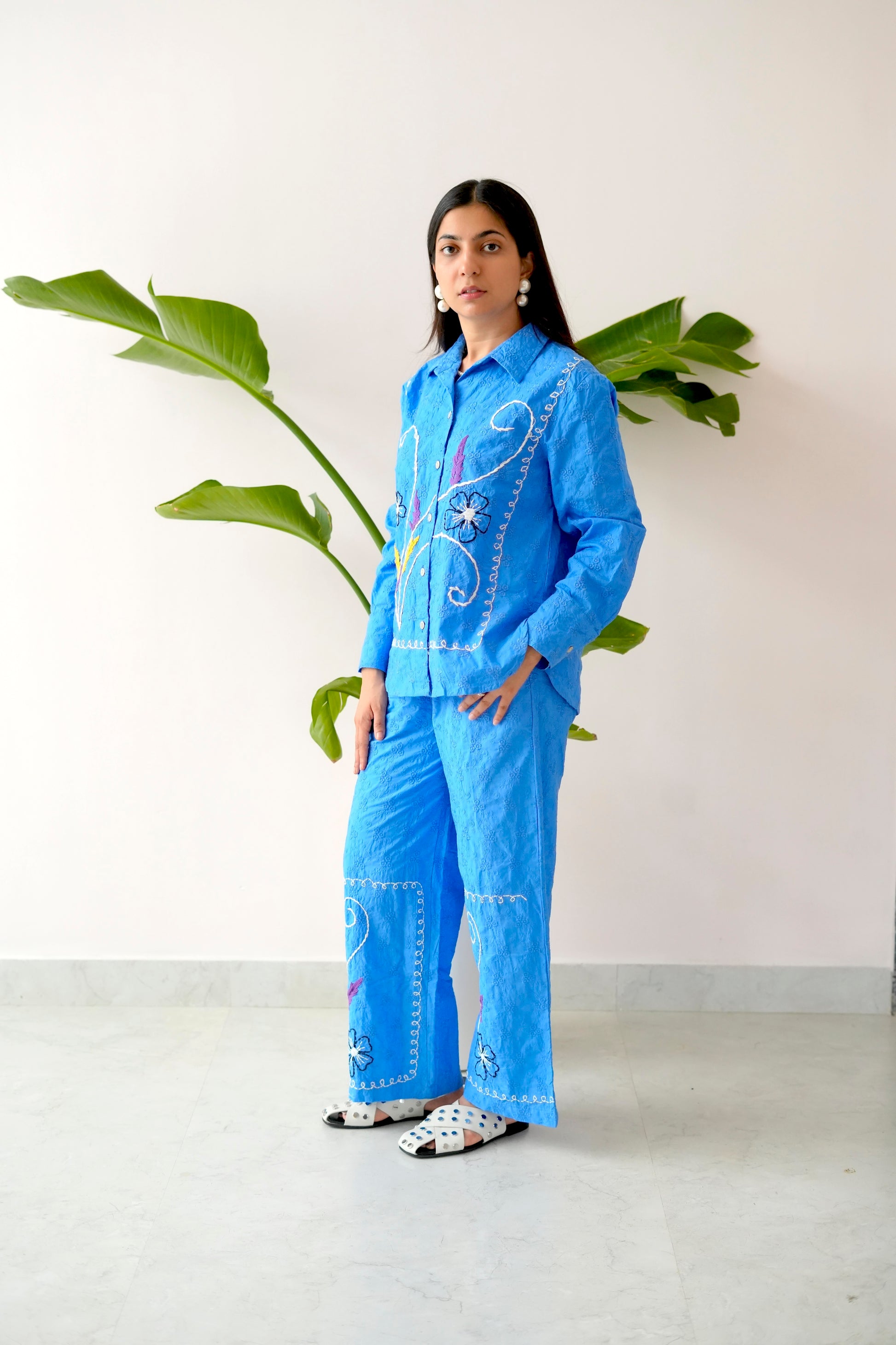 Made from lightweight textured cotton fabric, the set features a front-button shirt with a structured collar, adorned with vibrant hand-inspired embroidery. The pants are equally striking, with symmetrical floral motifs and swirling patterns that elevate the design into wearable art.