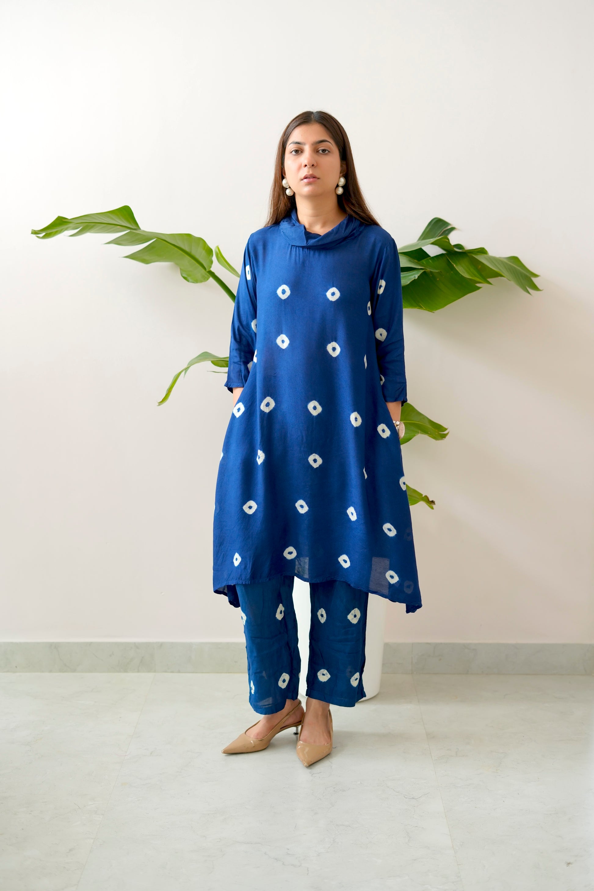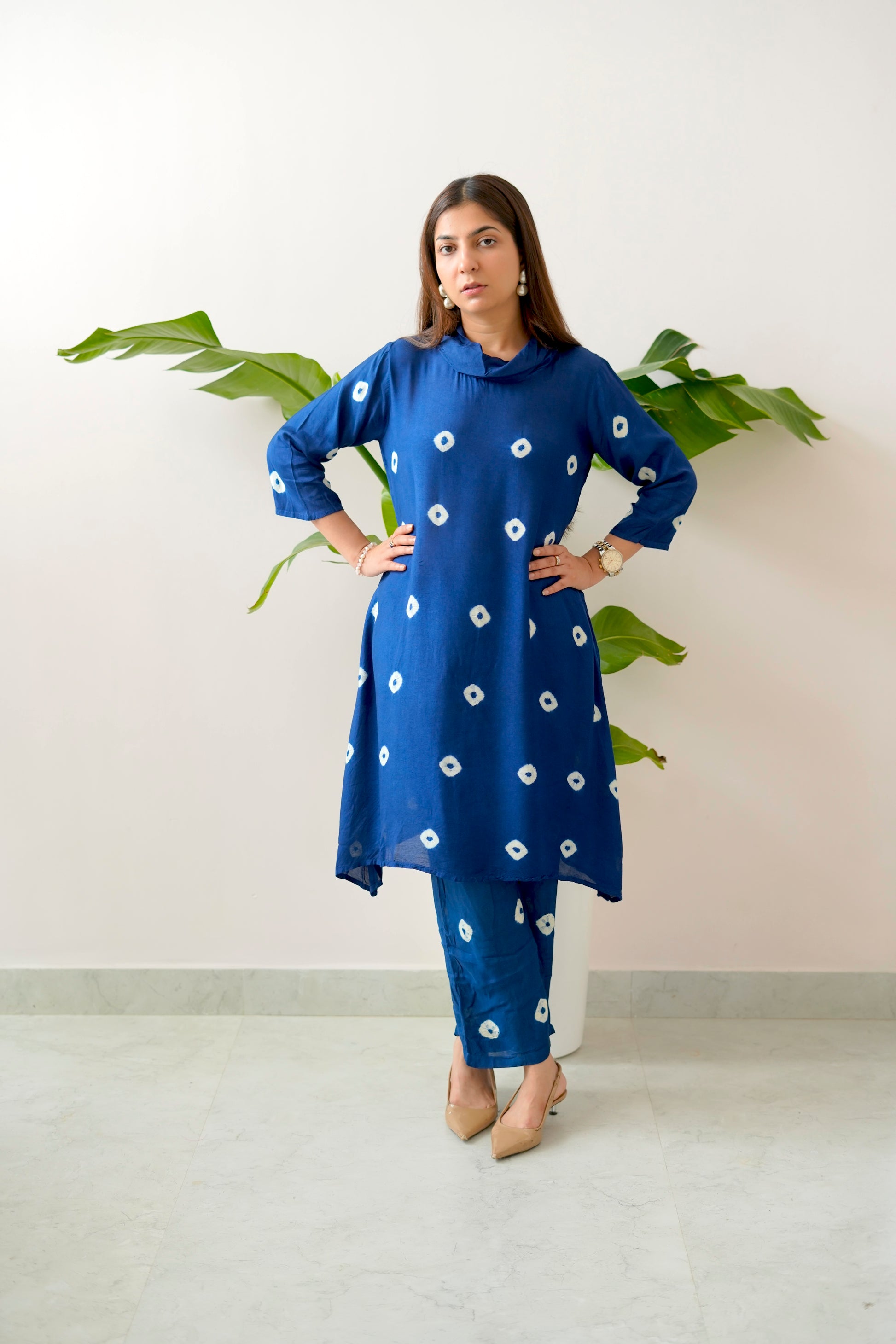 Crafted from soft, breathable cotton, Bandez features a relaxed-fit kurta with a chic cowl neckline and 3/4 sleeves. The bold hand-block-inspired dotted pattern adds a playful twist, while the matching straight pants complete the coordinated, put-together look.