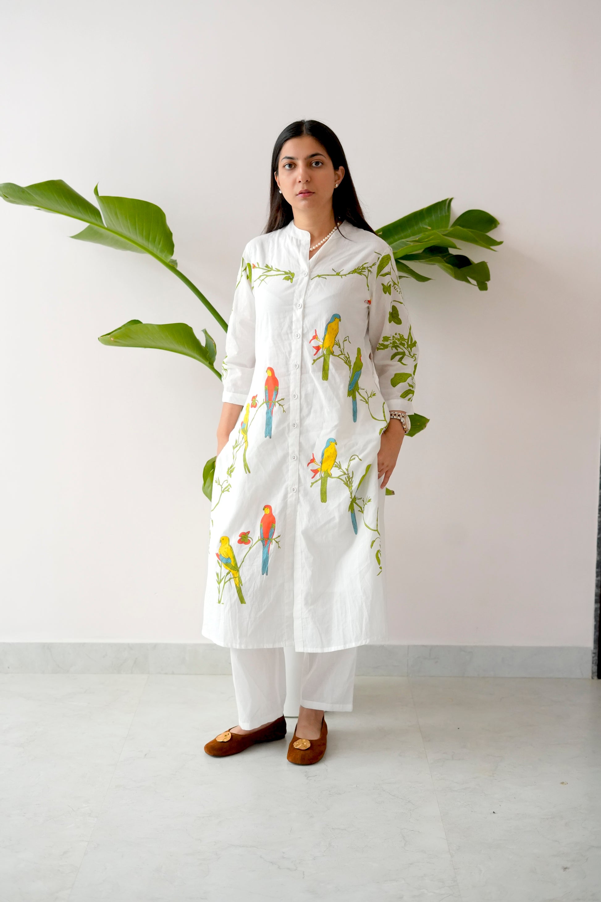 Elevate your everyday style with the Betu Coord Set, a refreshing blend of comfort and charm. Crafted from soft, breathable cotton, this white kurta and pant set features vibrant, hand-painted bird and floral motifs that bring a burst of color and nature-inspired beauty to your wardrobe.