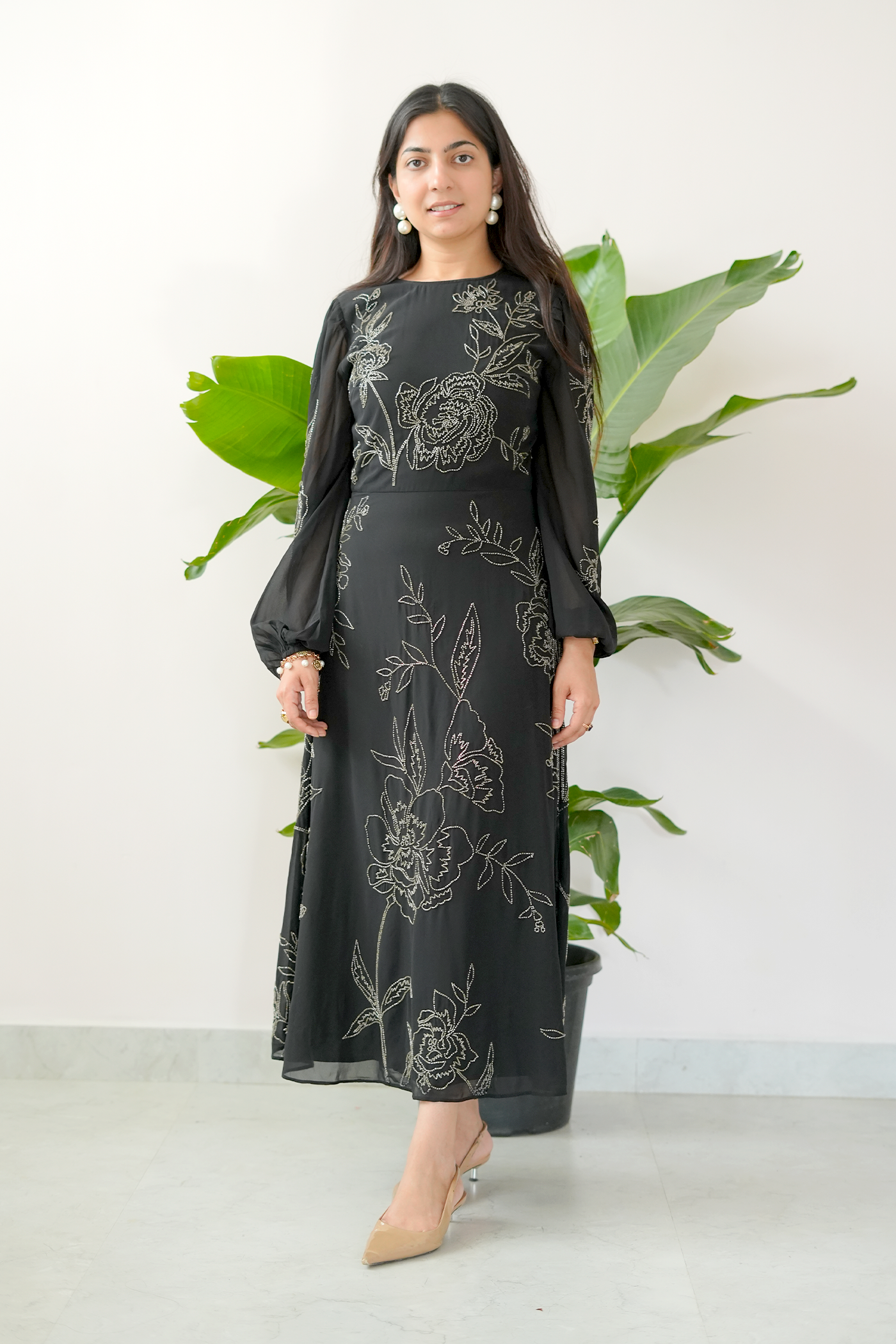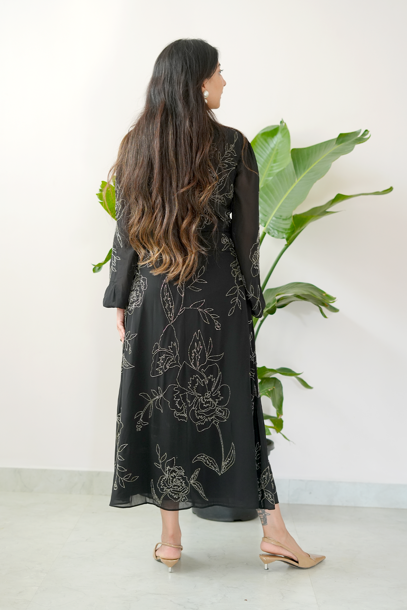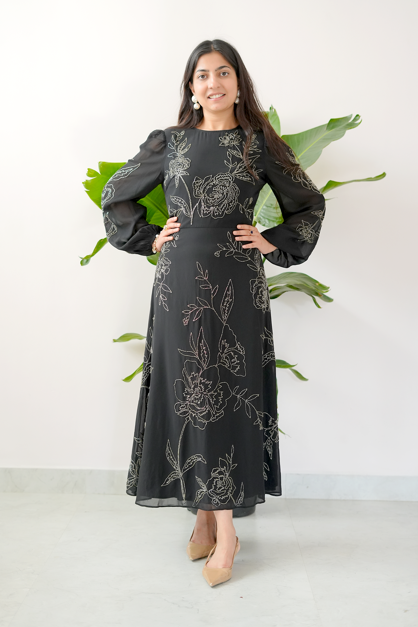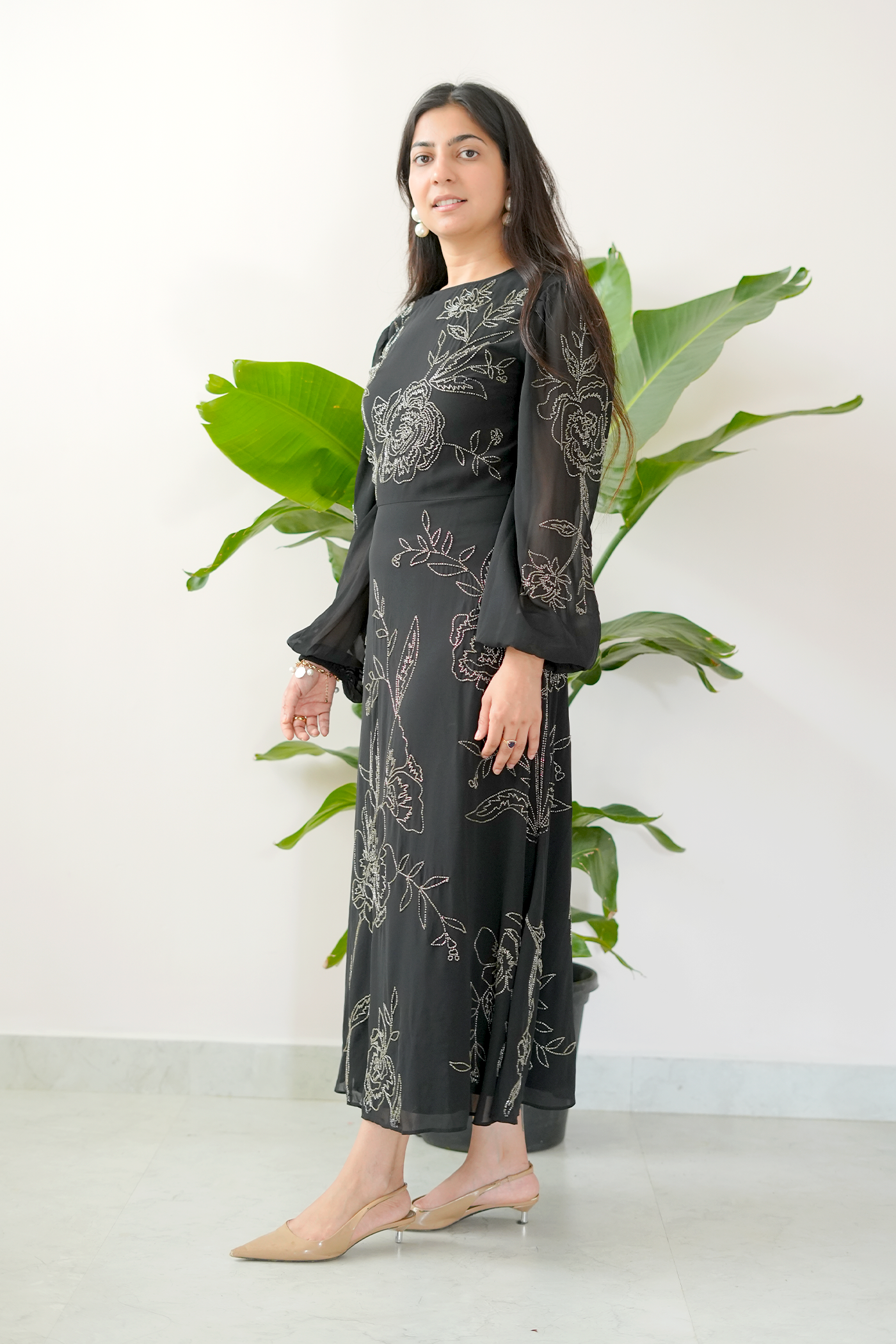 Minimal effort, maximum elegance – meet the Blacksome Dress, where flow meets form in the most graceful way. This black flowy midi is embellished with fine silver floral embroidery that adds depth without overpowering your look.