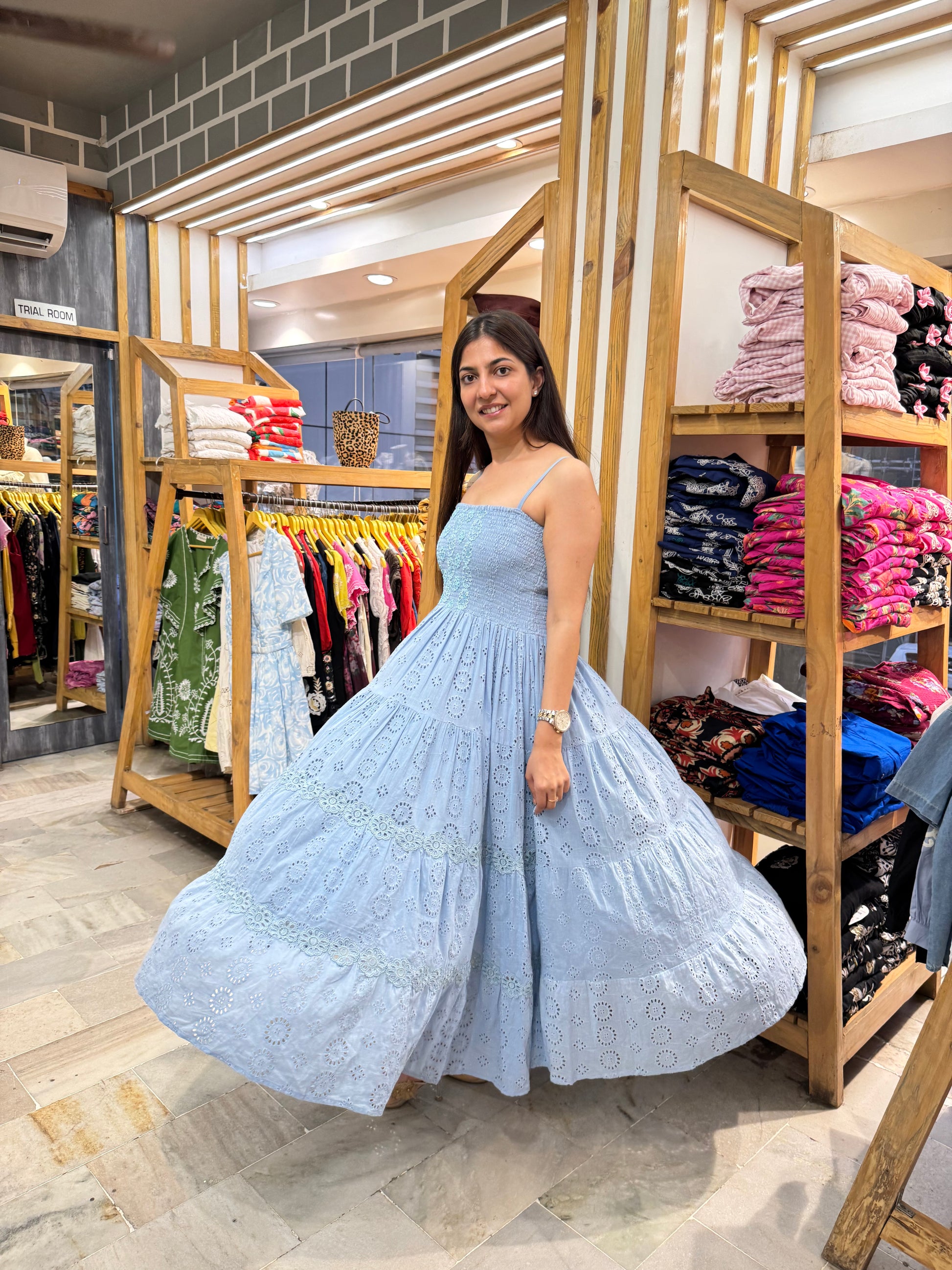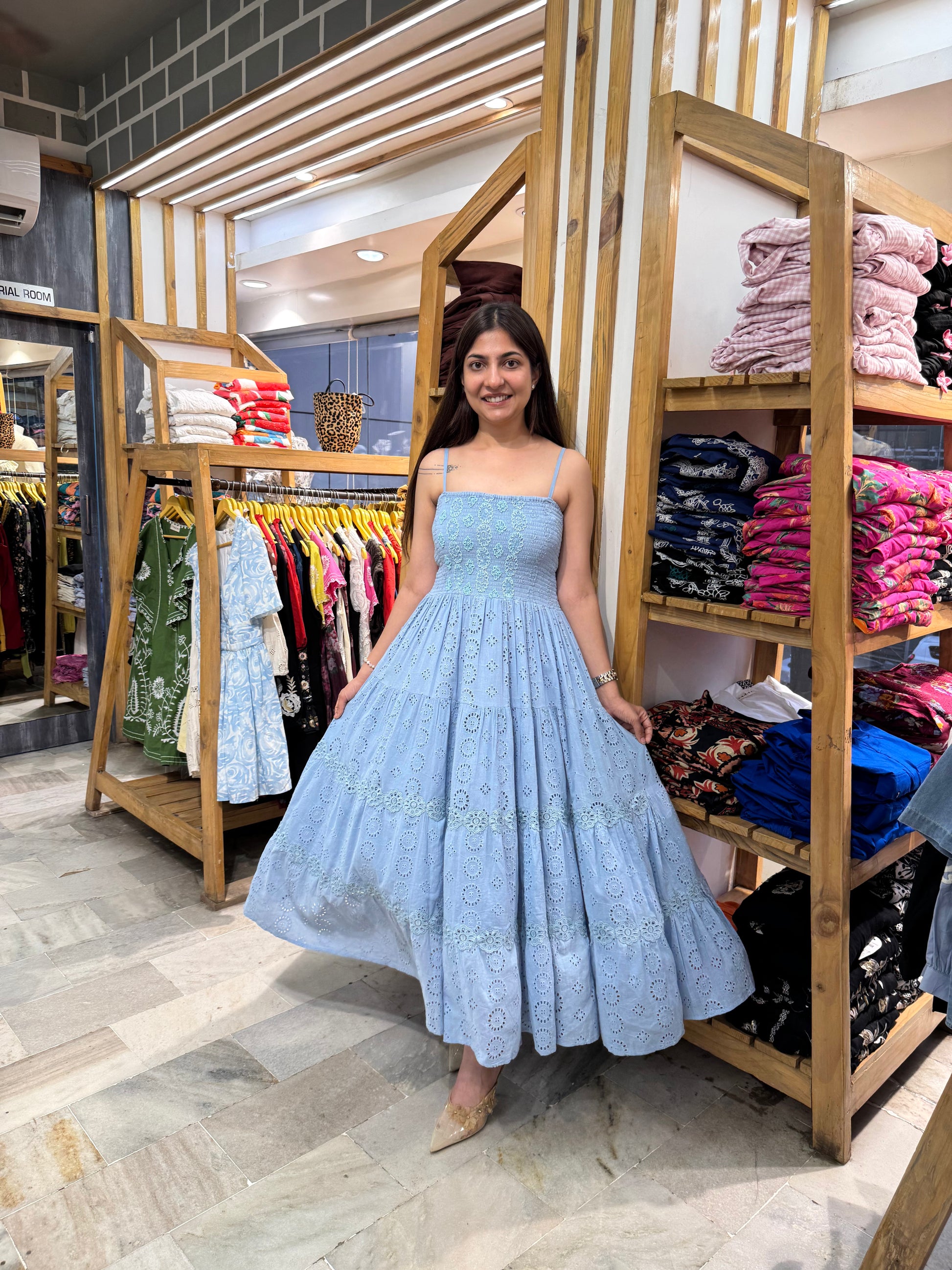 Say hello to Blue Heaven, the dress that feels like a soft summer breeze and looks like a daydream. With its sky-blue hue and intricate eyelet embroidery, this piece is made for making memories—from garden parties to weekend wanderings.