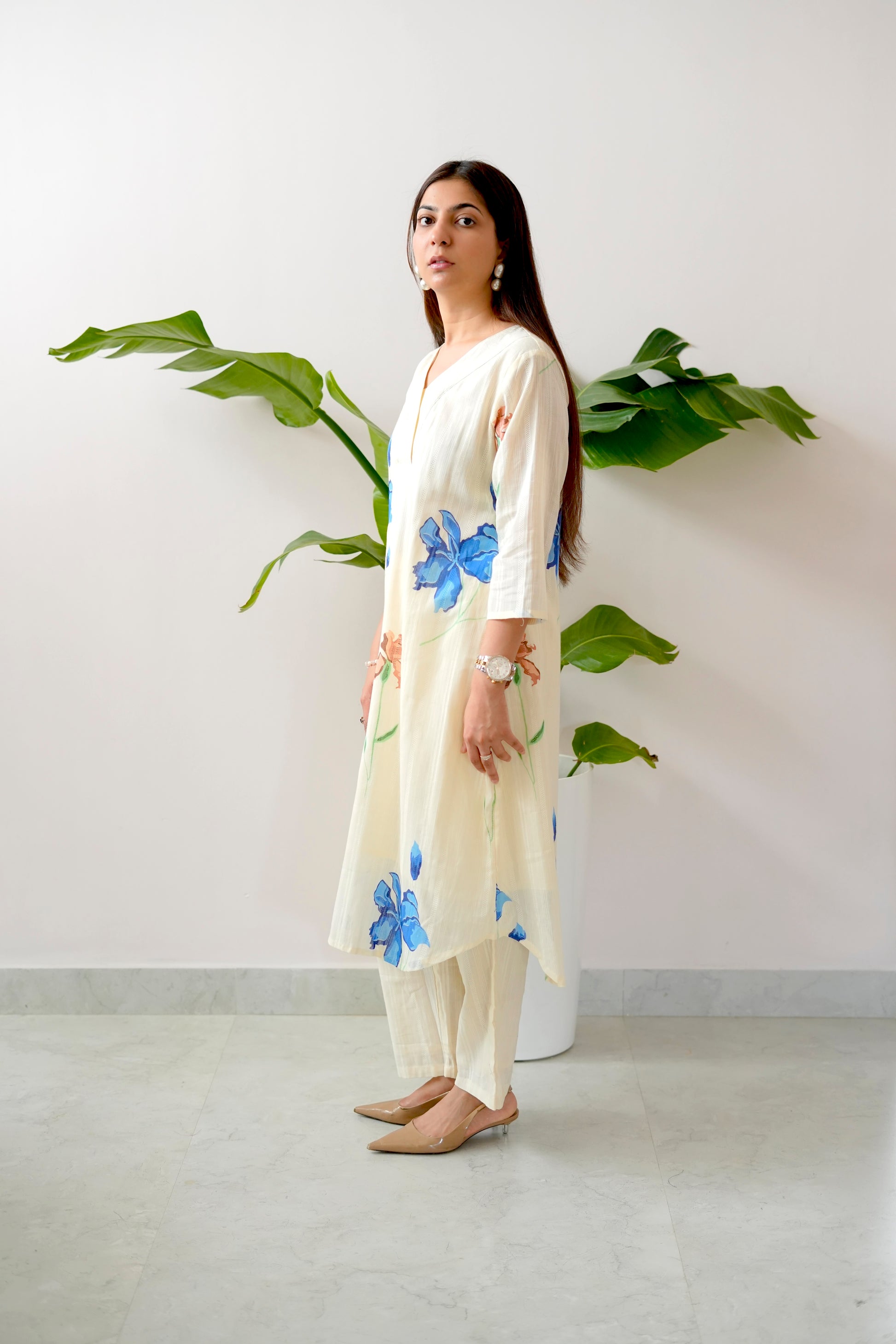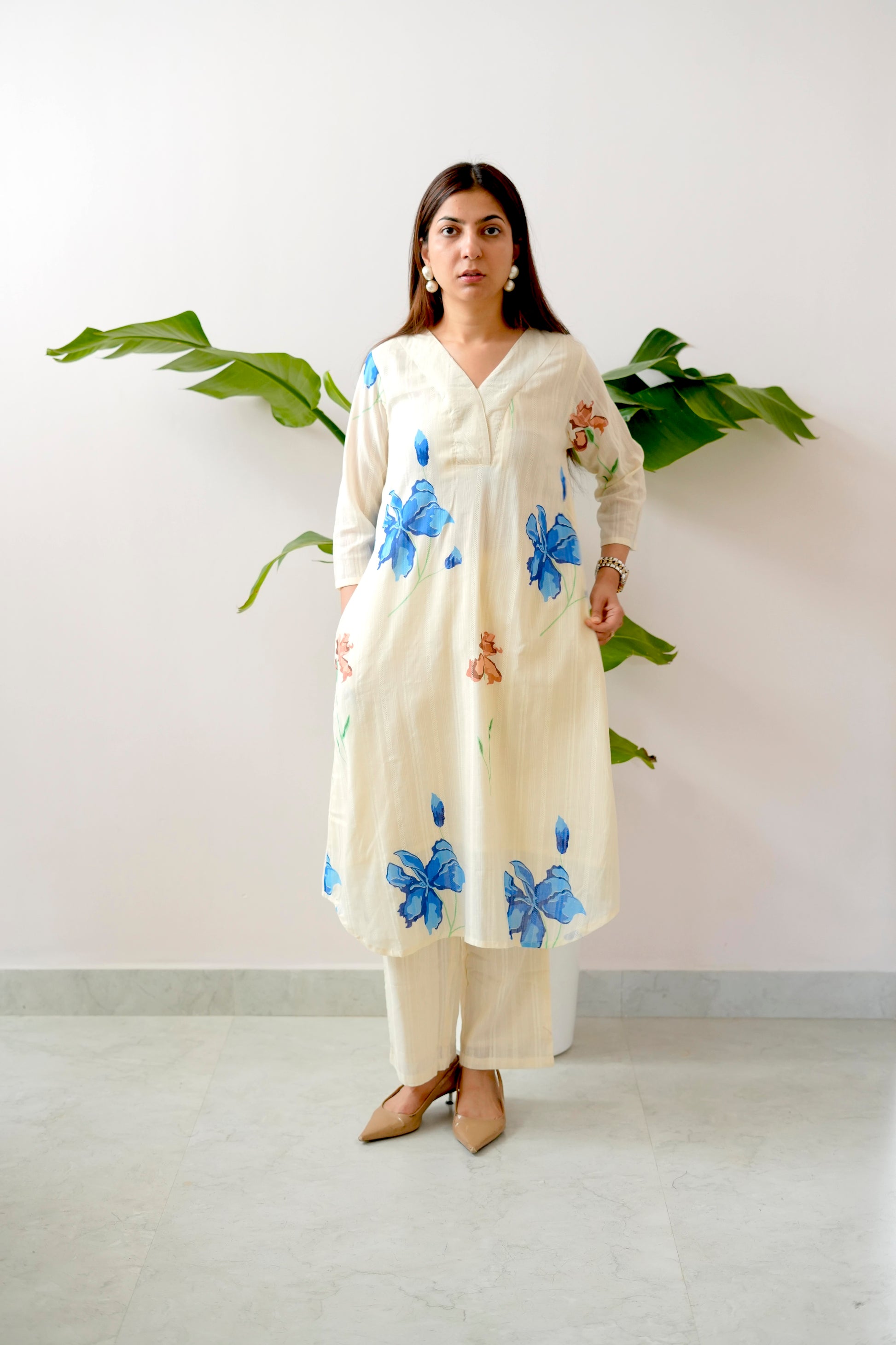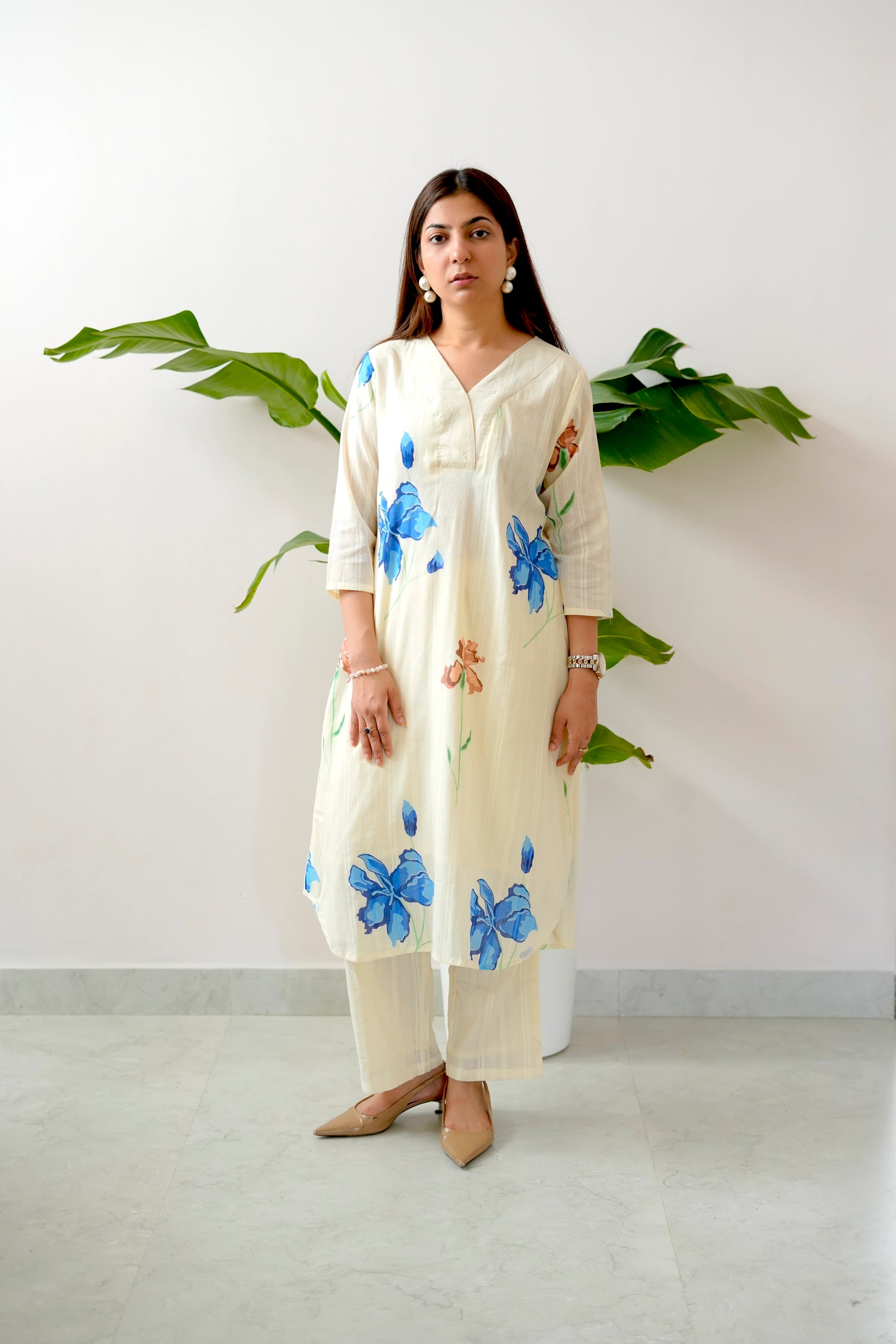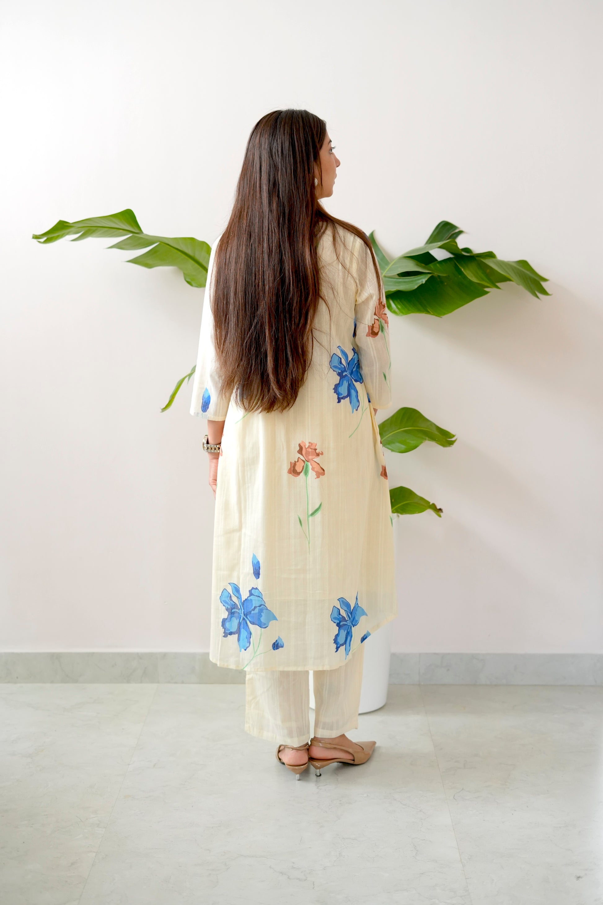 Step into effortless sophistication with the Blue Slue Coord, where floral elegance meets breathable comfort. This two-piece set features a relaxed kurta and straight pants in a soft ivory base adorned with hand-painted style blue and peach floral prints — giving you a fresh, serene look for any occasion.