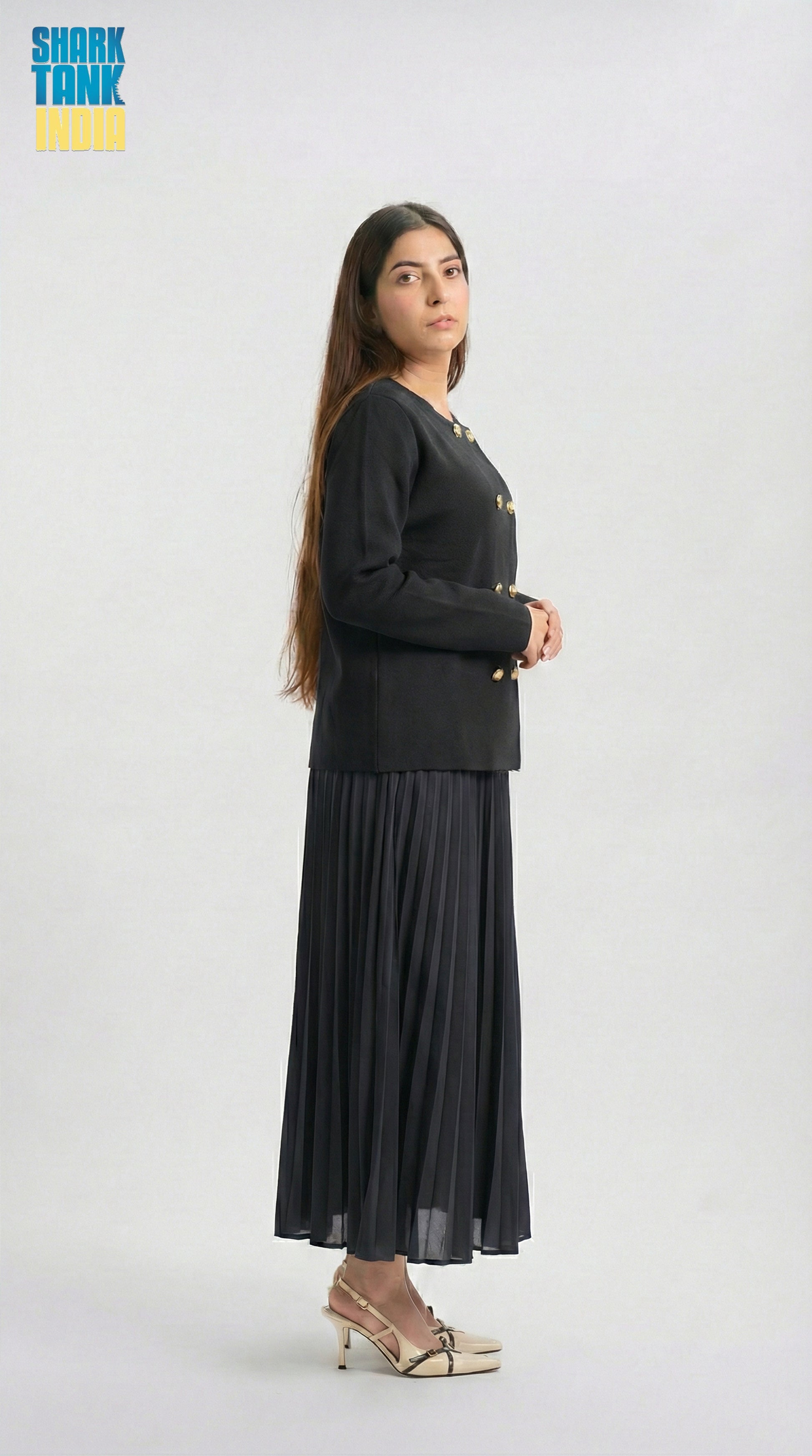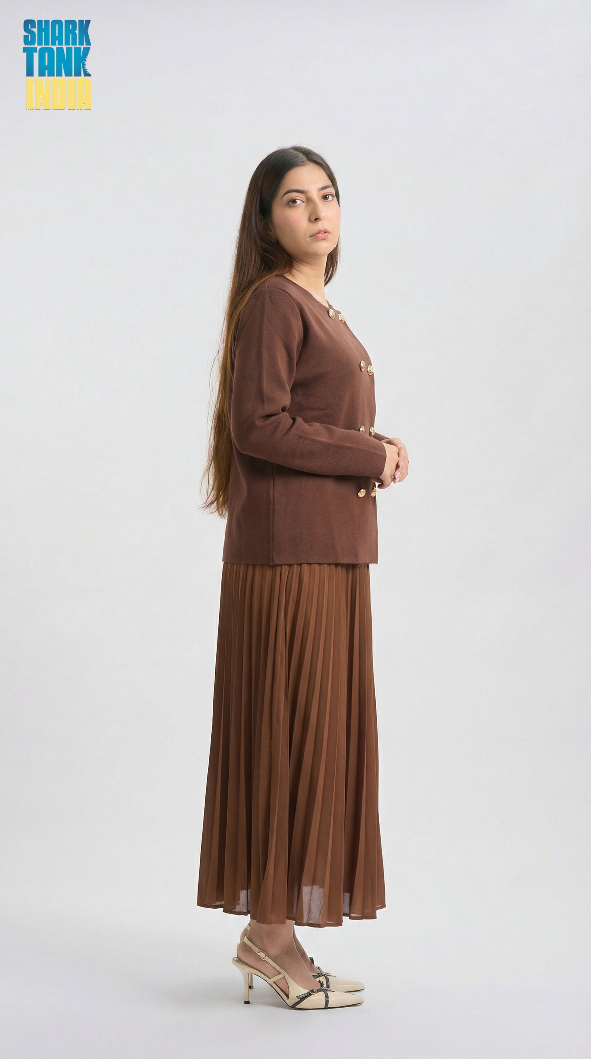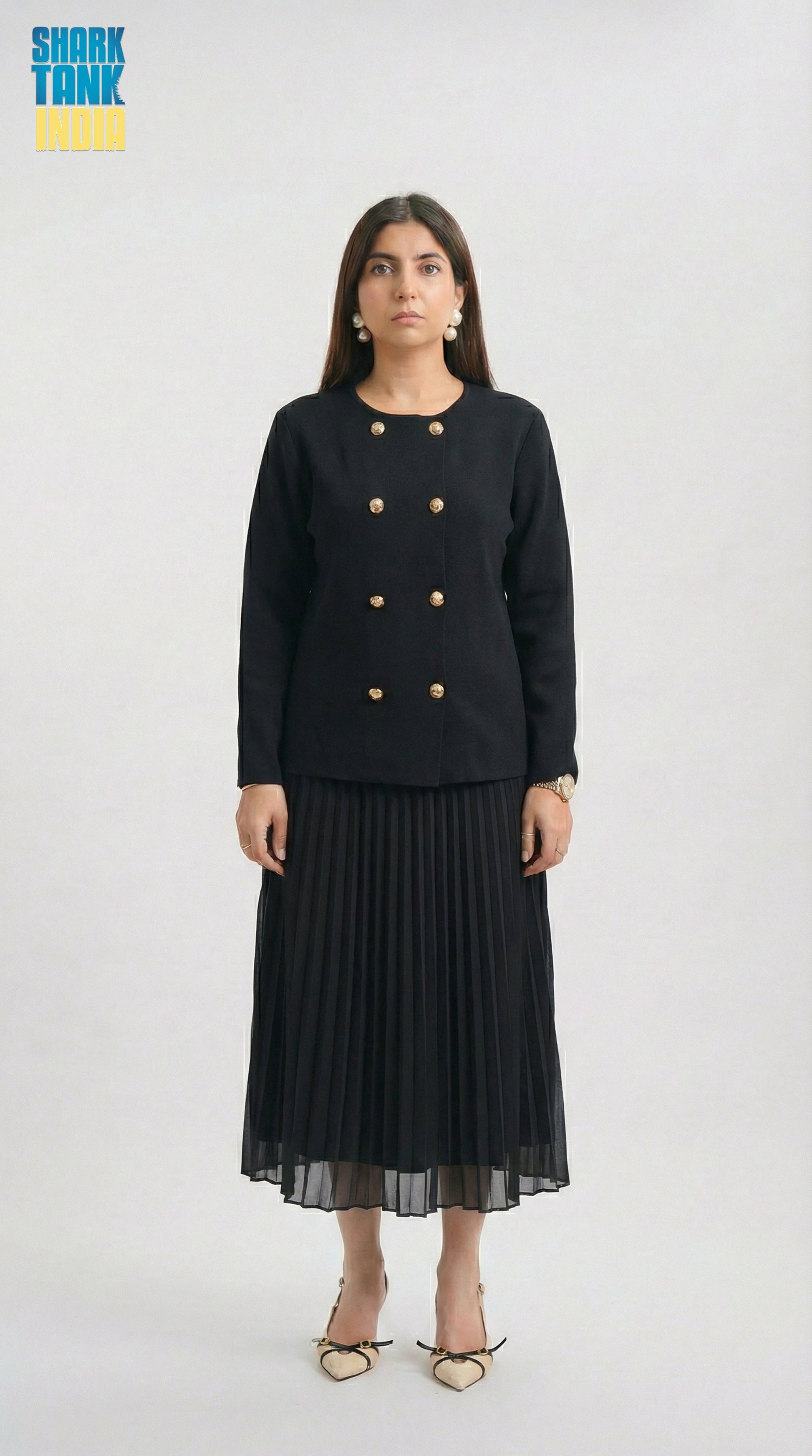 The set features a structured round-neck top adorned with statement gold buttons, paired beautifully with a flowy pleated midi skirt.