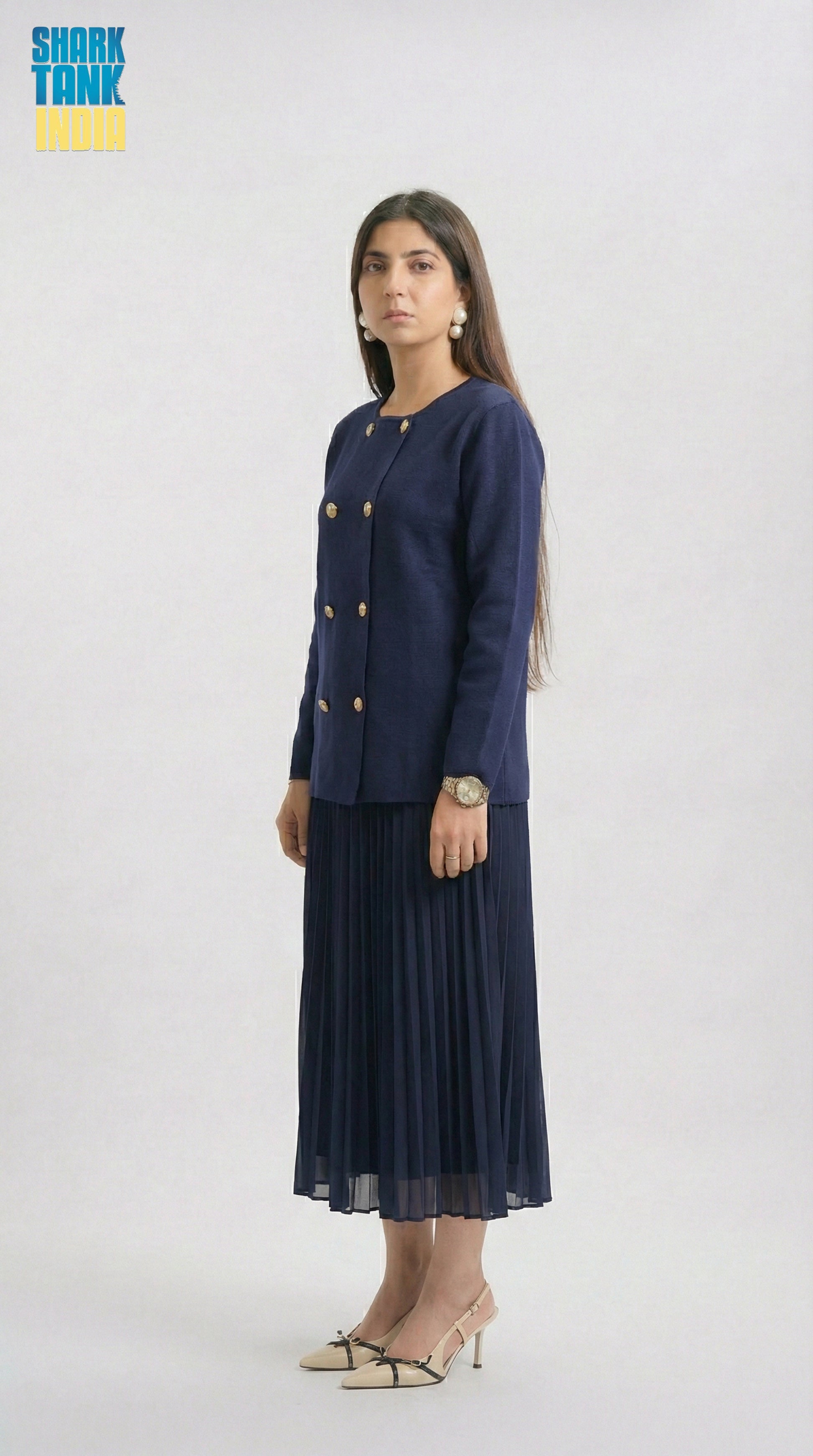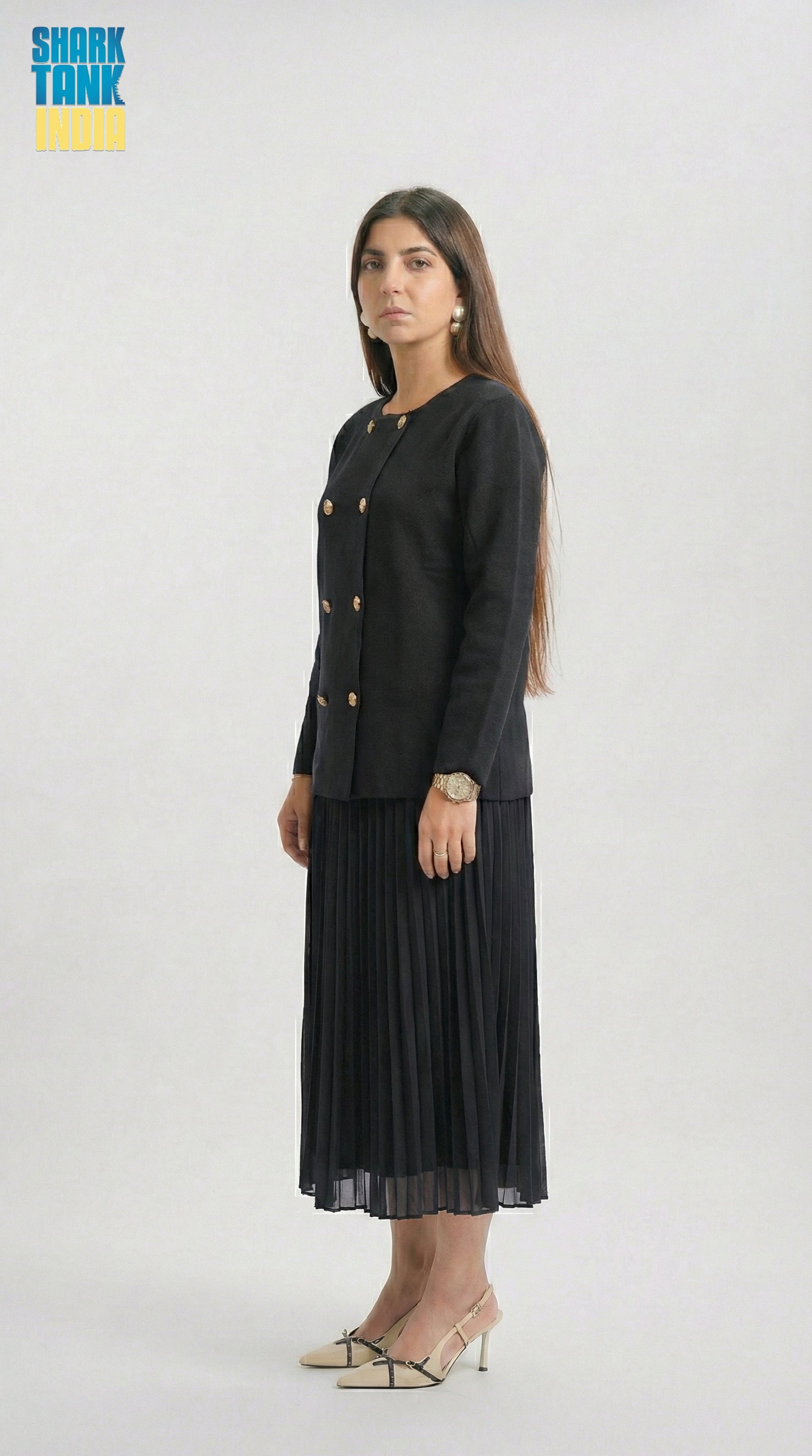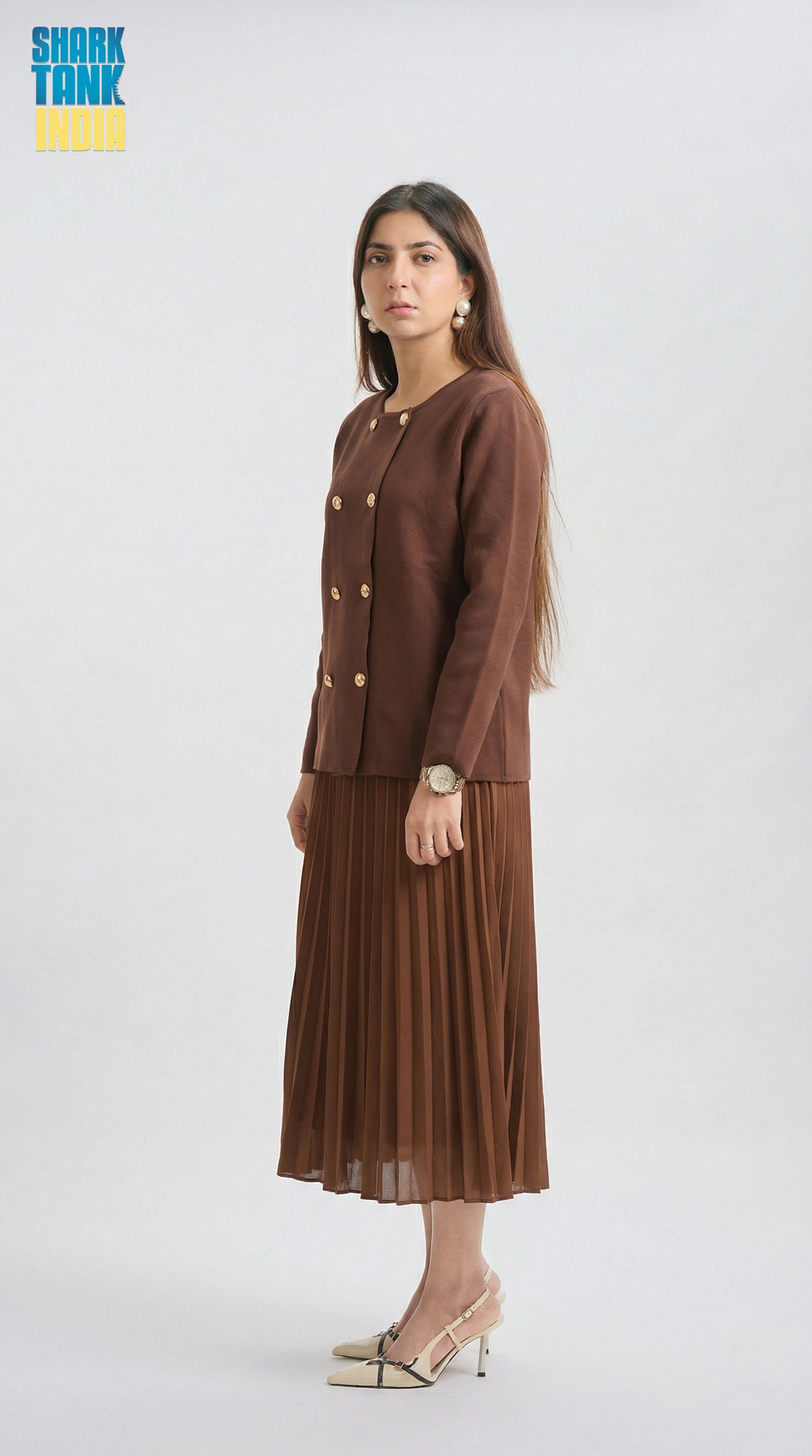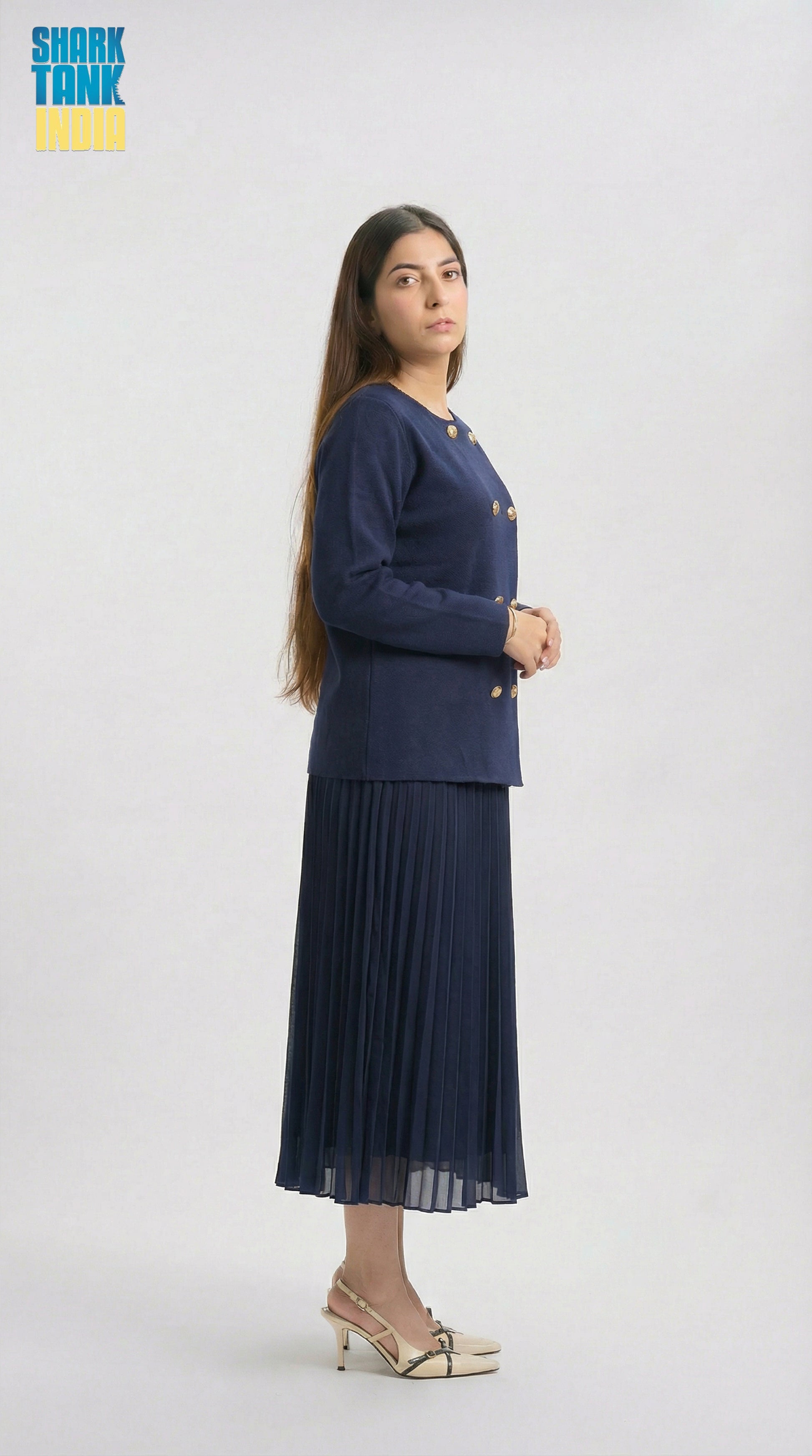 The best part? You can style both pieces separately — wear the top with trousers or denim for a sharp formal look, or pair the pleated skirt with blouses and knits for effortless elegance.