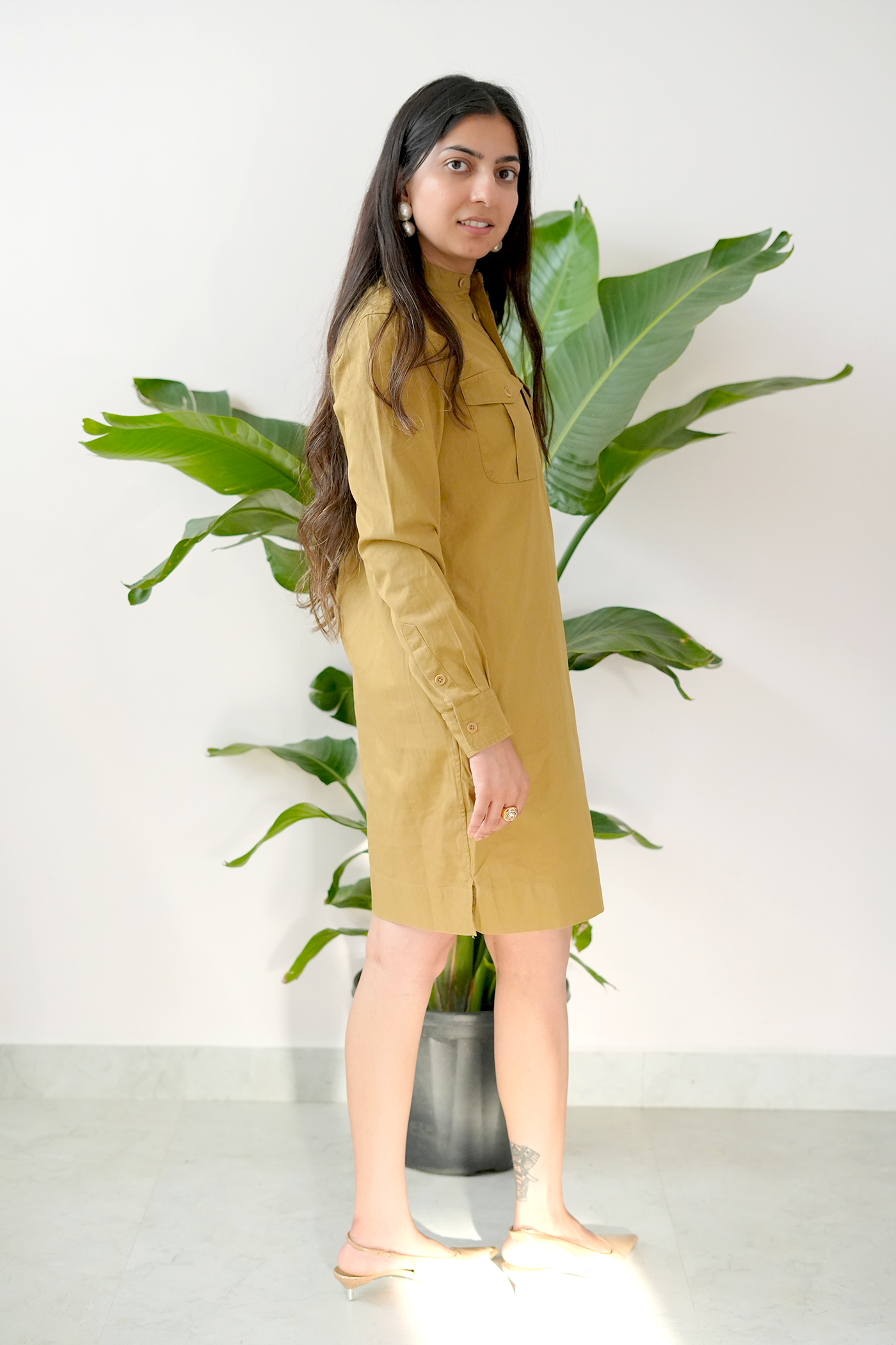 Effortlessly refined and quietly confident – meet the Caption Dress, where minimalism meets utility in the most stylish way. This muted mustard shirt dress is a tribute to clean lines and modern tailoring, making it your go-to for smart-casual occasions.