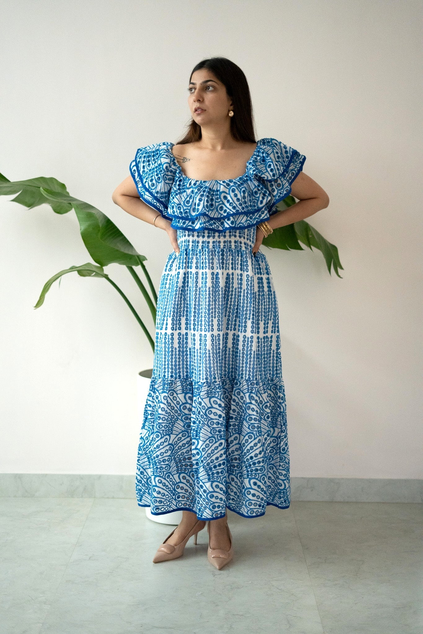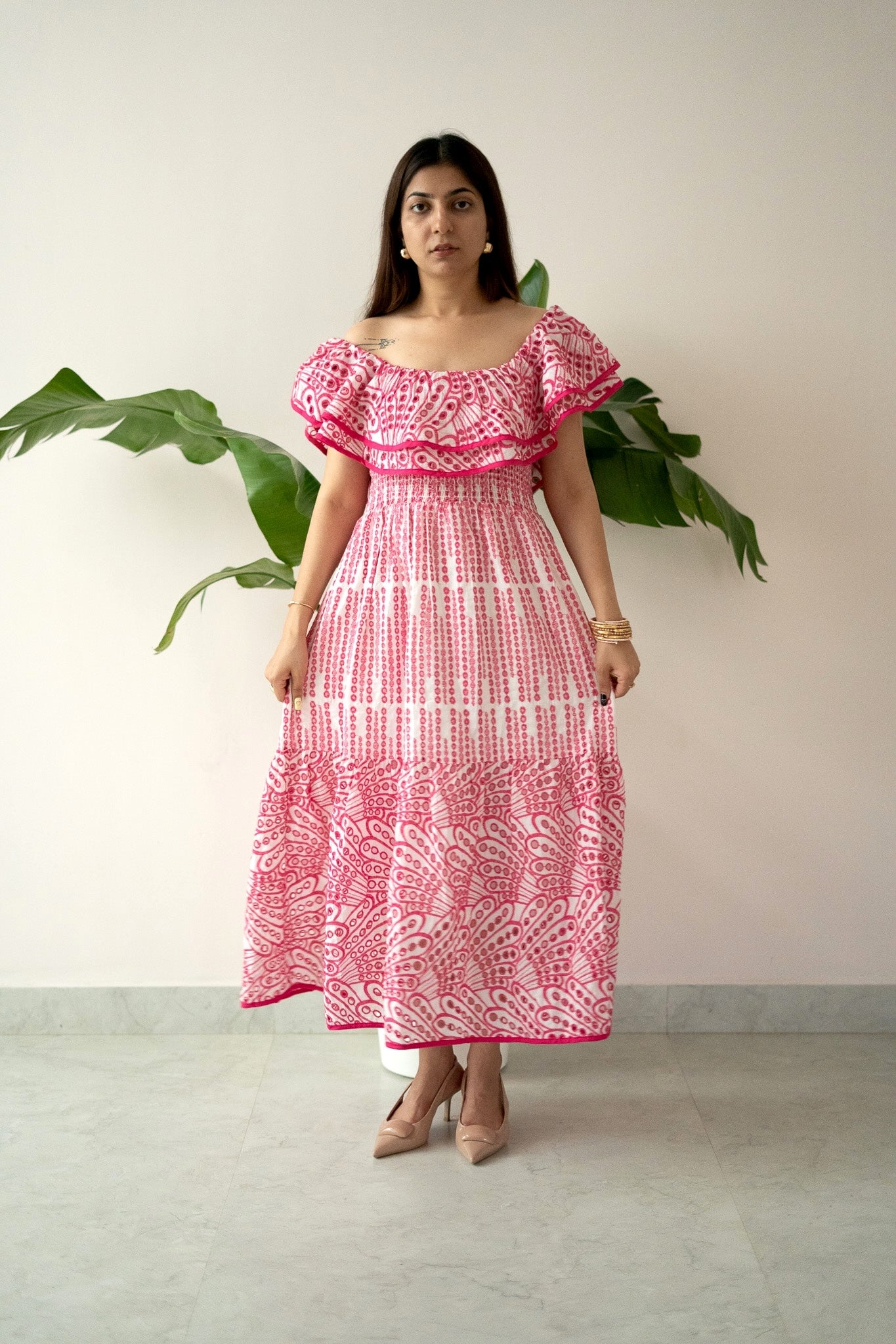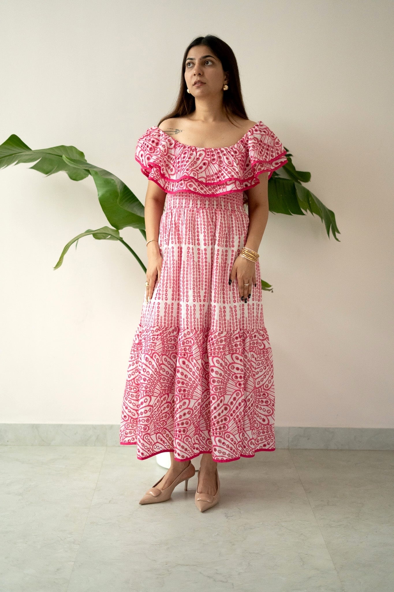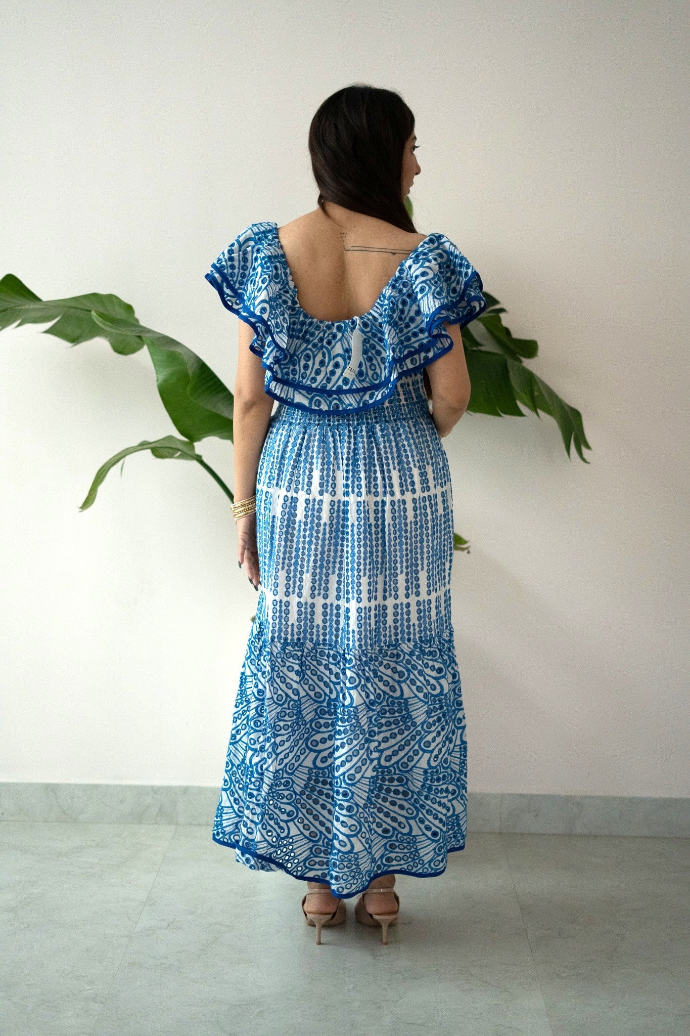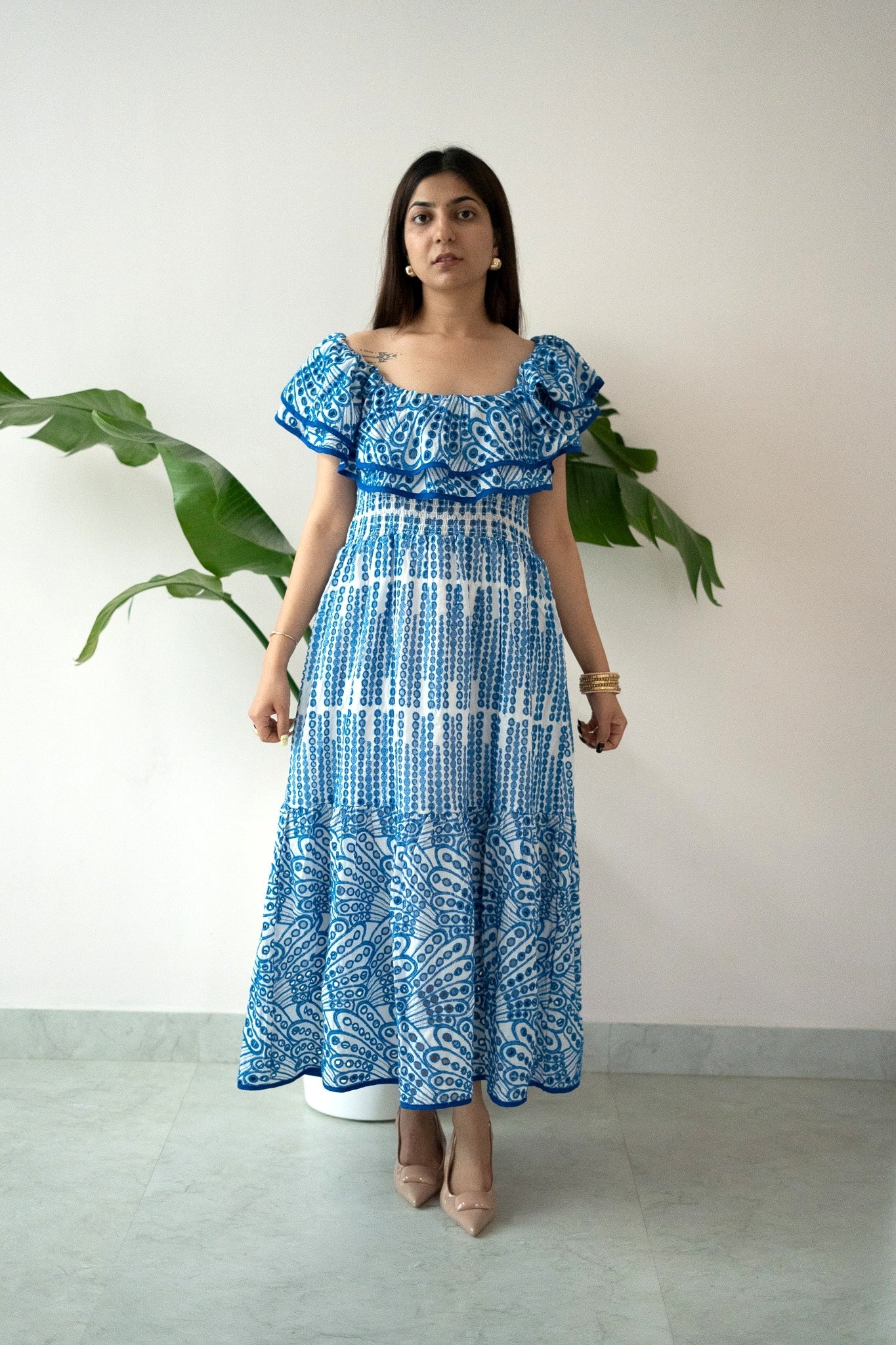 Crafted from a soft, breathable cotton-blend fabric, it features a flattering smocked waist and a tiered skirt that flows gracefully with every step. The statement ruffled neckline adds a touch of romance, making it perfect for brunches, vacations, or festive gatherings.