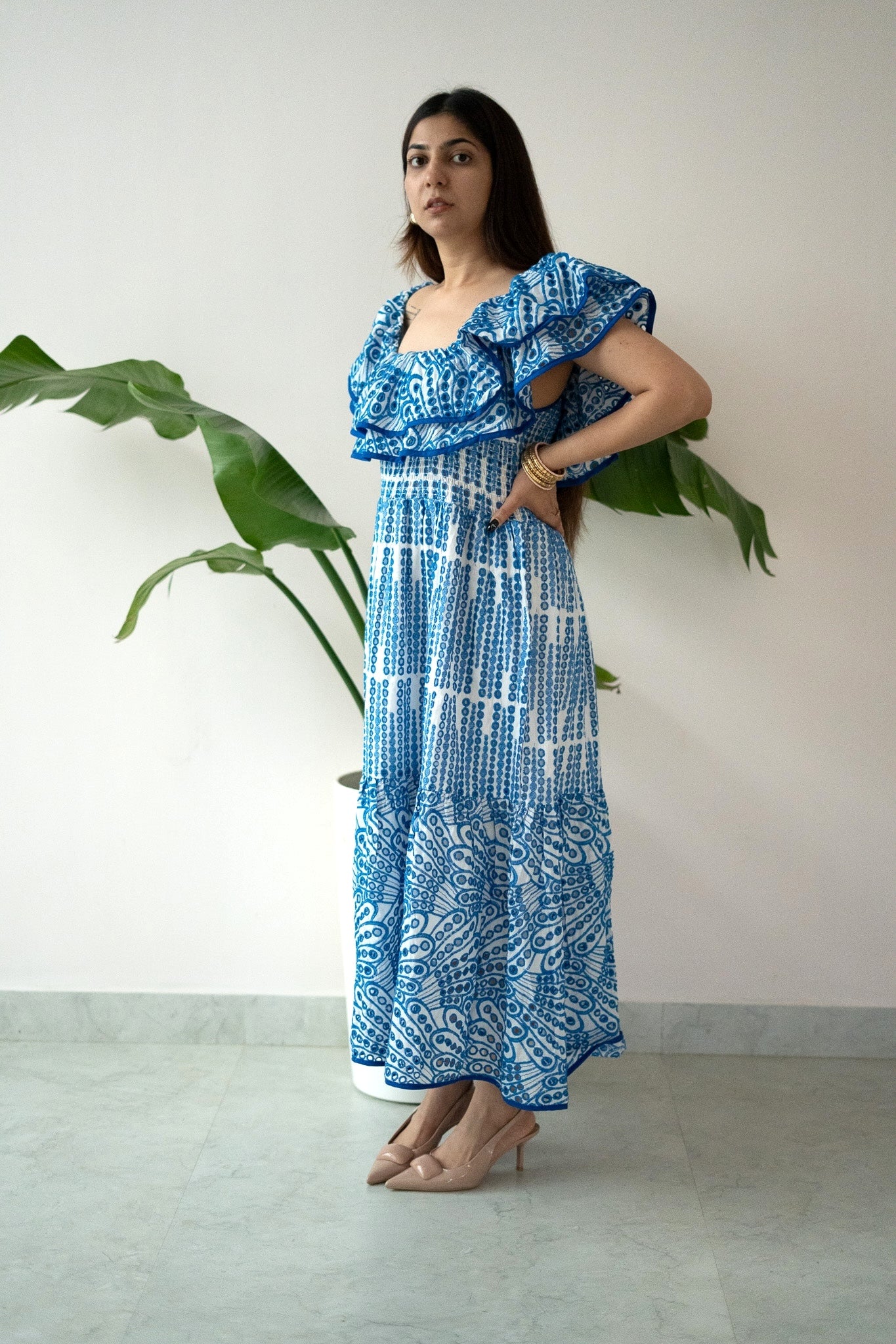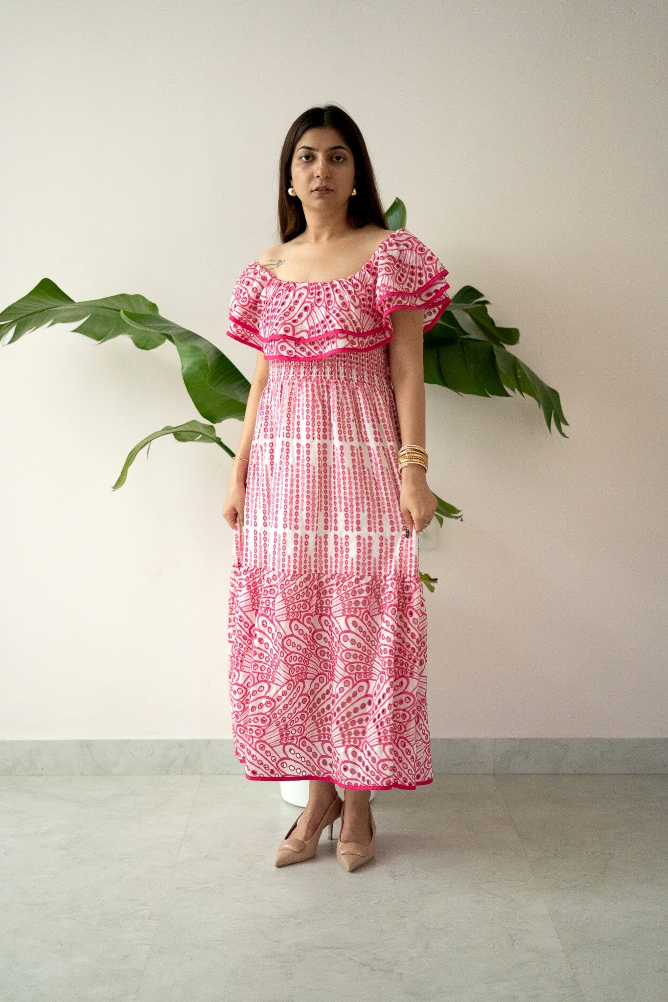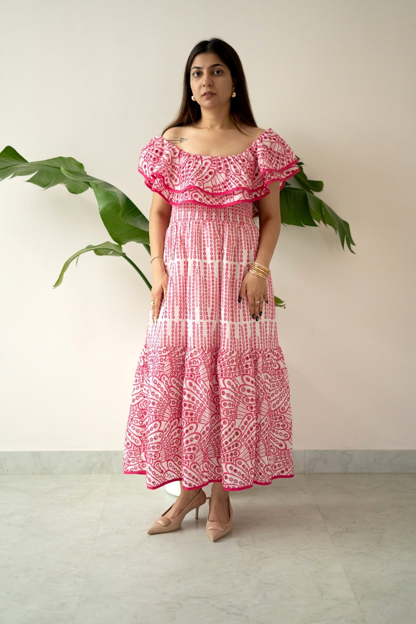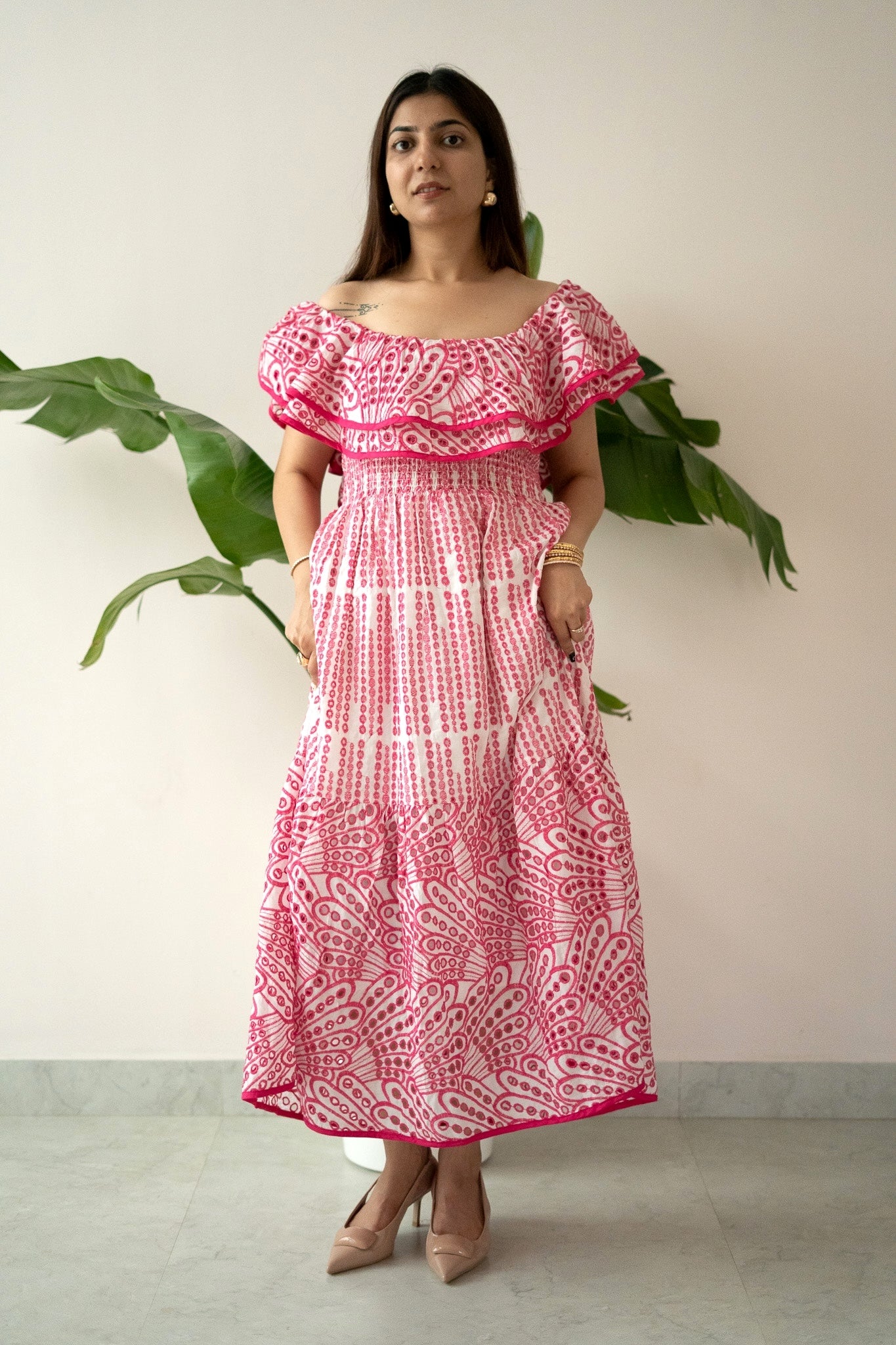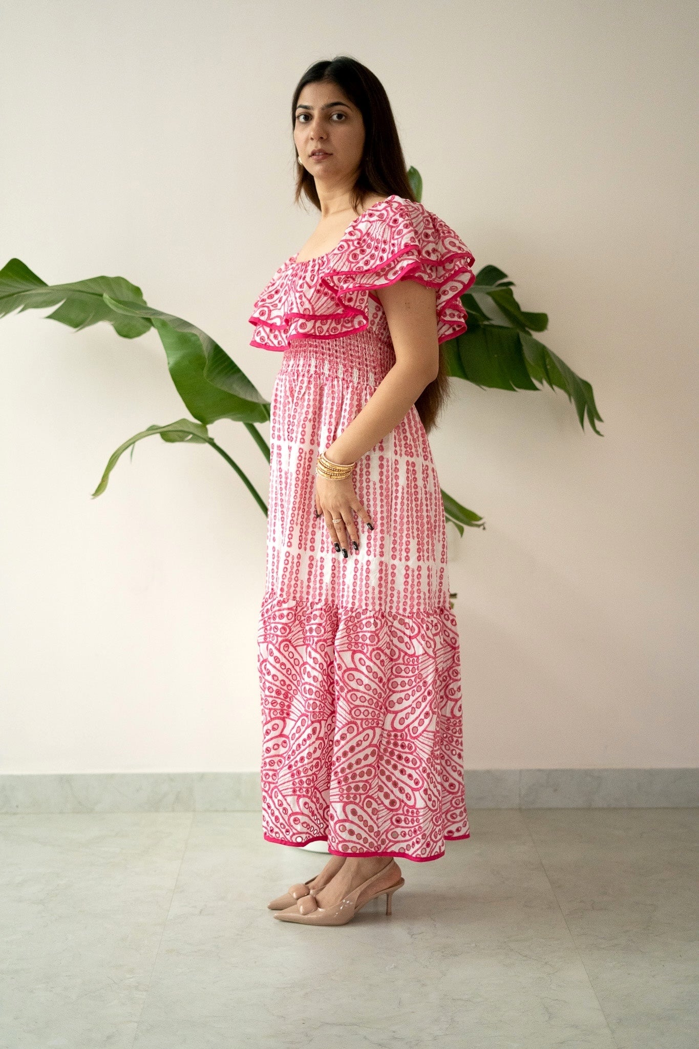 Crafted from a soft, breathable cotton-blend fabric, it features a flattering smocked waist and a tiered skirt that flows gracefully with every step. The statement ruffled neckline adds a touch of romance, making it perfect for brunches, vacations, or festive gatherings.