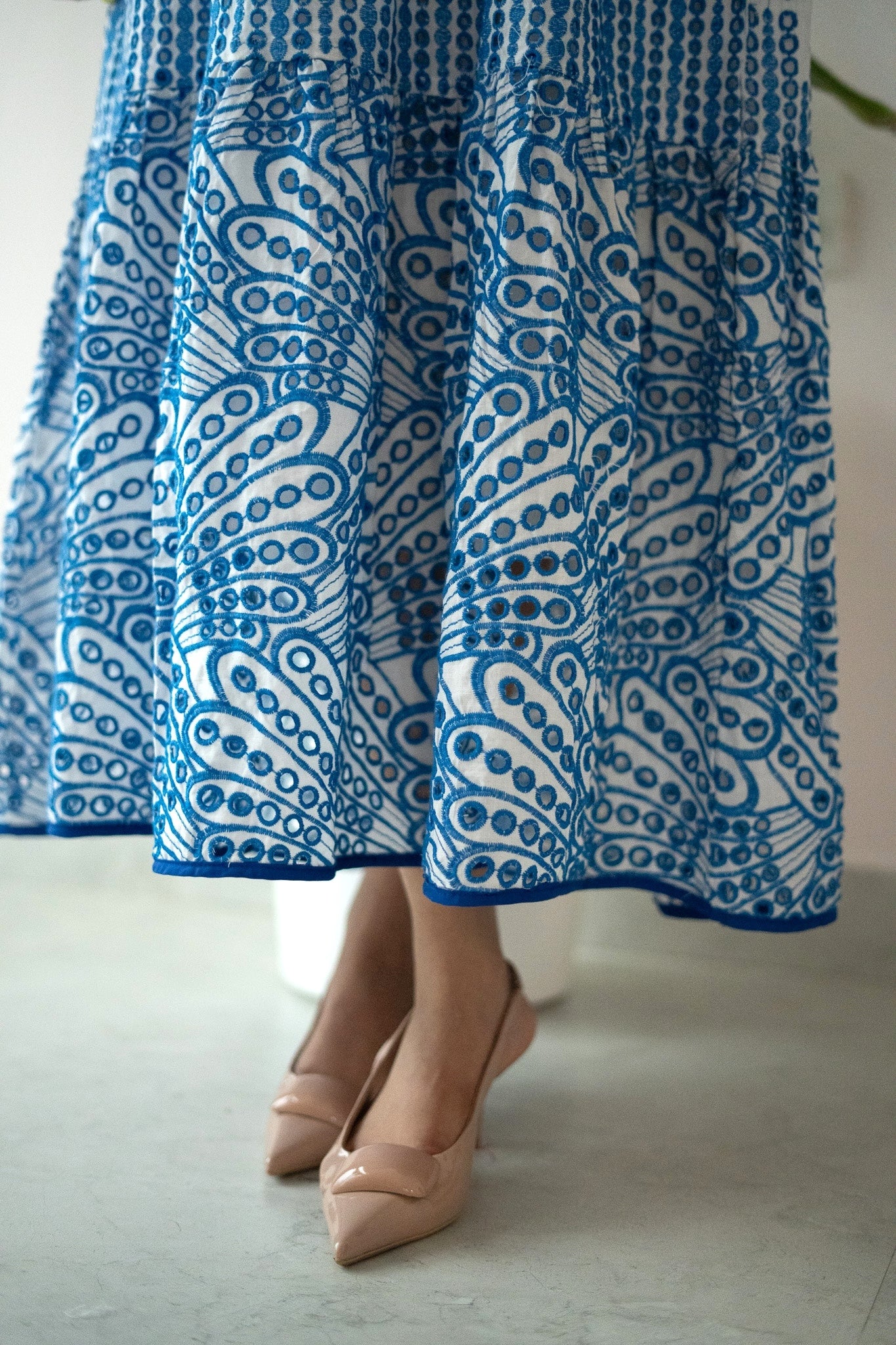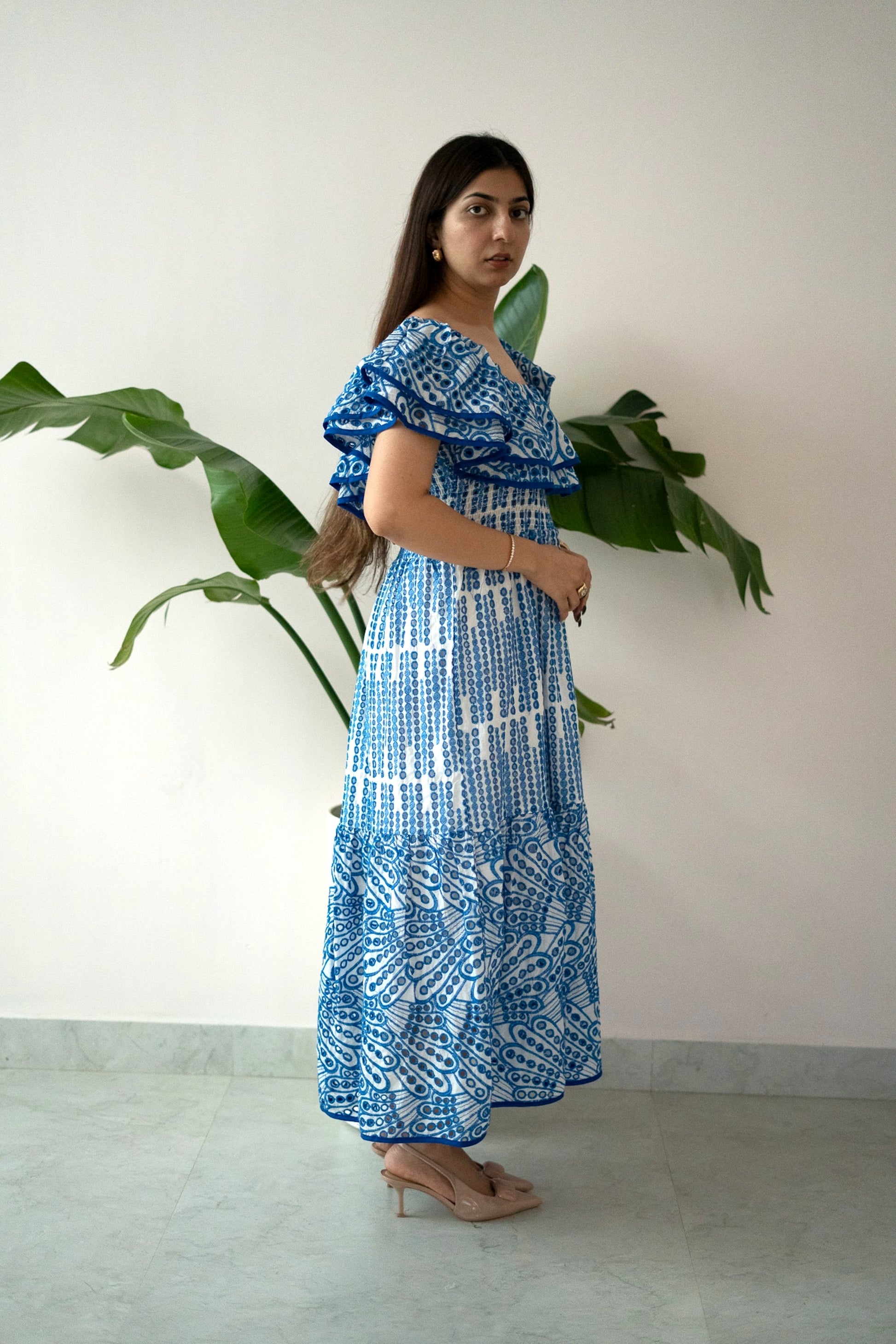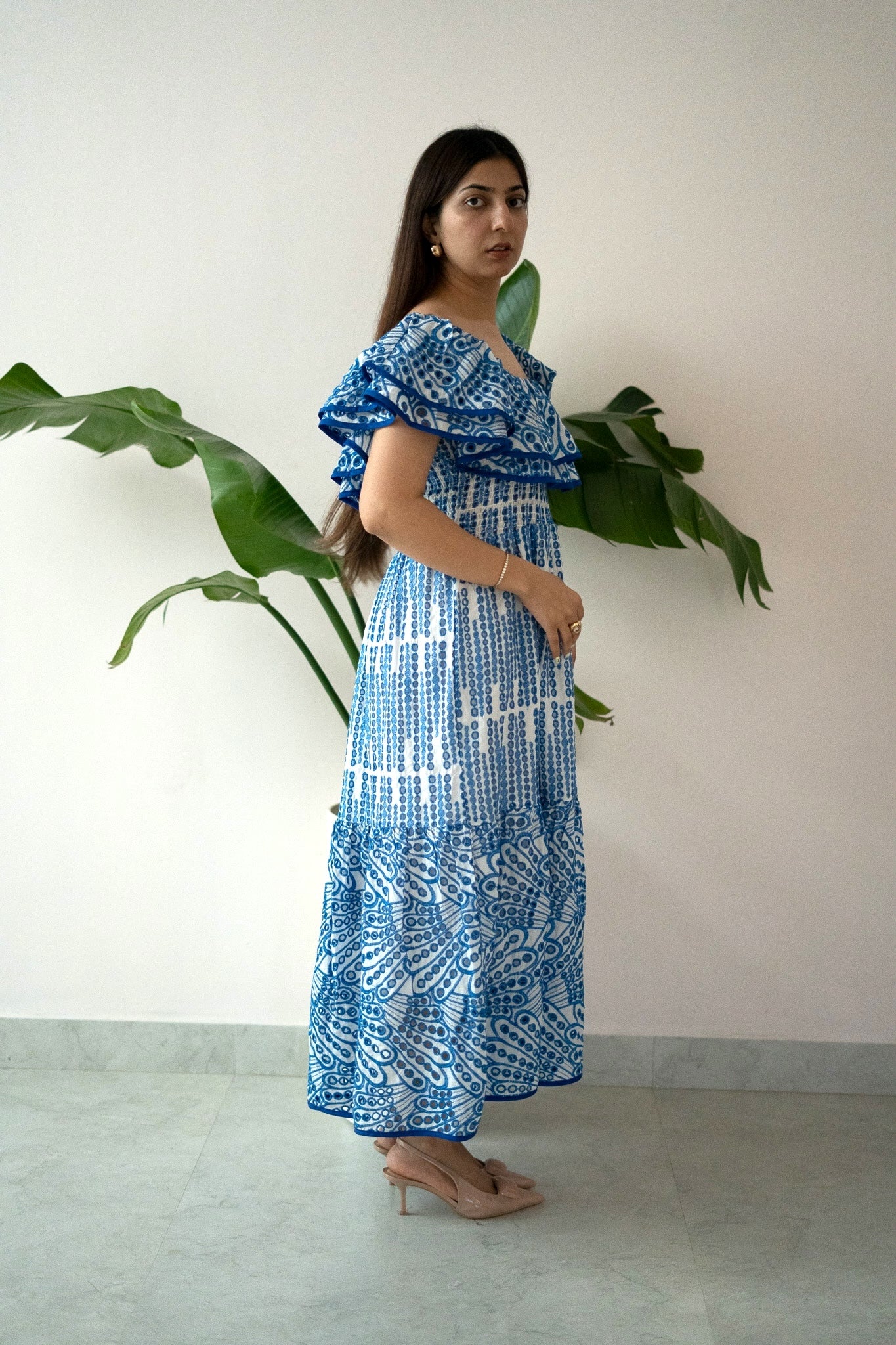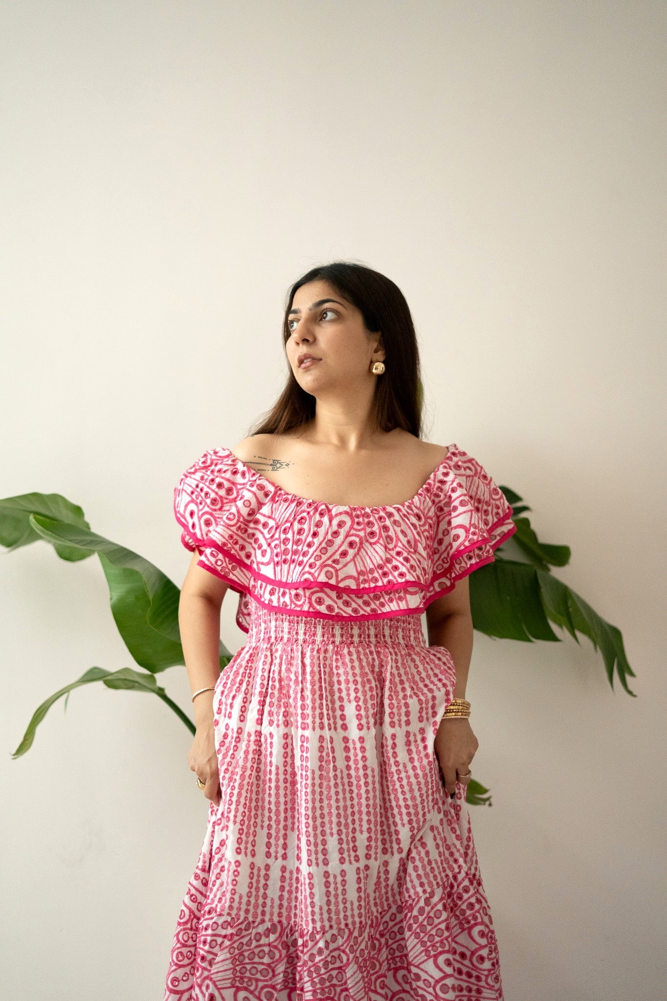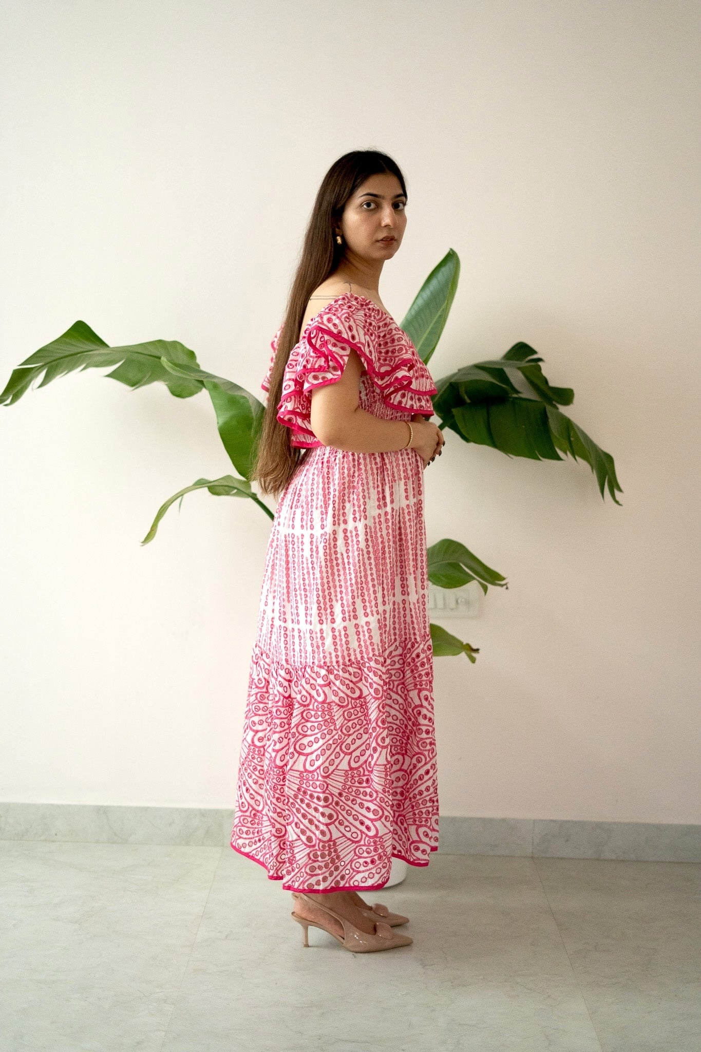 Crafted from a soft, breathable cotton-blend fabric, it features a flattering smocked waist and a tiered skirt that flows gracefully with every step. The statement ruffled neckline adds a touch of romance, making it perfect for brunches, vacations, or festive gatherings.