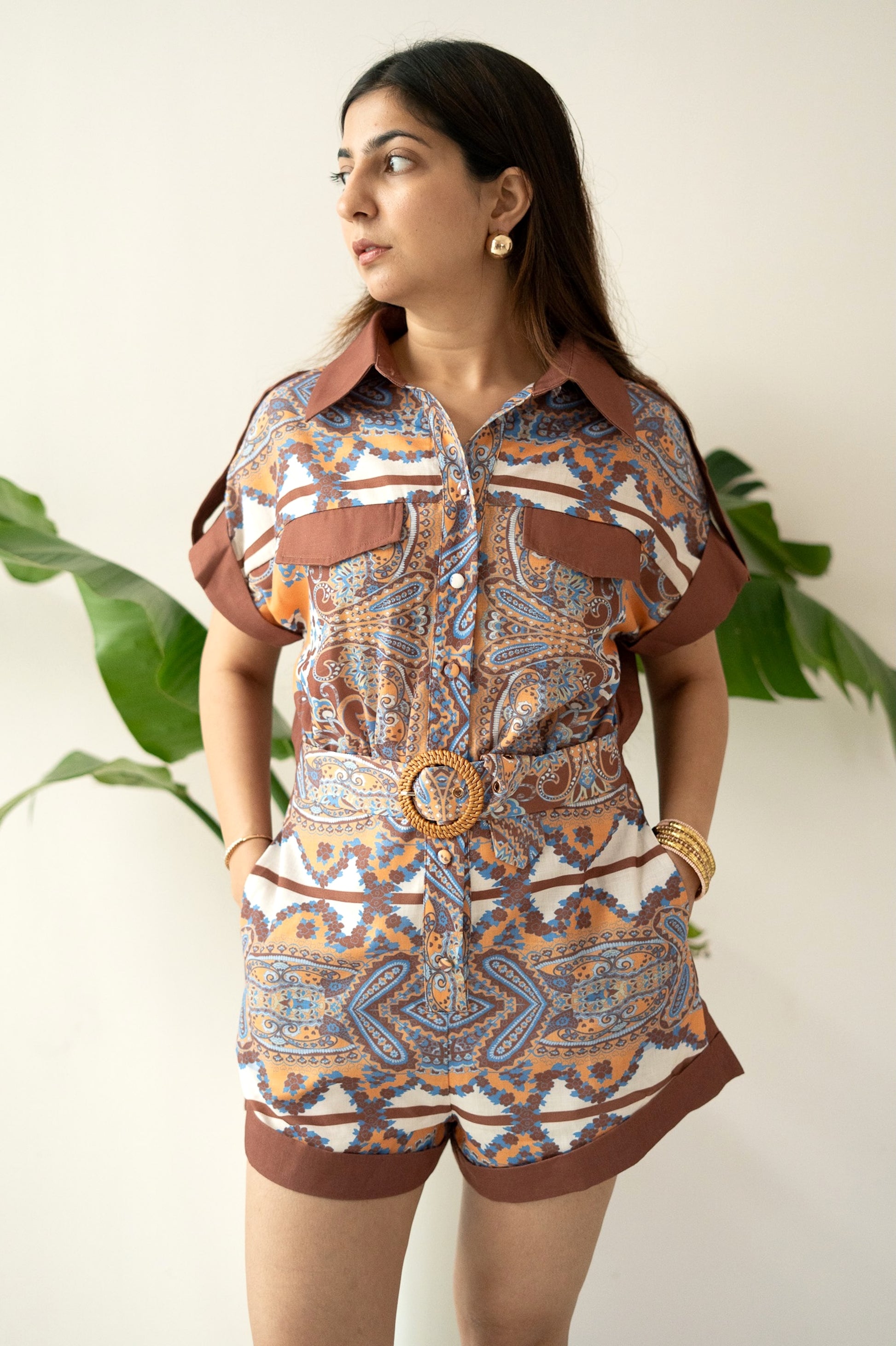 Featuring a structured collar, folded sleeves, and a statement woven belt that cinches the waist, this playsuit blends relaxed charm with a polished silhouette. The intricate all-over print adds a premium, statement look—perfect for casual luxury wear without any embroidery.