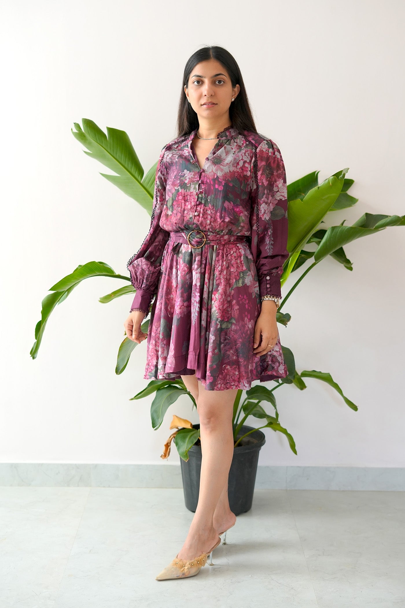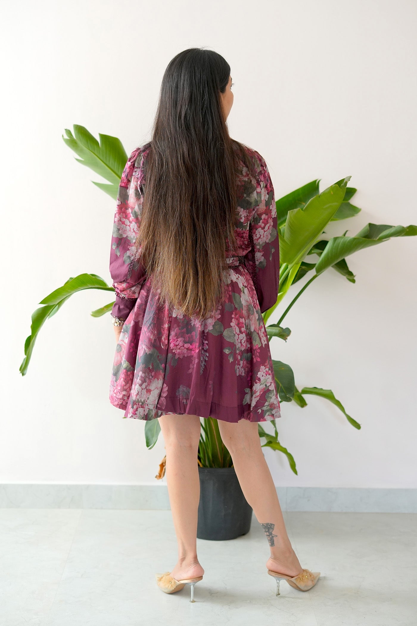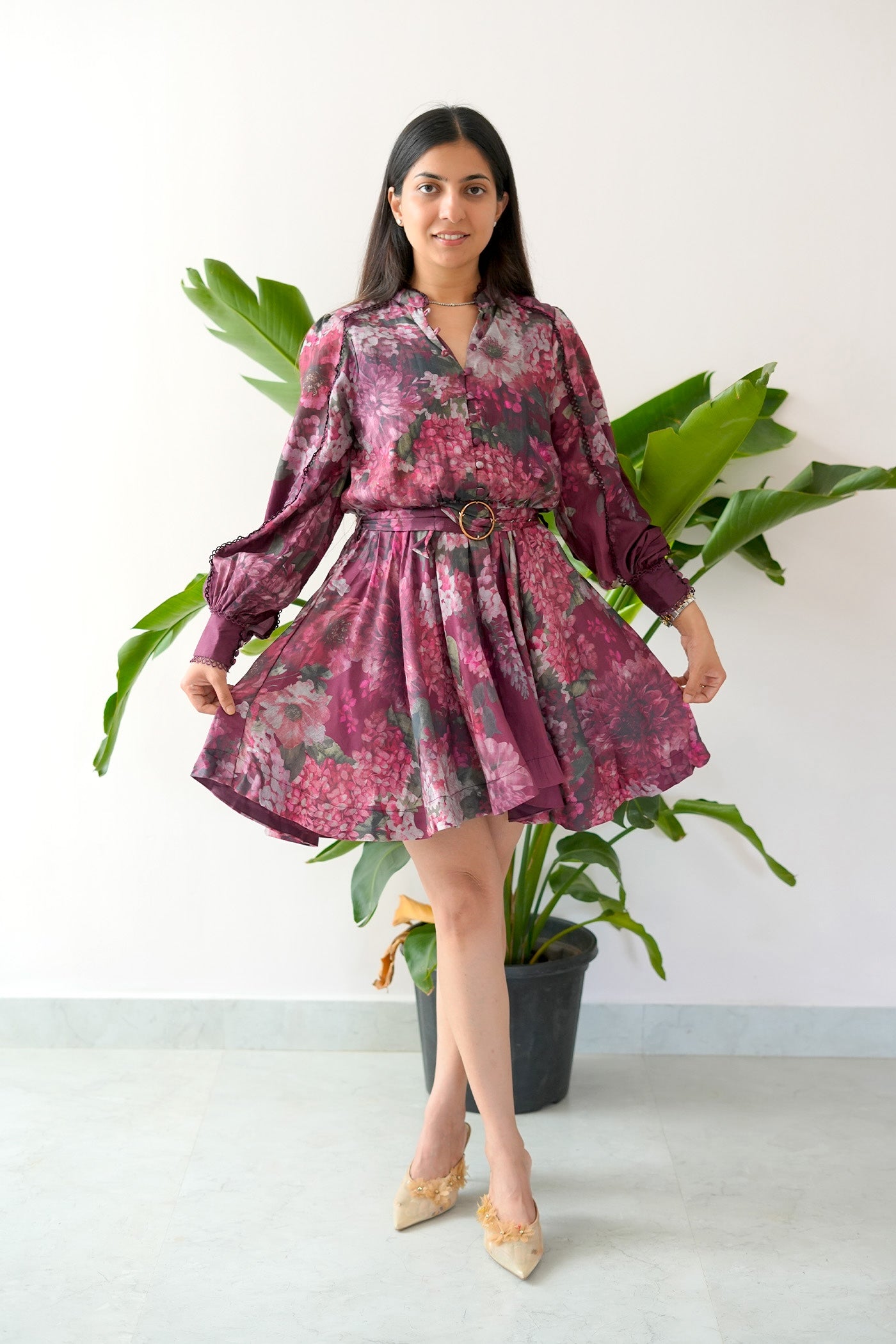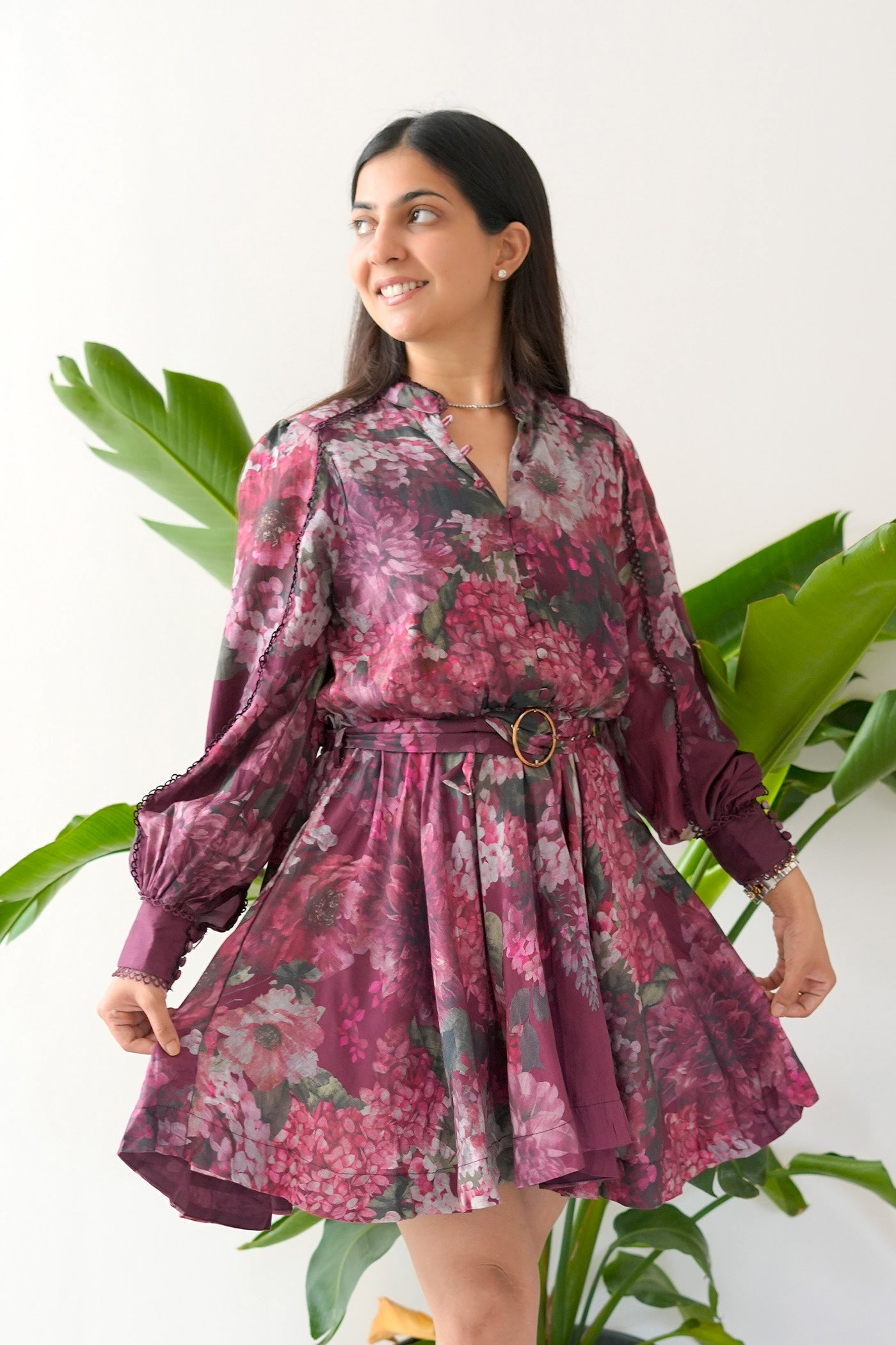 Meet Coca Cola — a flirty fusion of vintage charm and modern flair. This berry-toned short dress bursts with floral romance and a flattering fit, making it your go-to for brunches, date nights, or festive evenings. Crafted in flowy fabric with an elegant belt and bishop sleeves, it brings the perfect mix of playful and polished.