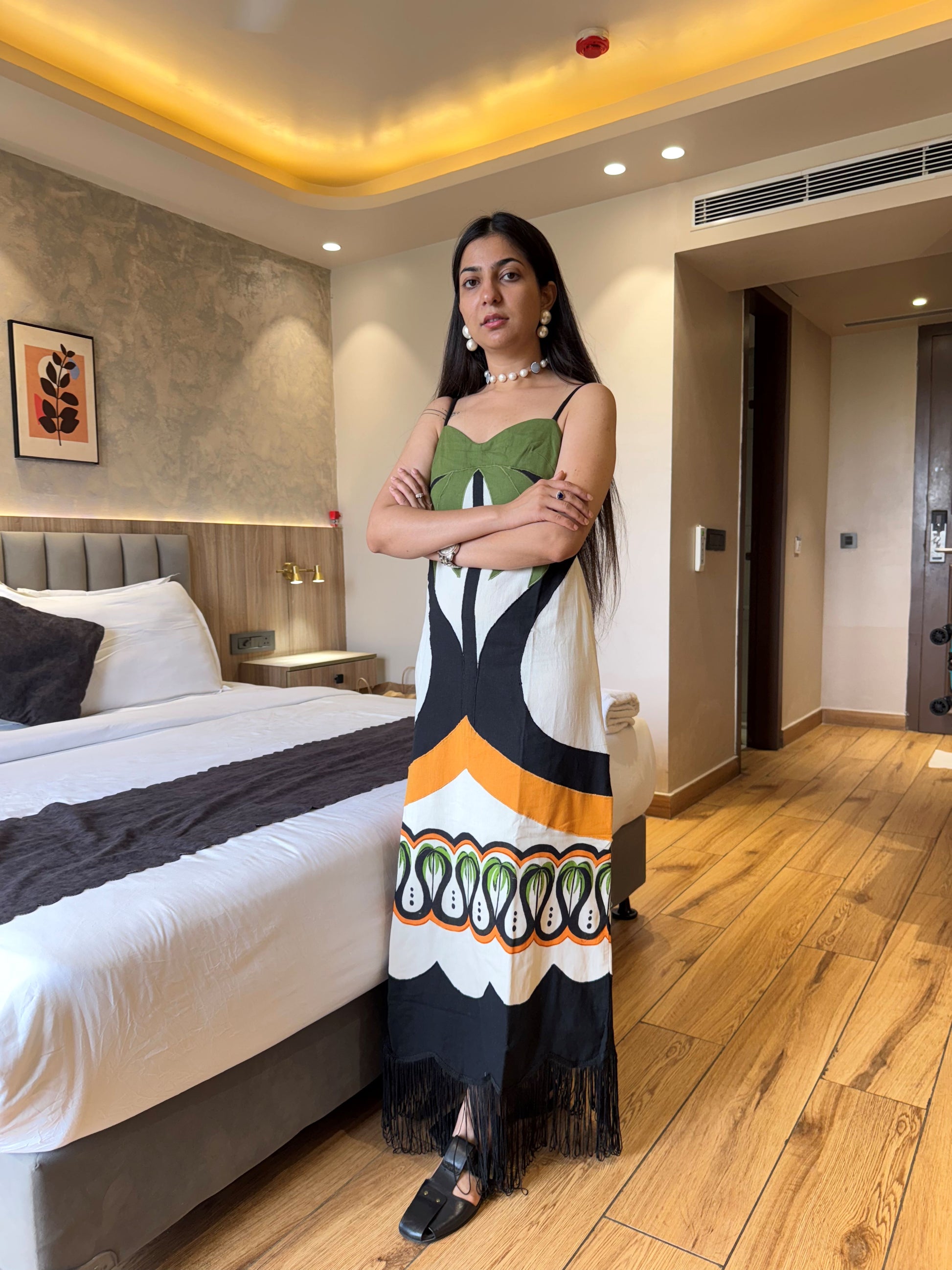 Say hello to Coconut Chutney – a vibrant maxi dress that brings together earthy elegance and playful patterning in one bold, breezy statement. Crafted from soft, breathable cotton, this strappy silhouette features a rich blend of olive green, warm mustard, ivory, and deep black, with striking abstract motifs that mirror nature’s rhythm.