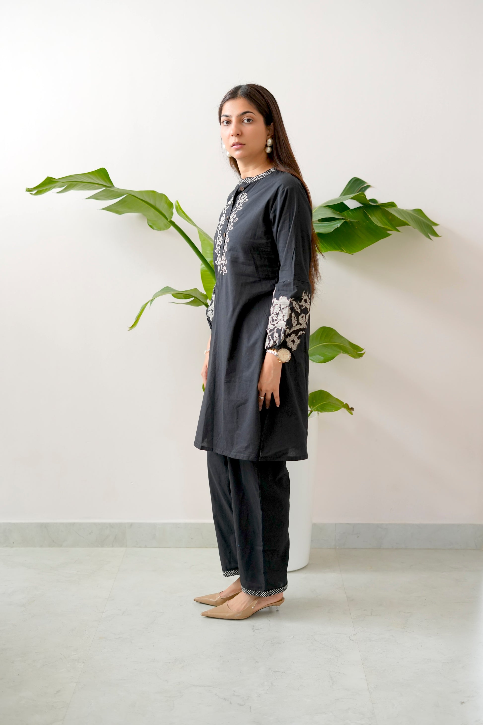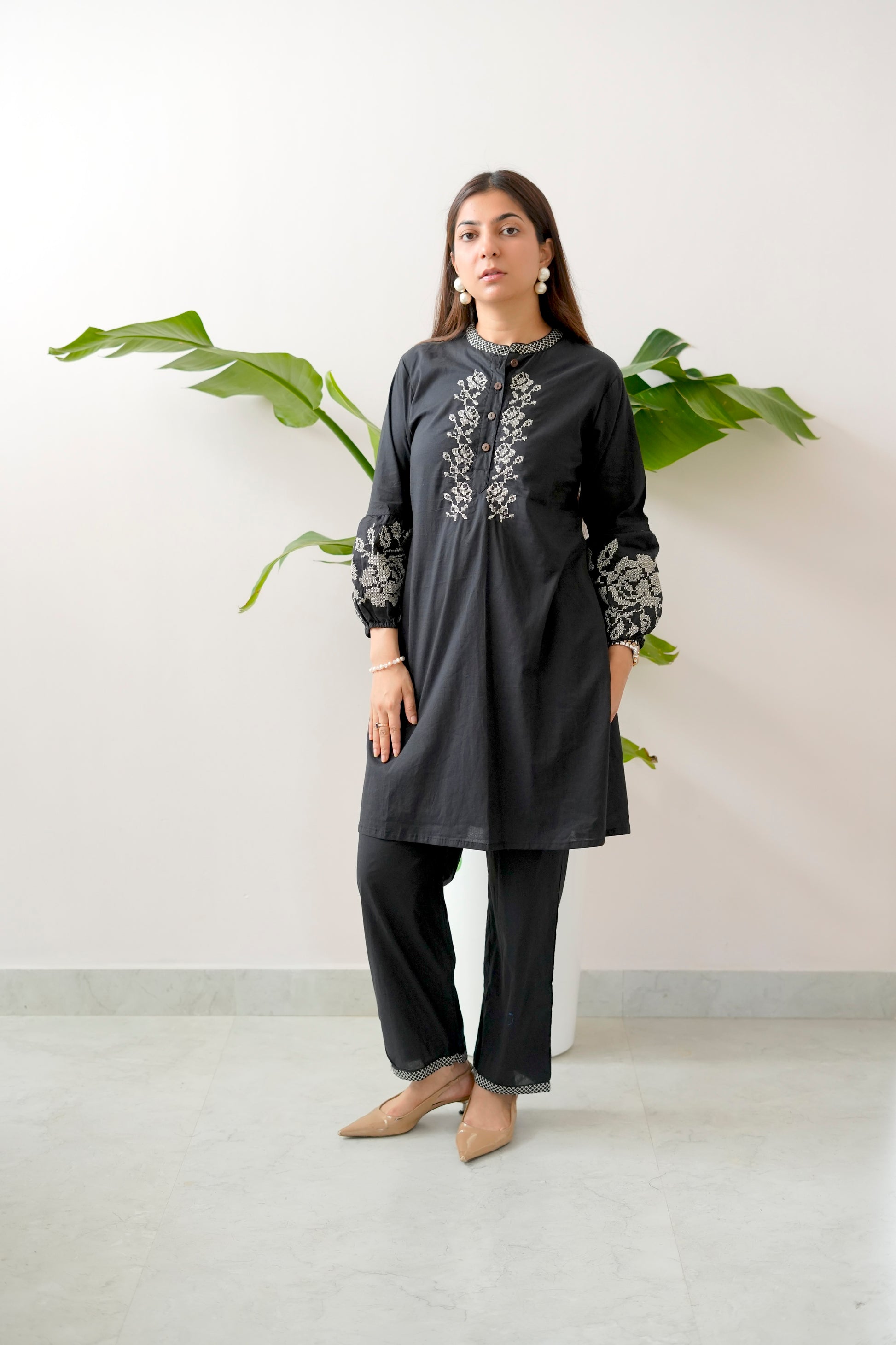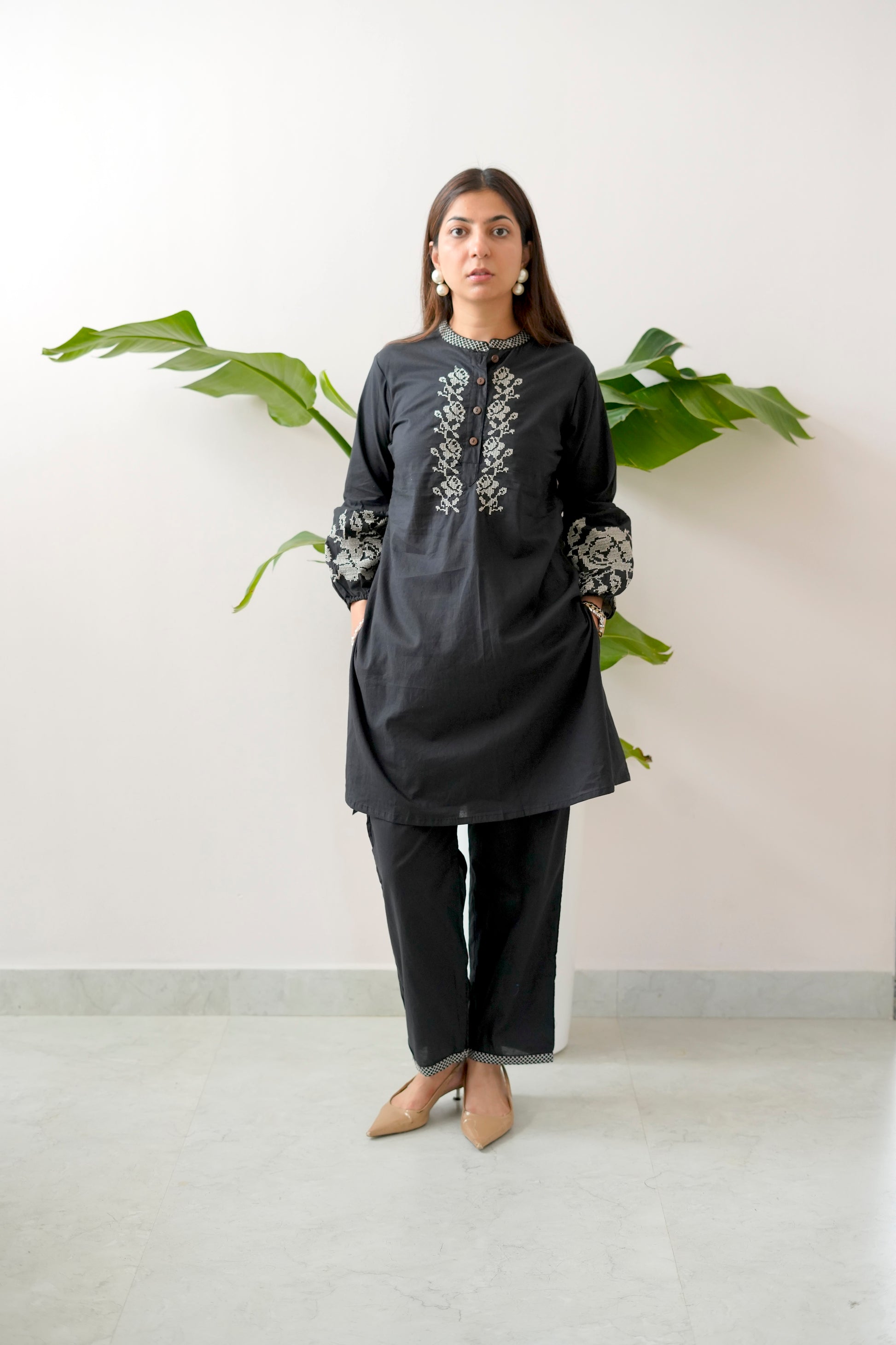 Collar Toh Dekho is a show-stealing coord set in classic black, brought to life with bold white embroidery and that statement band collar that instantly elevates the whole look.