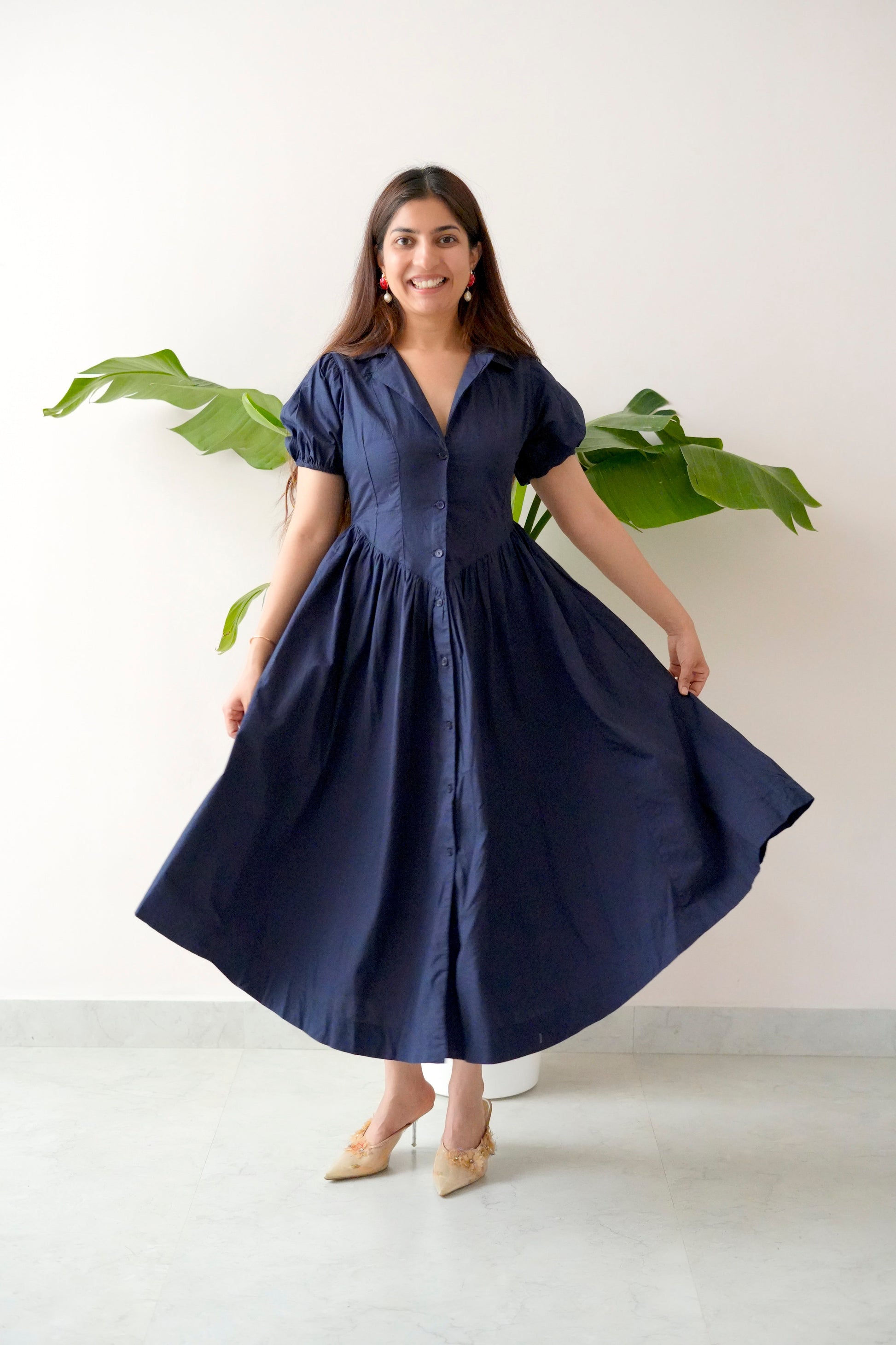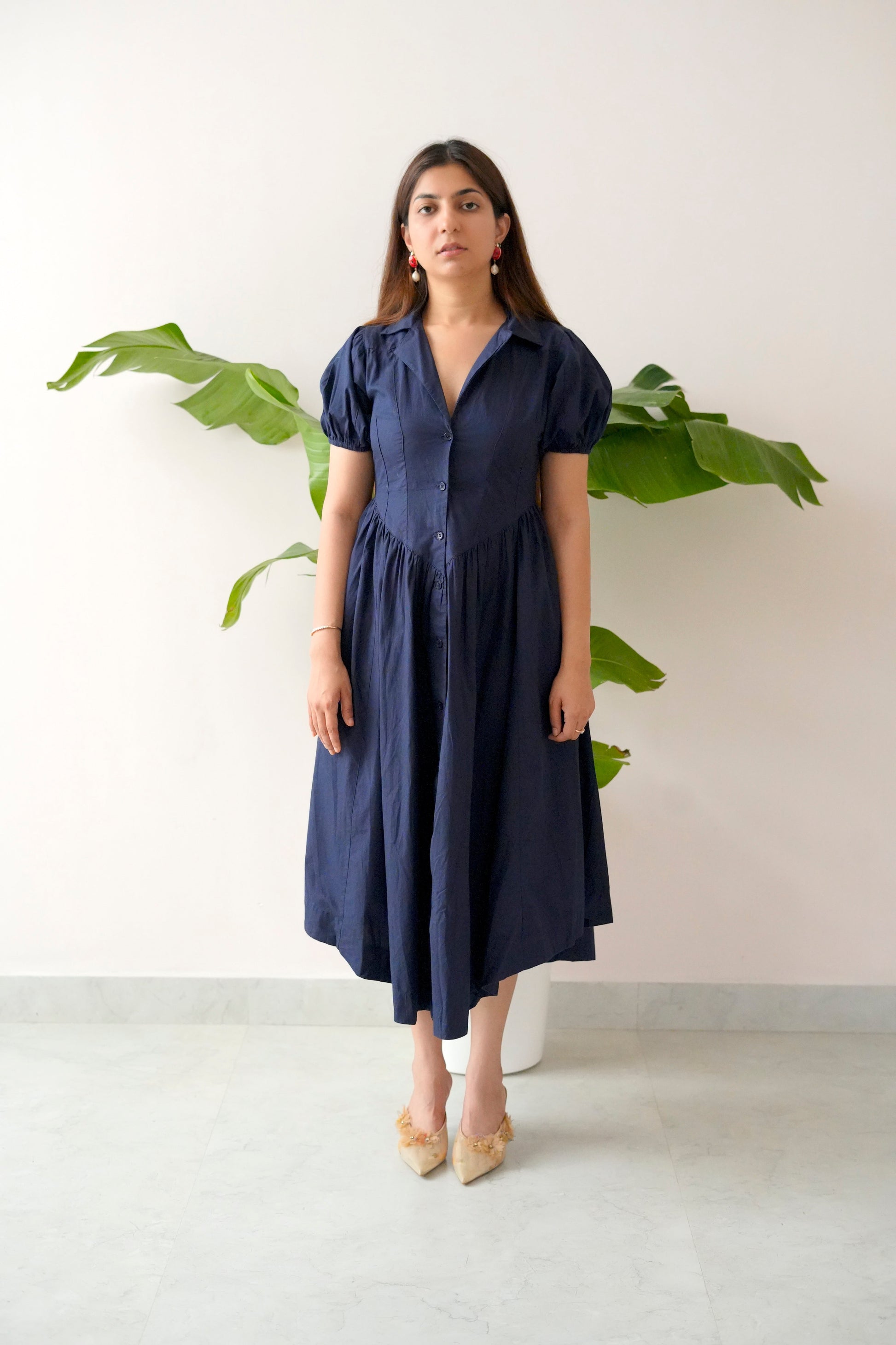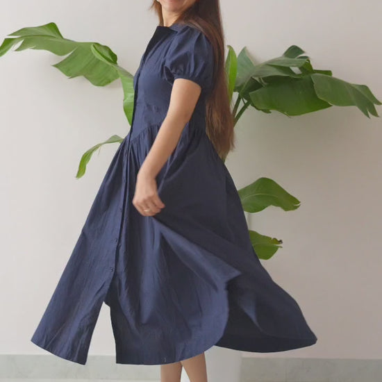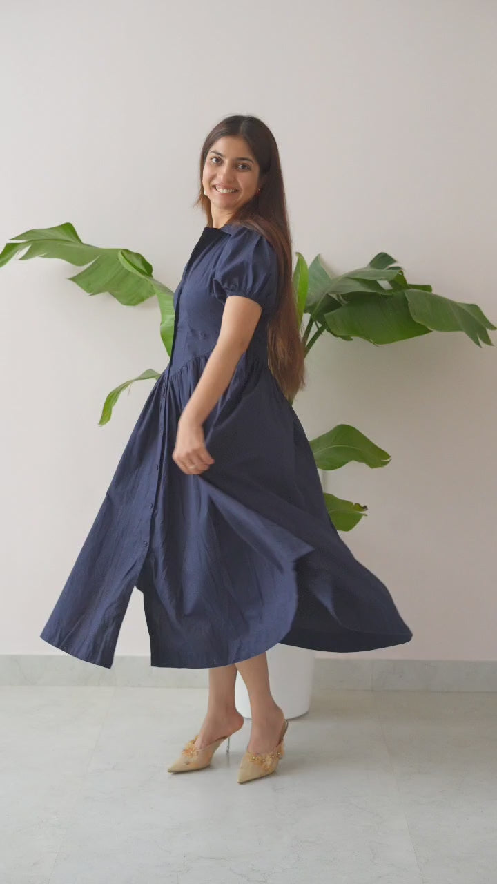 This midnight-blue midi dress blends sophistication with subtle drama, featuring a collared neckline, puff sleeves, and a flattering button-down front that creates a perfectly cinched silhouette. Its flowy hemline moves with you, giving just the right touch of elegance and mystery.