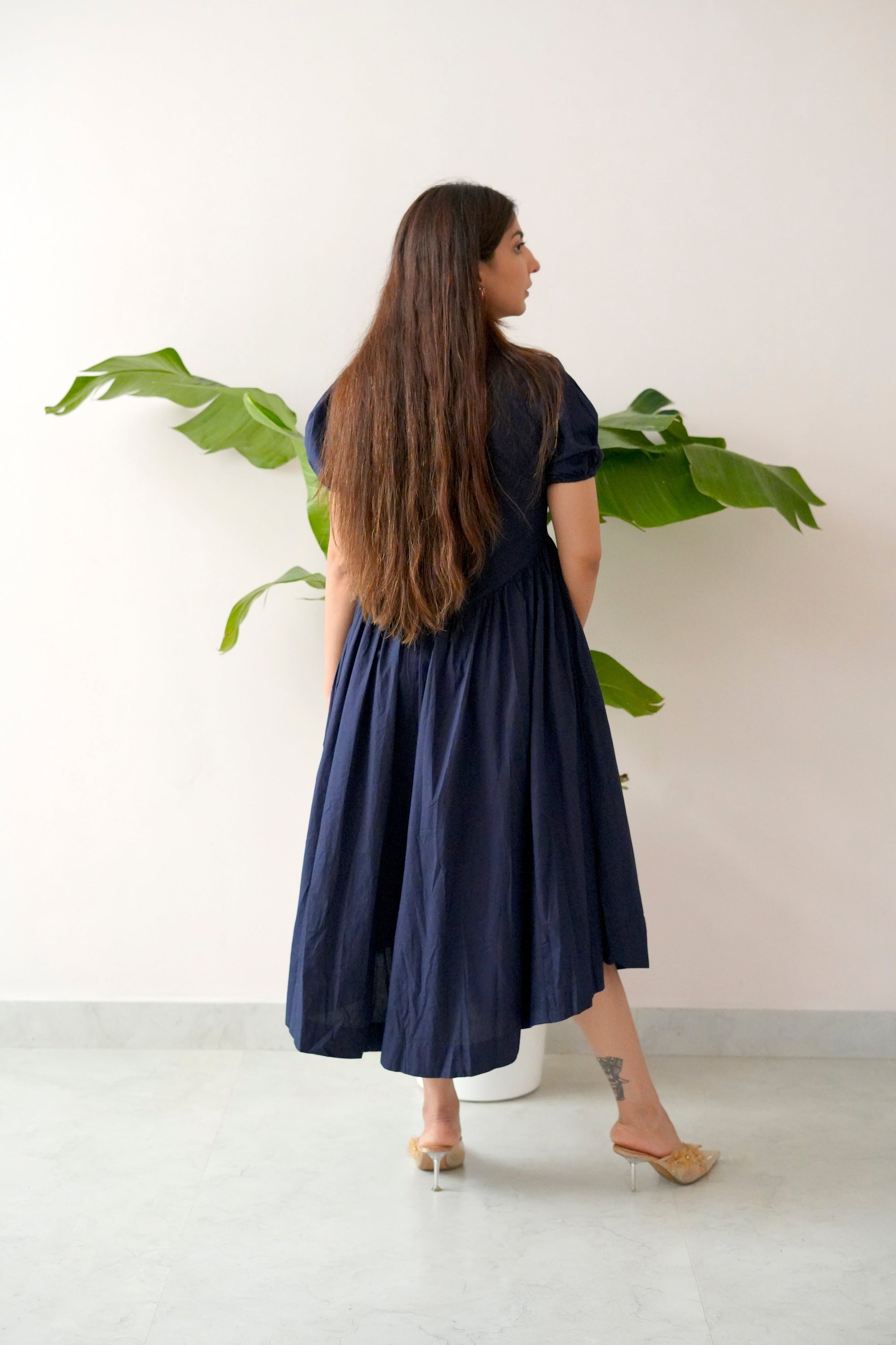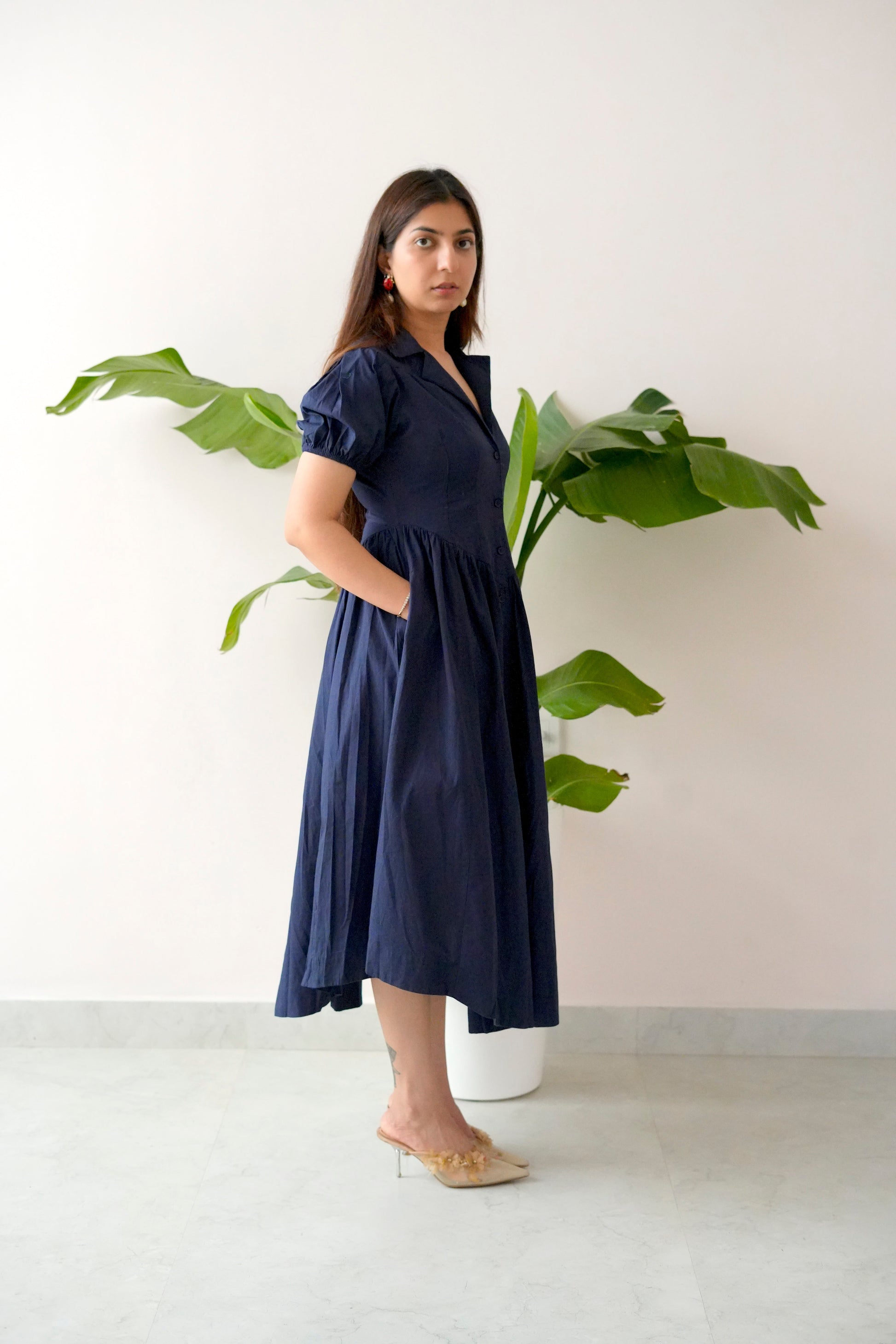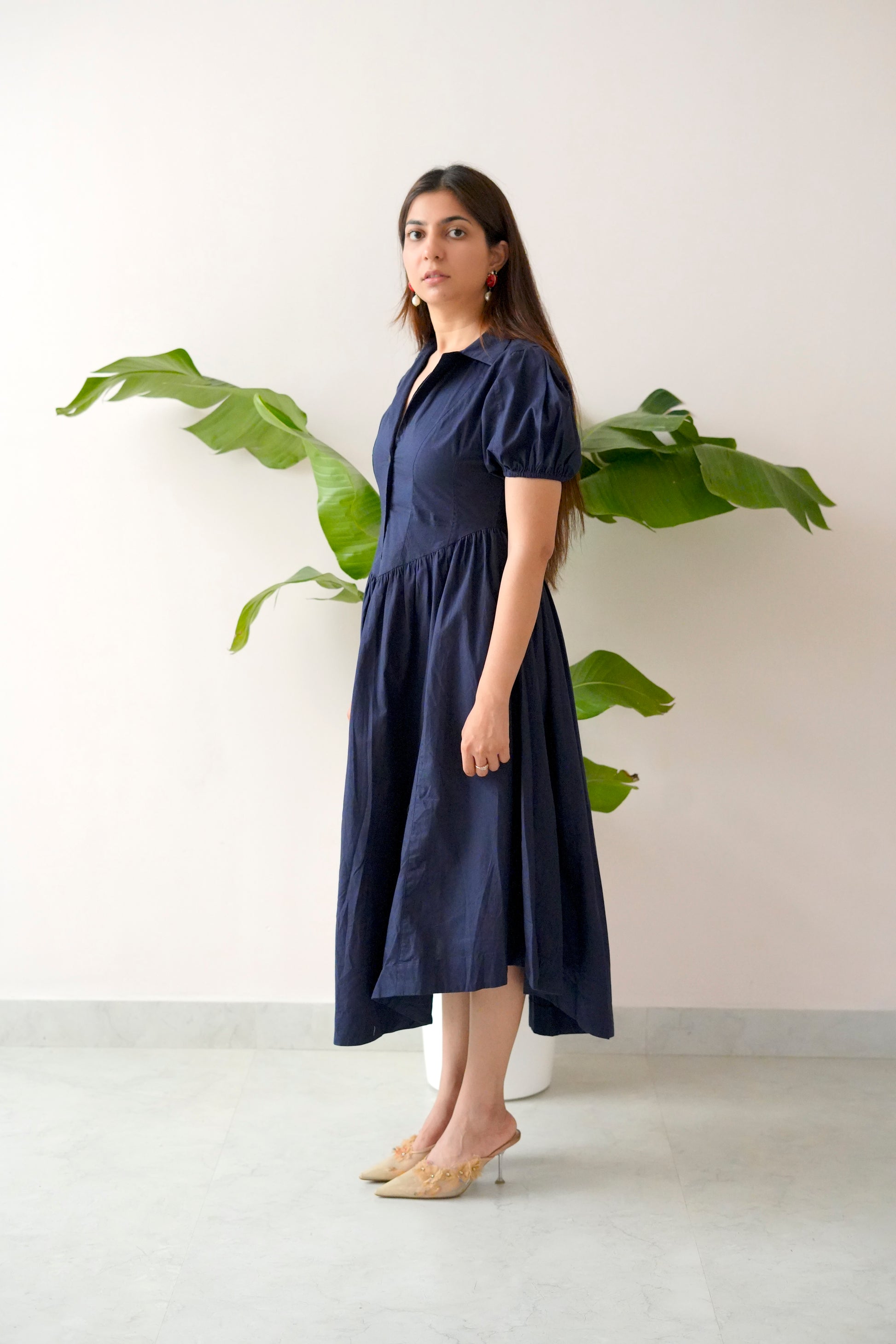 This midnight-blue midi dress blends sophistication with subtle drama, featuring a collared neckline, puff sleeves, and a flattering button-down front that creates a perfectly cinched silhouette. Its flowy hemline moves with you, giving just the right touch of elegance and mystery.