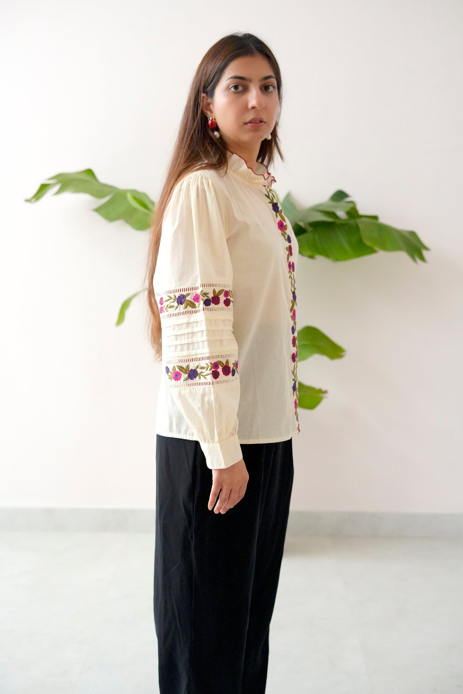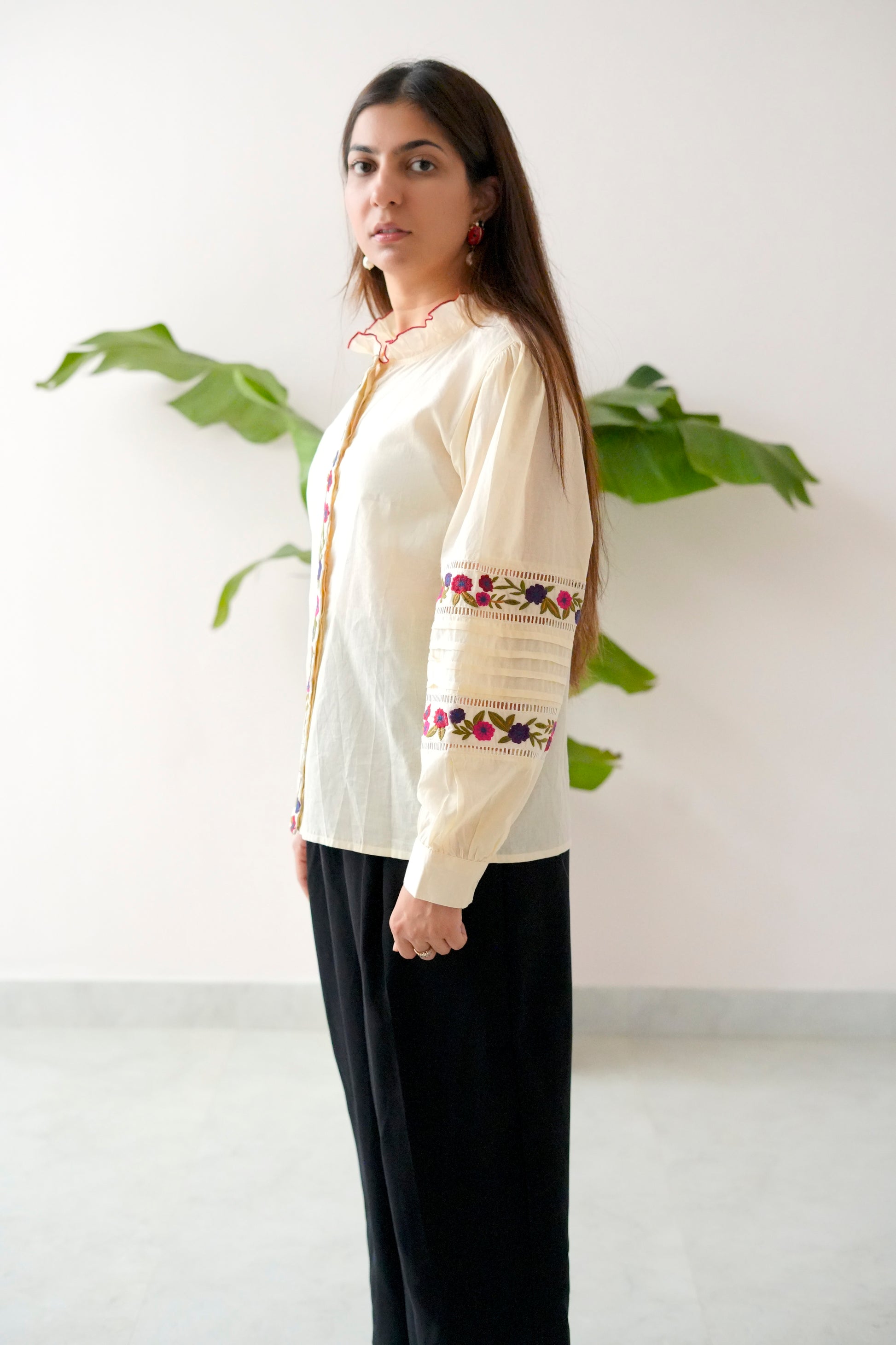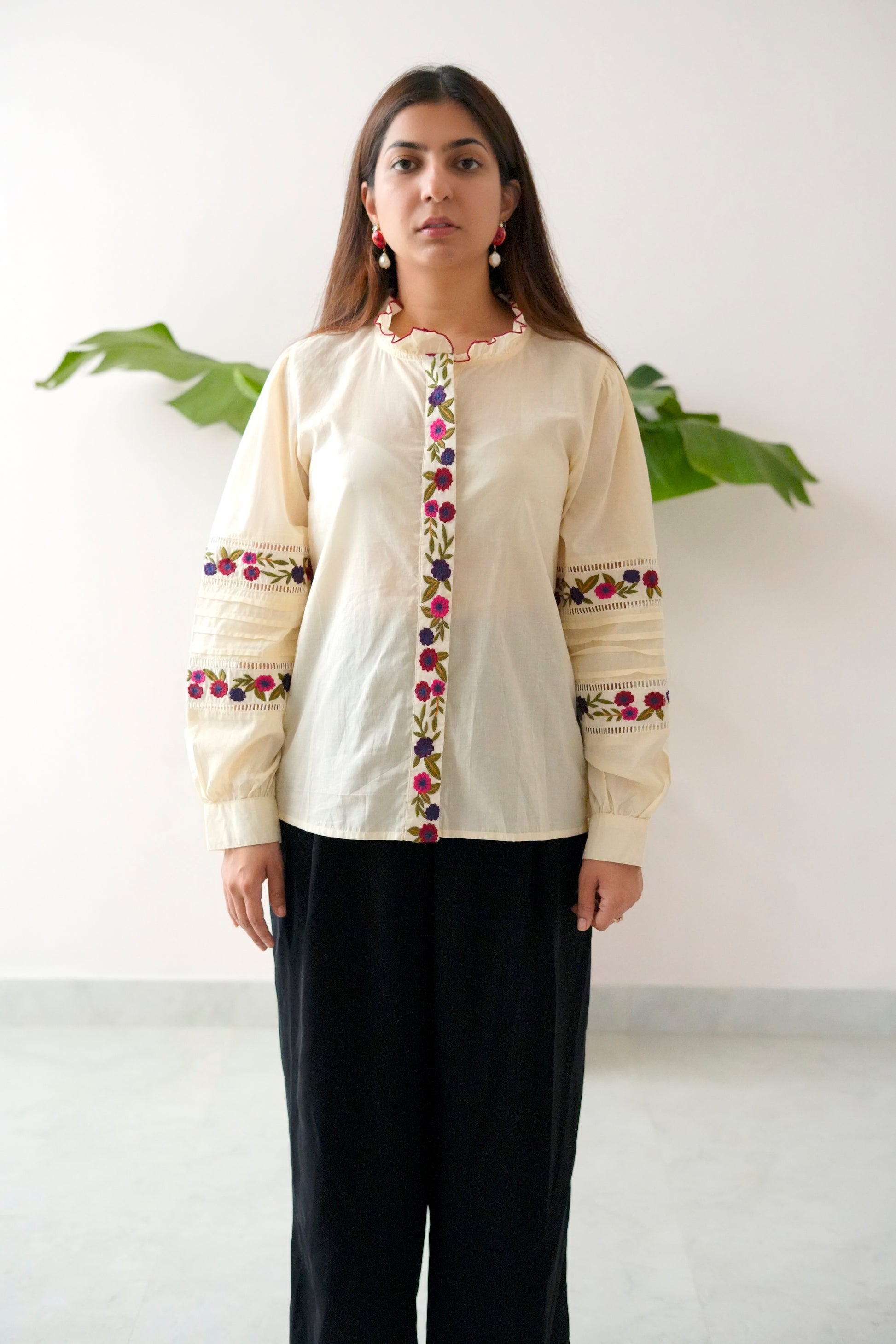 Crafted in soft, breathable cotton, this cream-toned top features intricate floral embroidery along the front placket and sleeves, with delicate ladder lace detailing for a touch of elegance. The full sleeves with slight gathers at the wrist add a vintage charm, making it a versatile piece for any occasion.