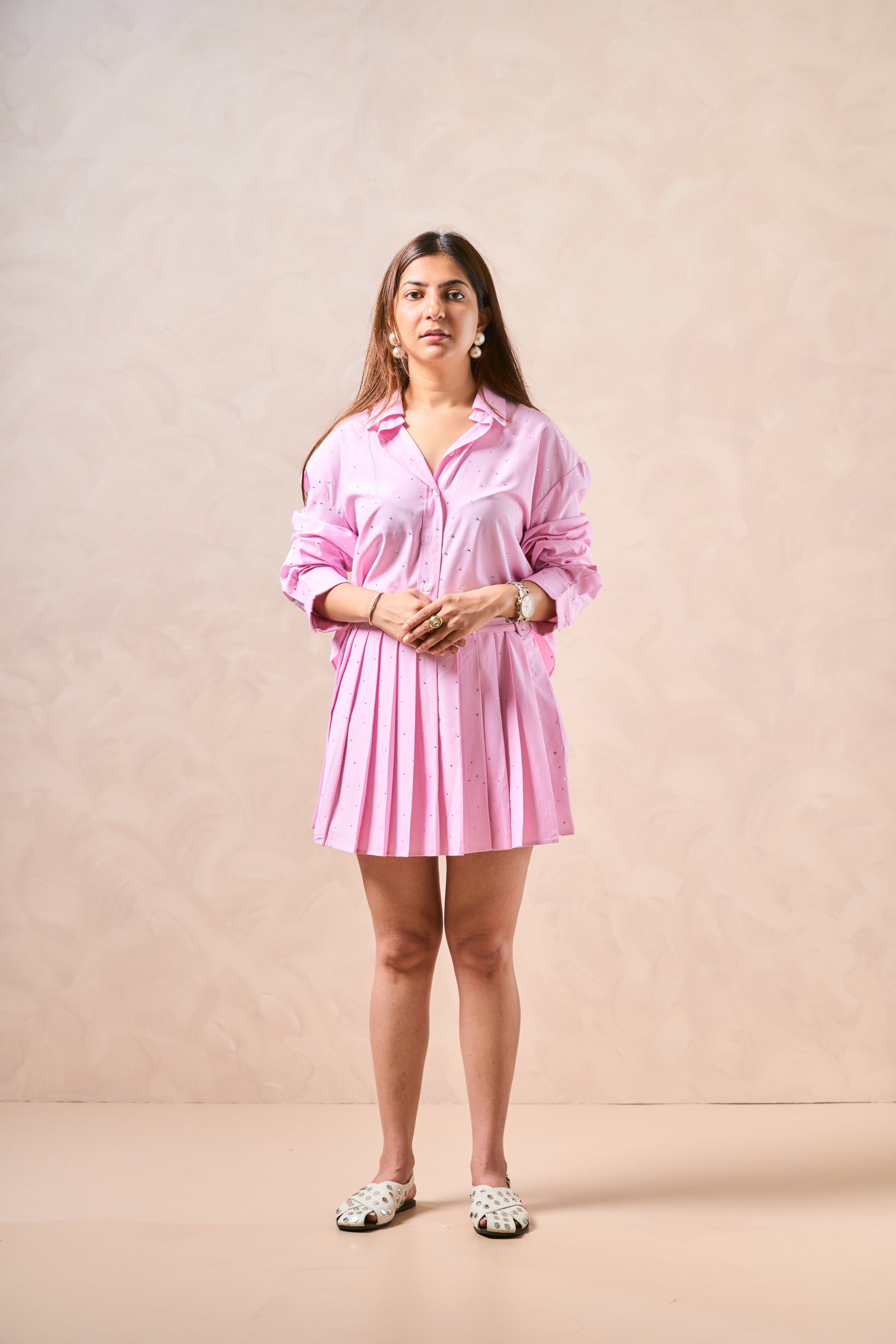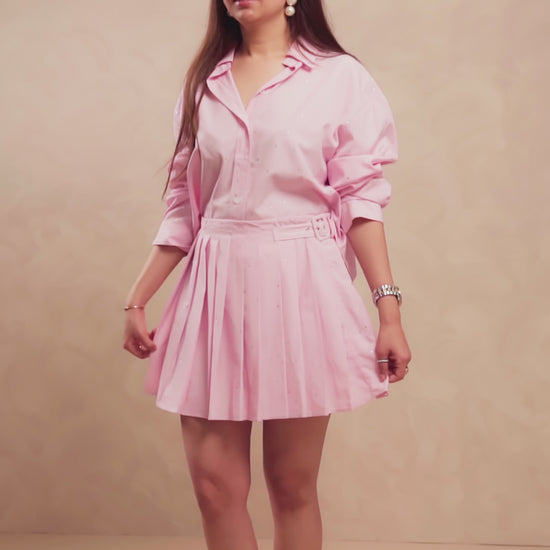 This playful Disneyland Skoord features a skirt and a pleated skirt adorned with sparkling diamonds all over, capturing the magical vibe of amusement parks and Disneyland. Perfect for adding a touch of sparkle to your international trip wardrobe, it combines fun and style effortlessly.