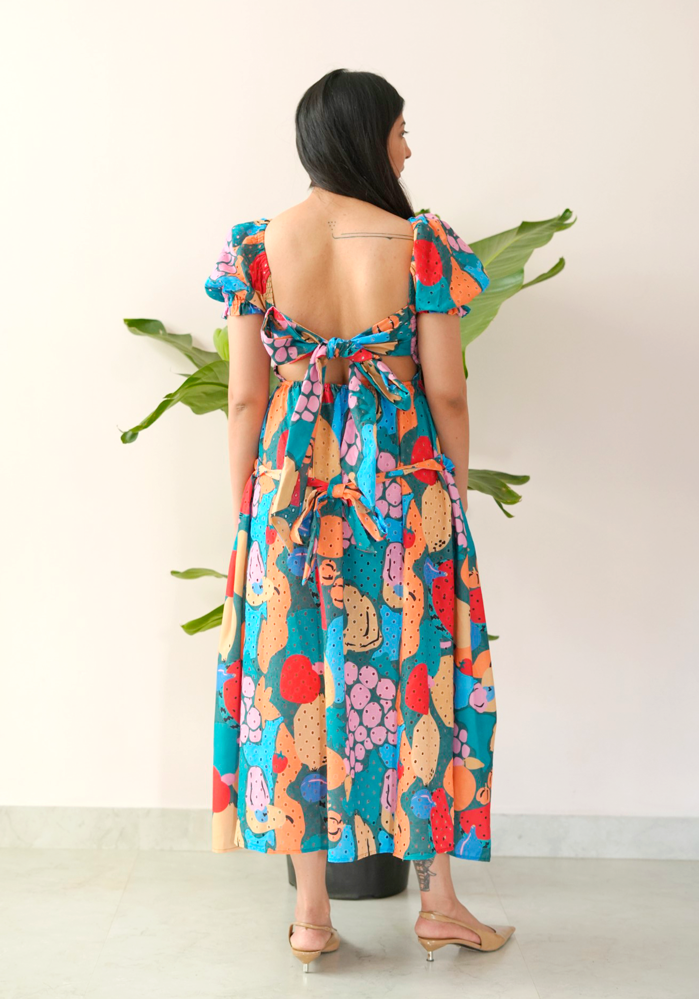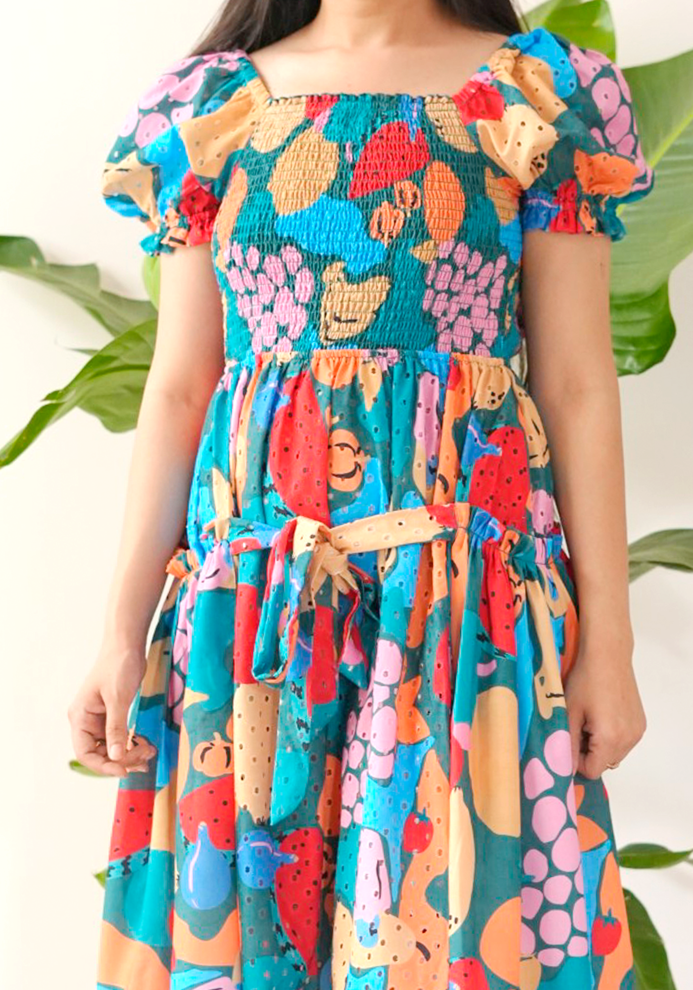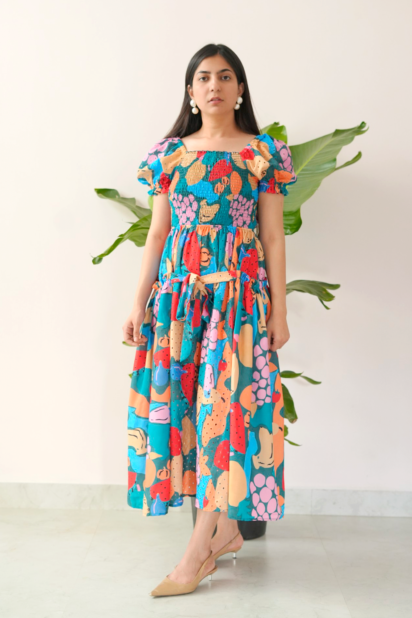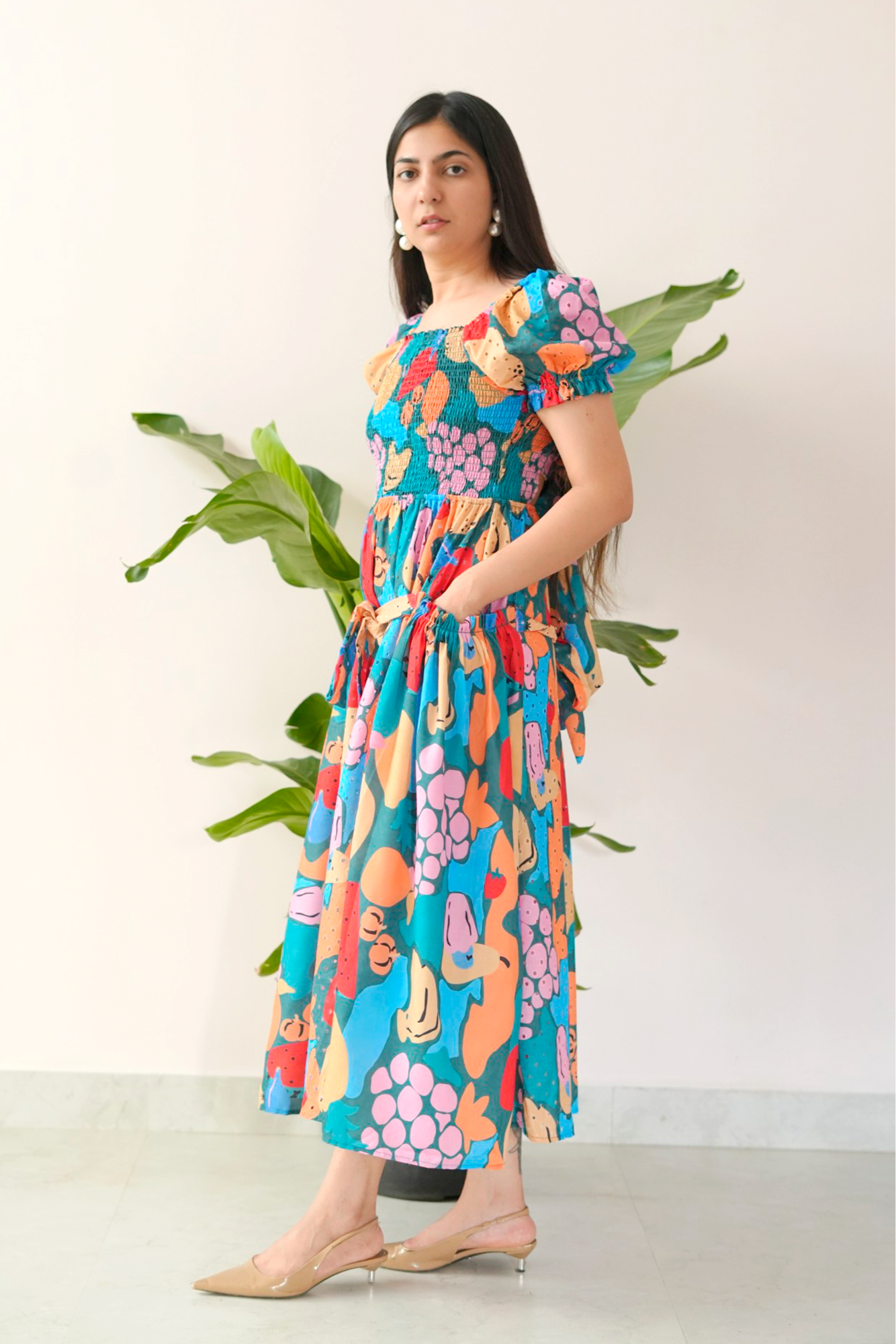 A statement midi dress that’s as playful as it is pretty. With a vibrant hand-illustrated print, puff sleeves, and a smocked bodice for a comfortable yet flattering fit, this dress brings a fairytale to life—perfect for weekend strolls, art markets, or casual summer outings.