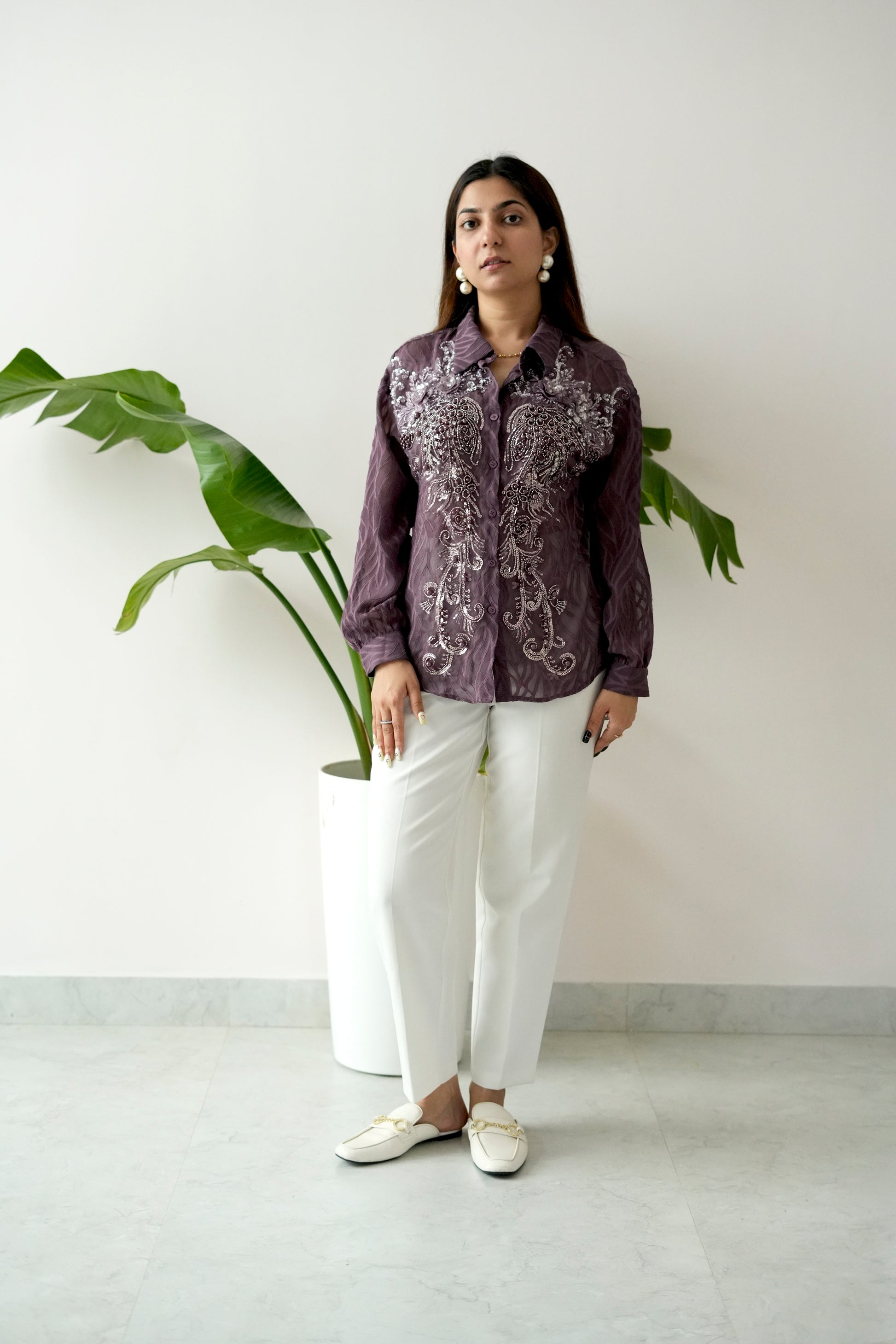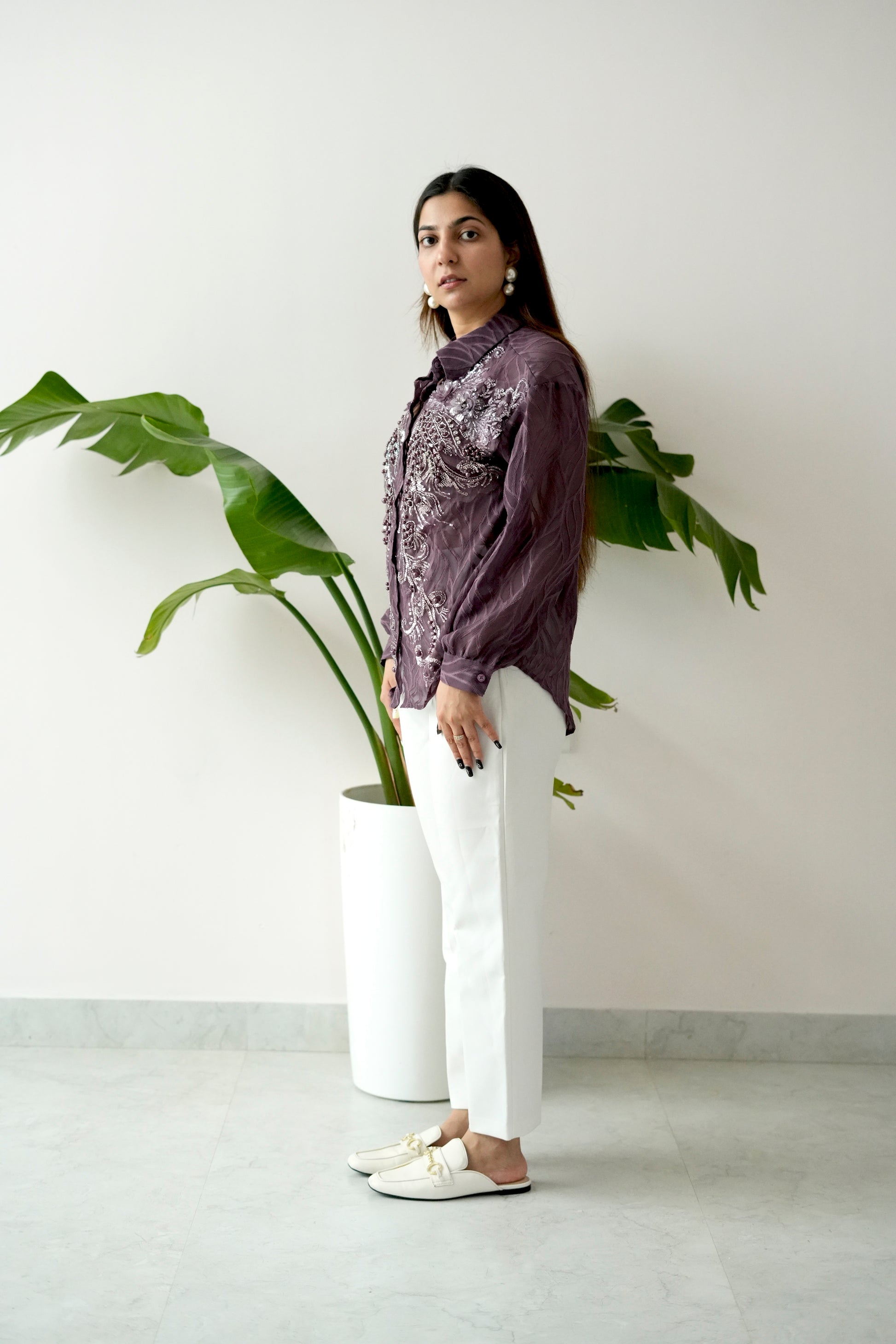 Infuse your wardrobe with refined European elegance through our “European Feel” shirt. This deep plum-hued piece showcases exquisite embroidery with pearls and sequins, capturing timeless sophistication and artisanal craftsmanship.