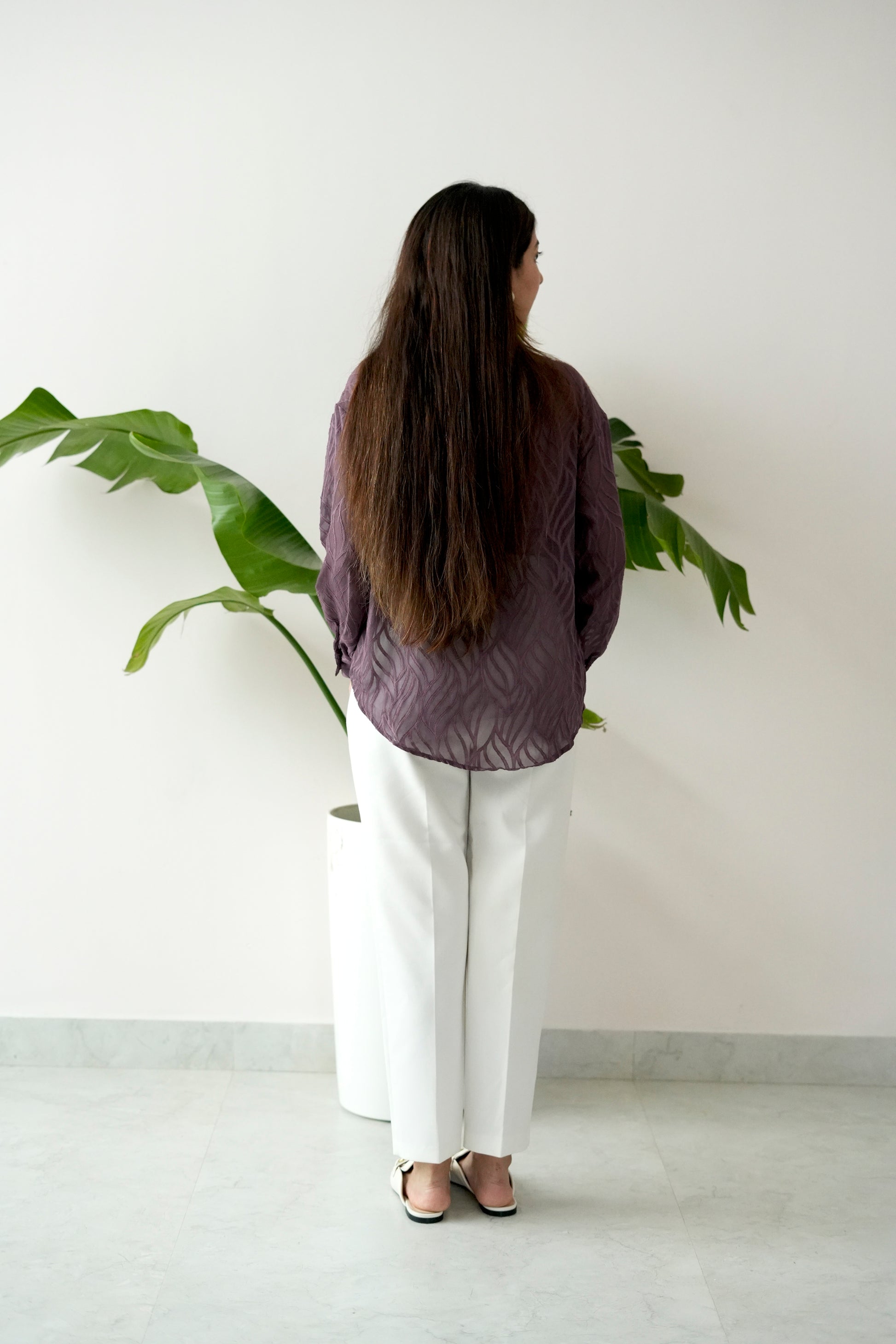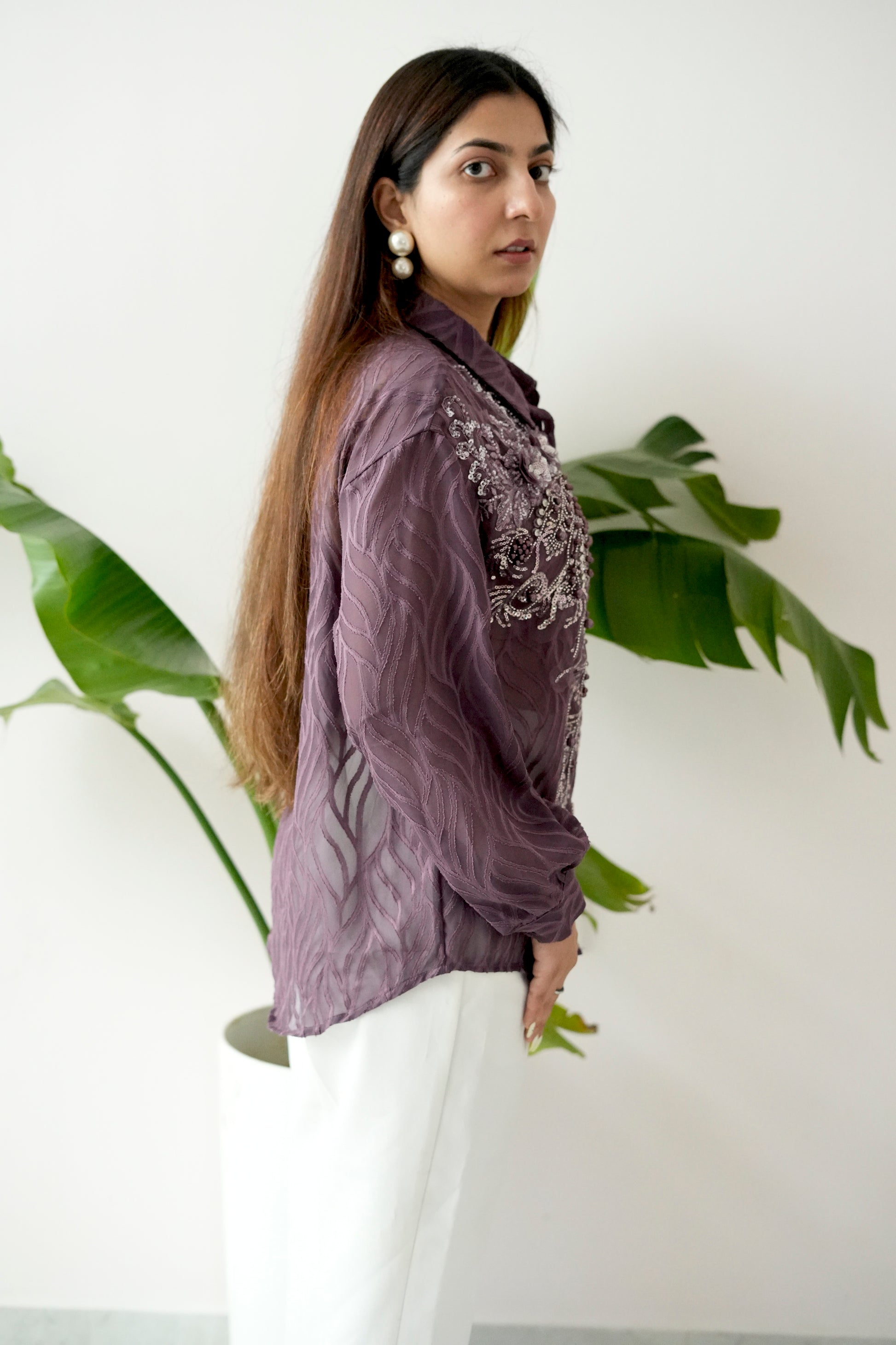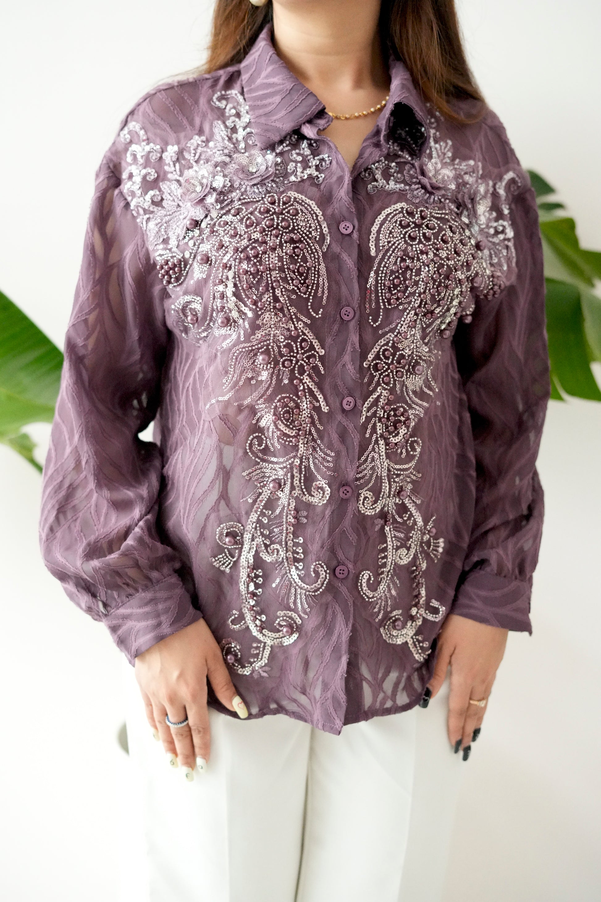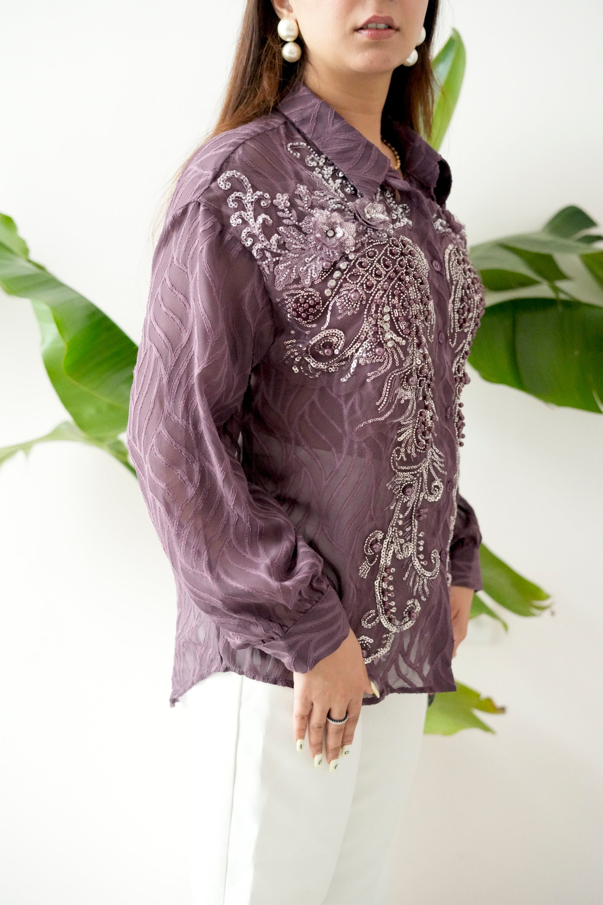 European Feel – Plum Pearl Embroidered Sheer Shirt