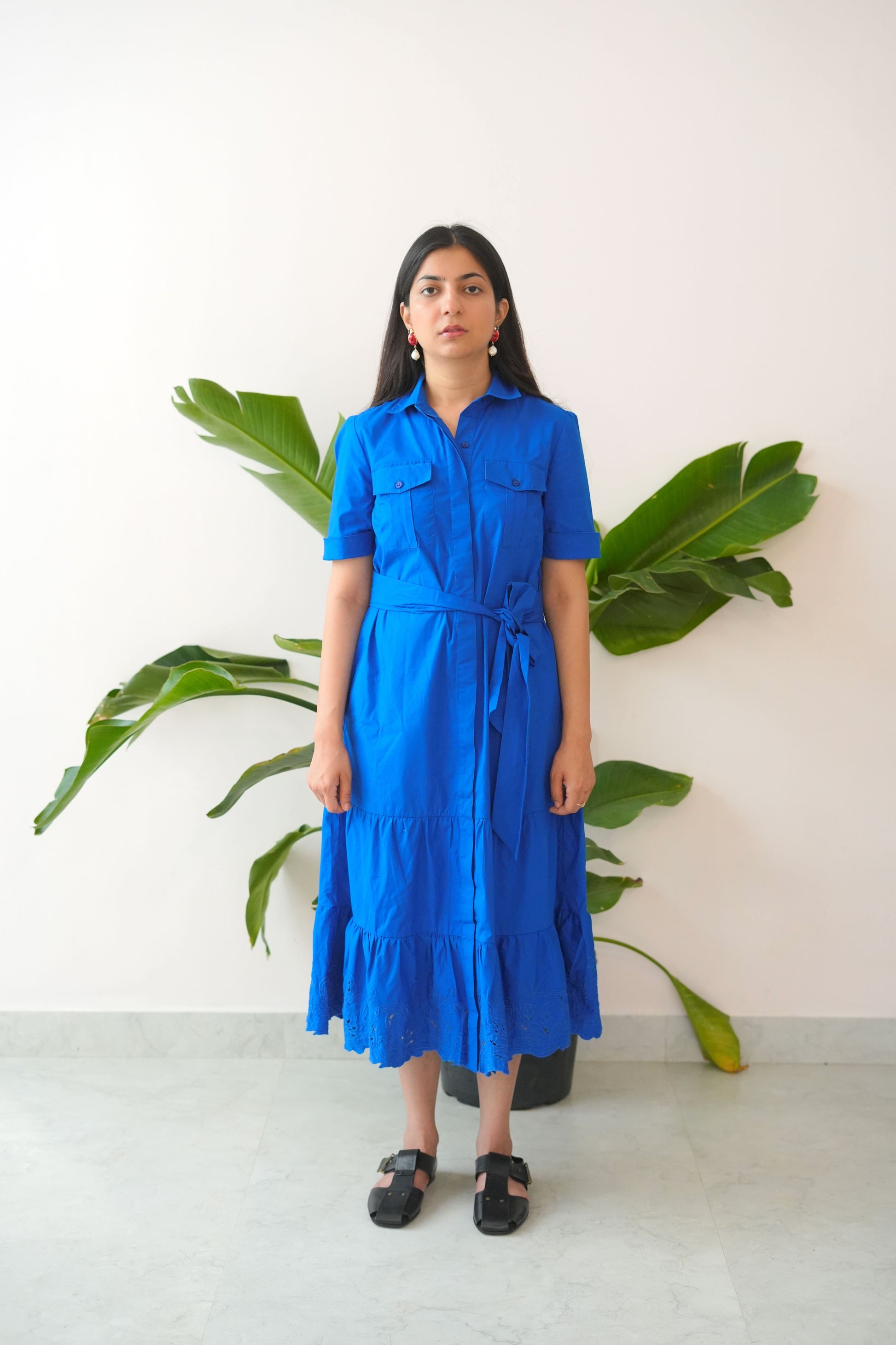 Command attention with the bold and confident Facebook Dress – where smart structure meets feminine flair. Crafted in a striking cobalt blue, this shirt-style midi dress features utility pockets, a button-down front, and a matching waist tie for a tailored finish. The tiered hem with delicate lace detailing adds softness to the crisp silhouette, making it perfect for both work and weekend plans.
