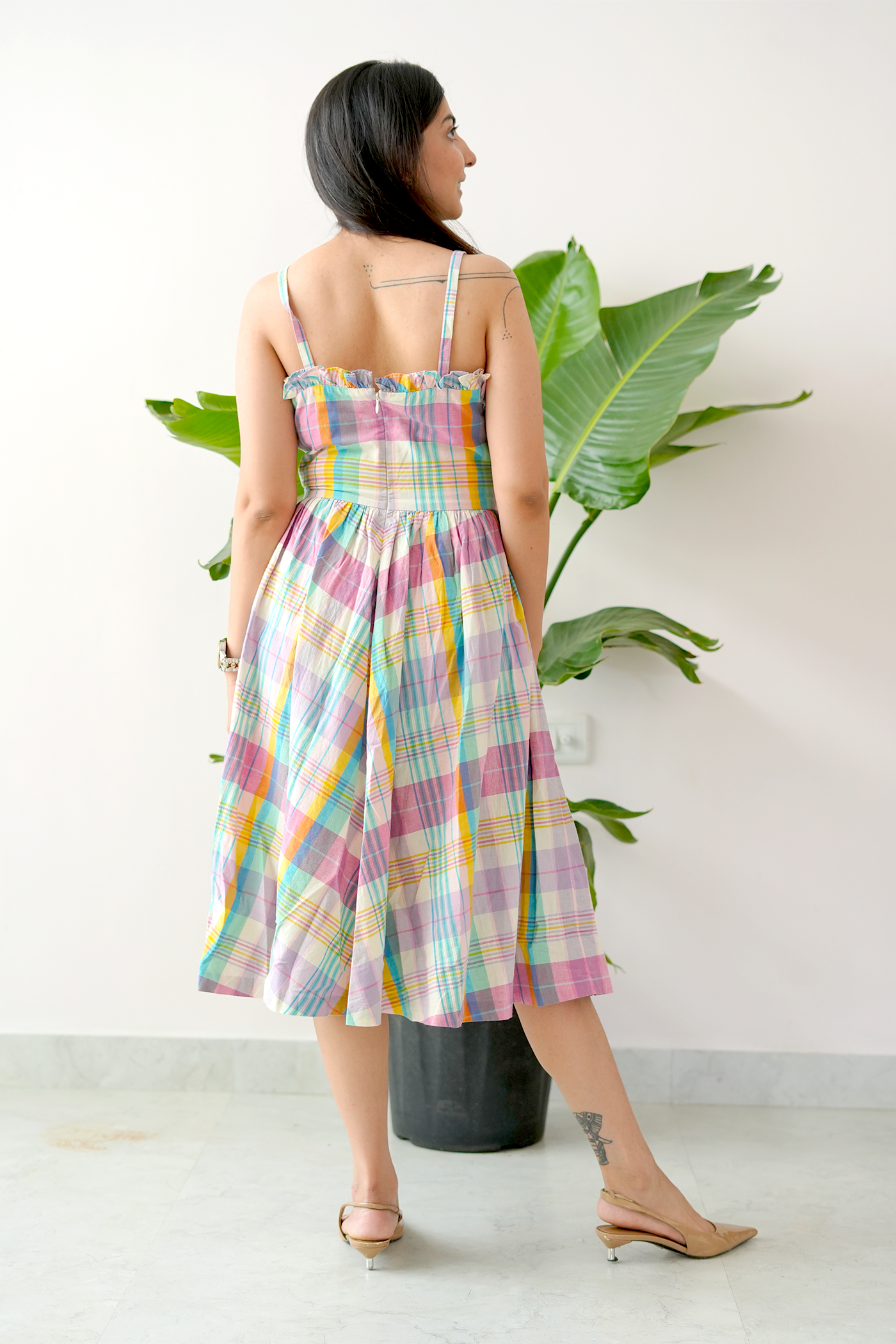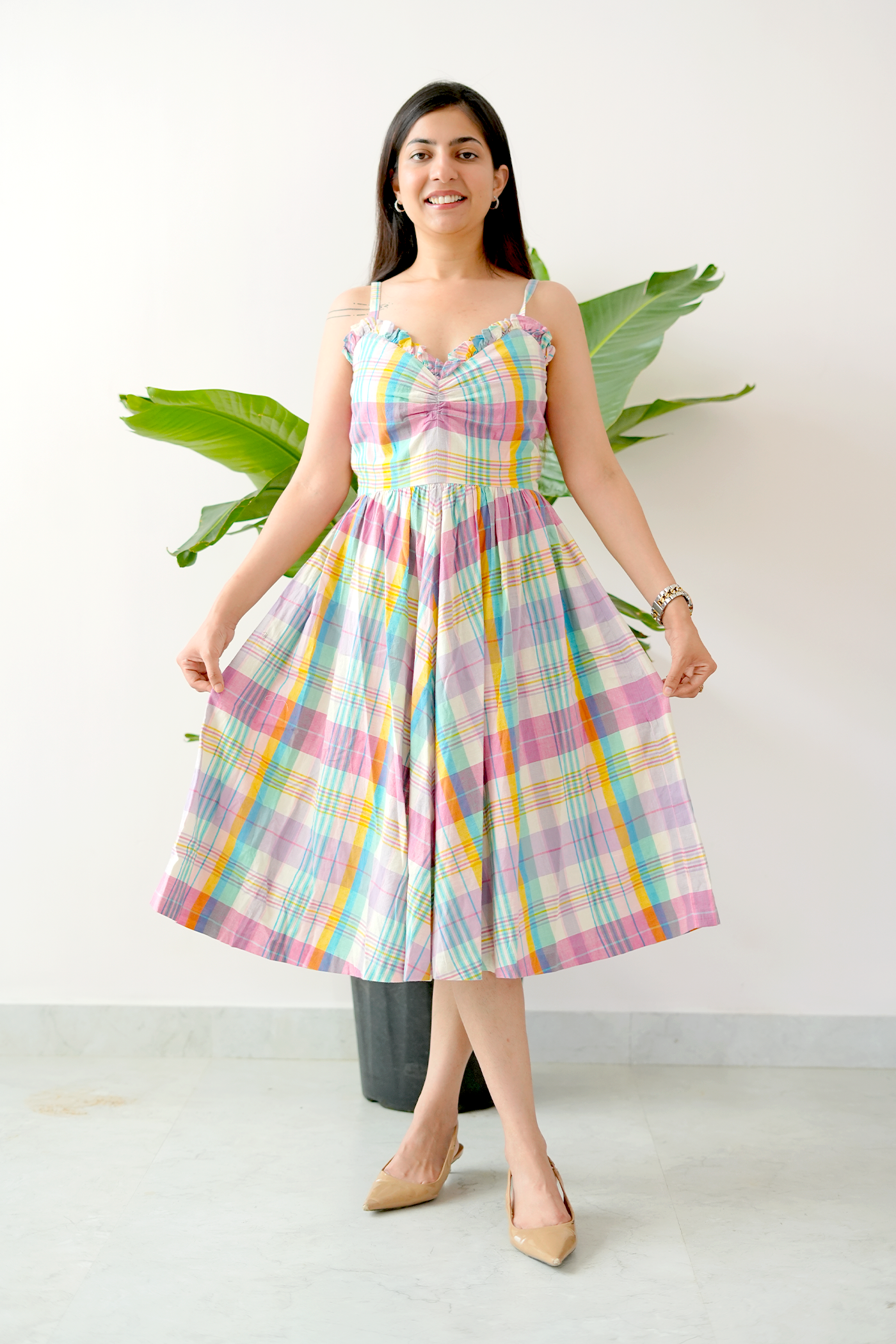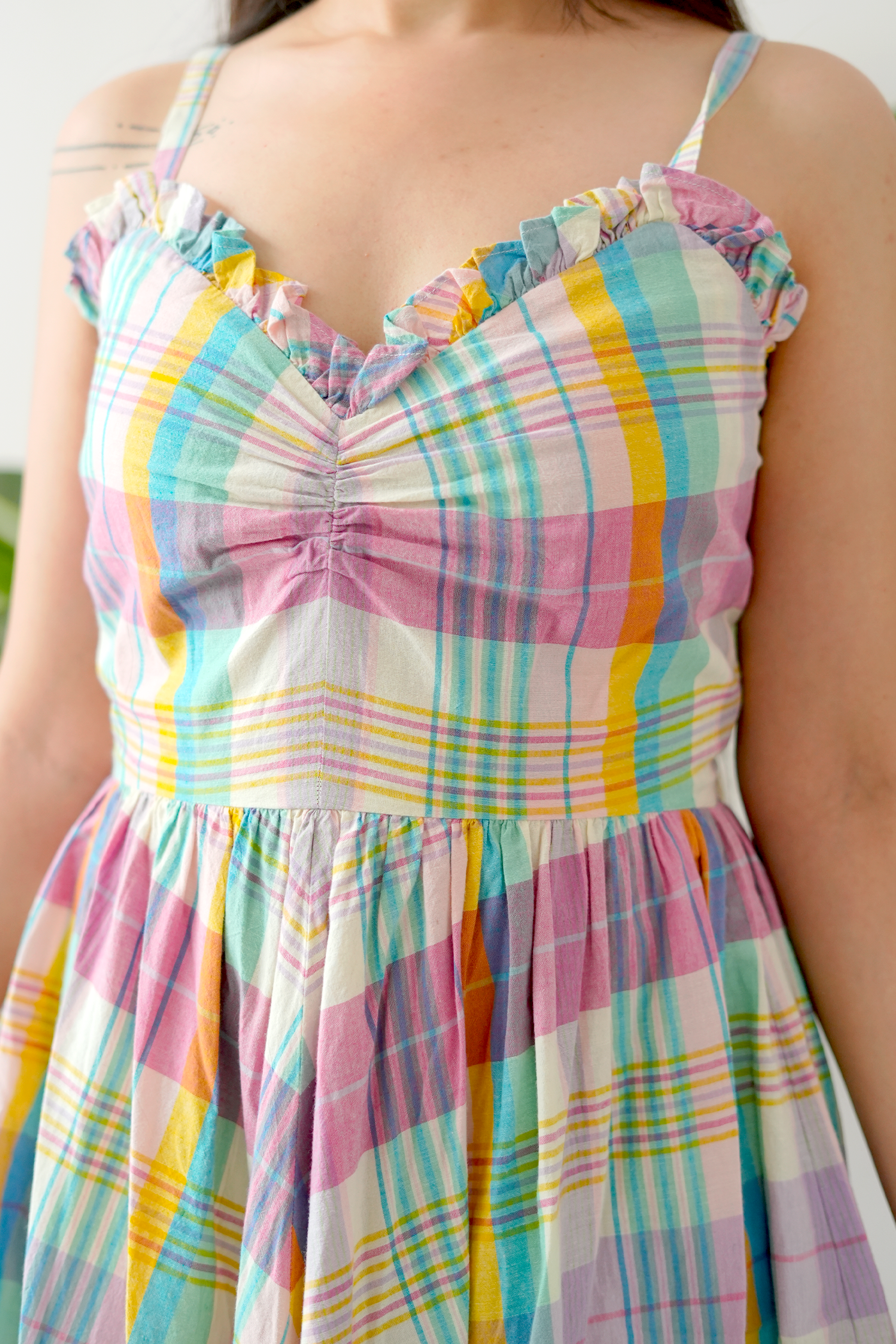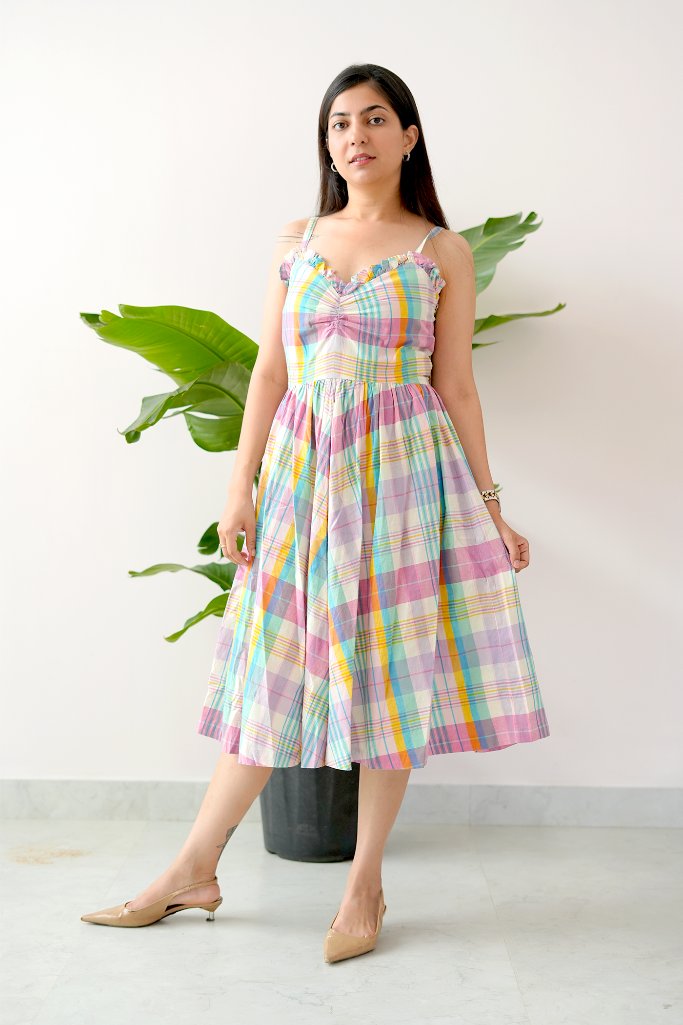 Channel your inner sunshine in the Farm Girl dress – a sweet, swingy number that brings carefree vibes wherever you go. With delicate ruffle details, a ruched bodice, and cheerful multicolor plaid, this cotton midi is made for golden-hour moments and slow, happy days.
