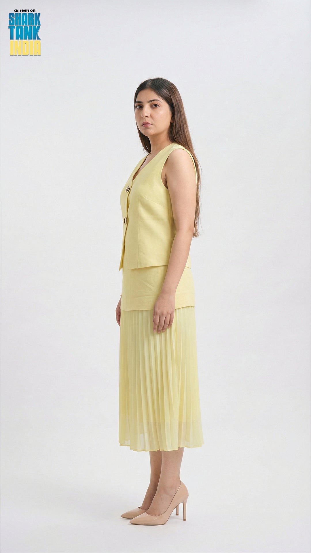 The set features a structured V-neck top with statement gold buttons, paired with a flowy pleated midi skirt.