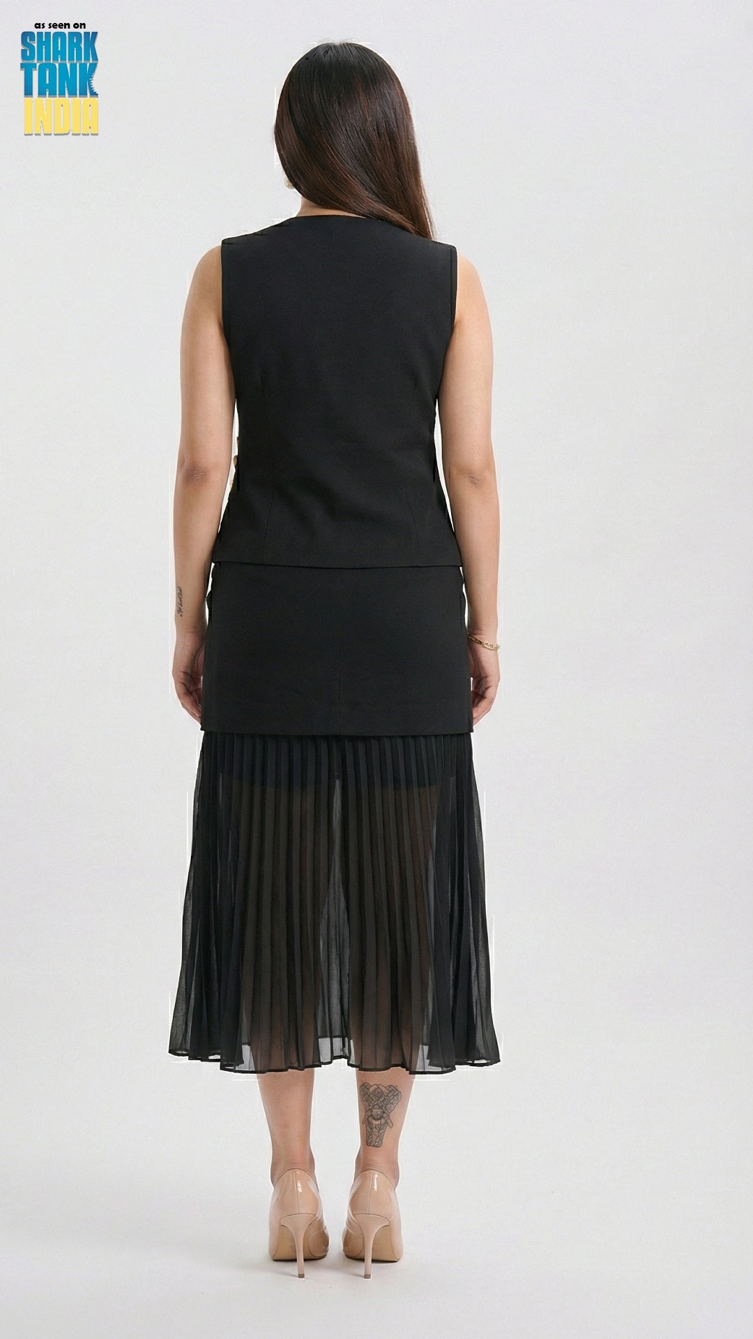 The pleated skirt creates soft, fluid movement and adds feminine charm, beautifully balancing the structured top.
