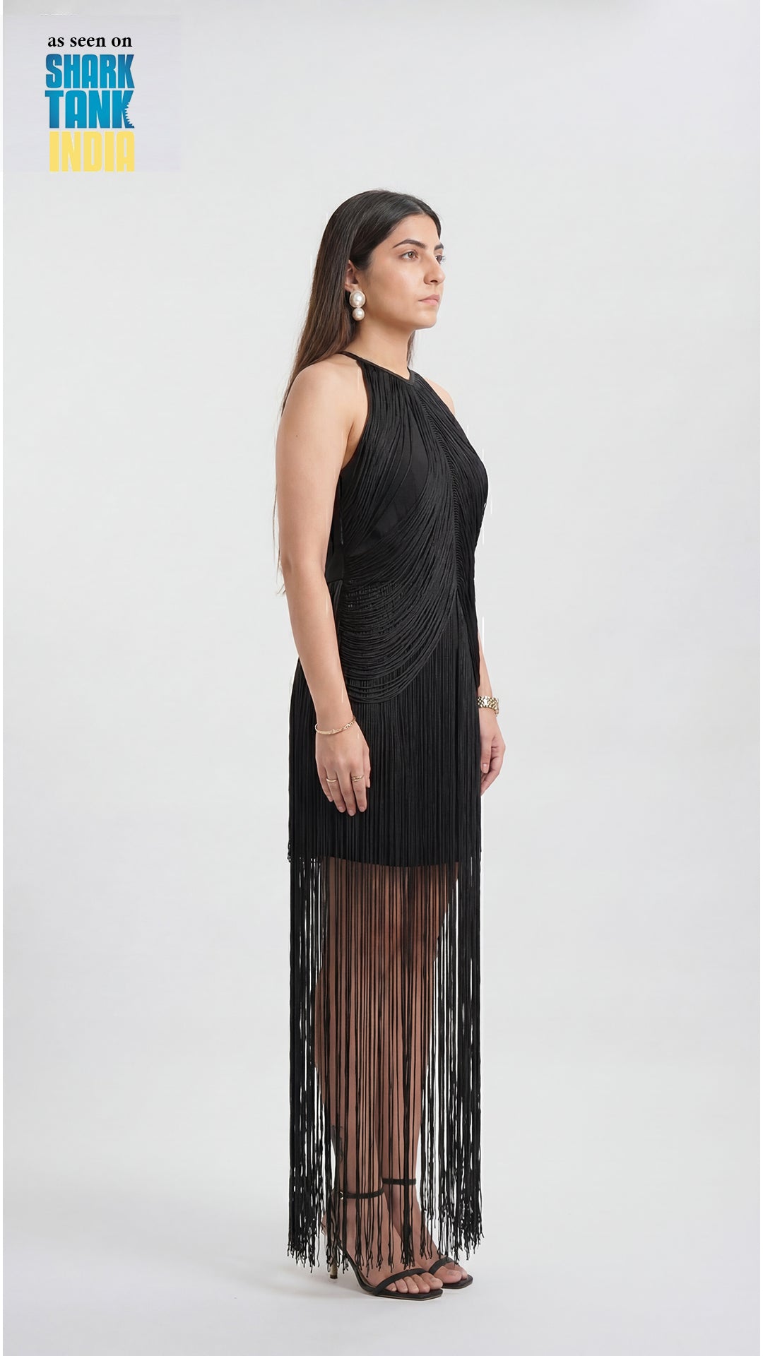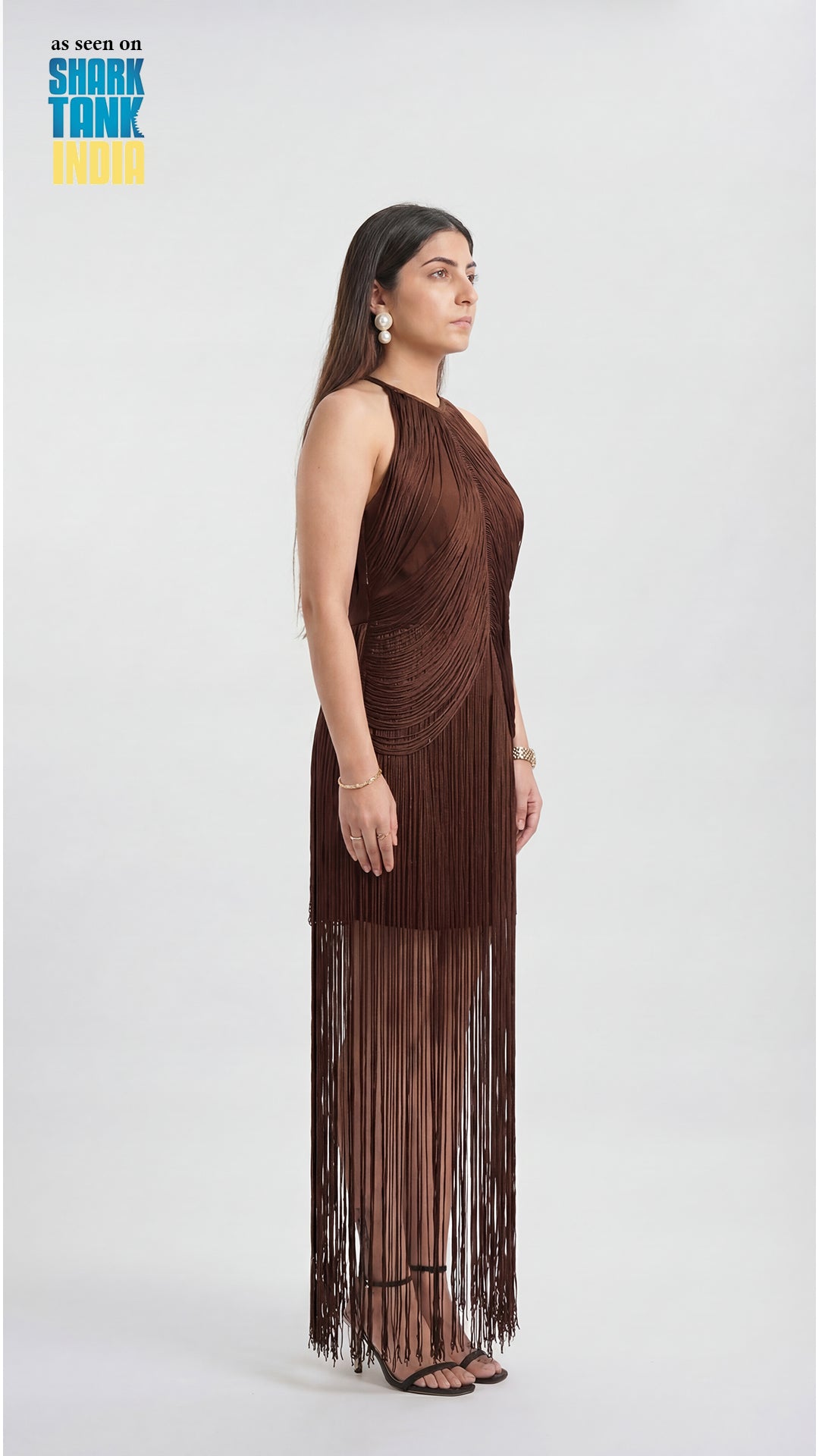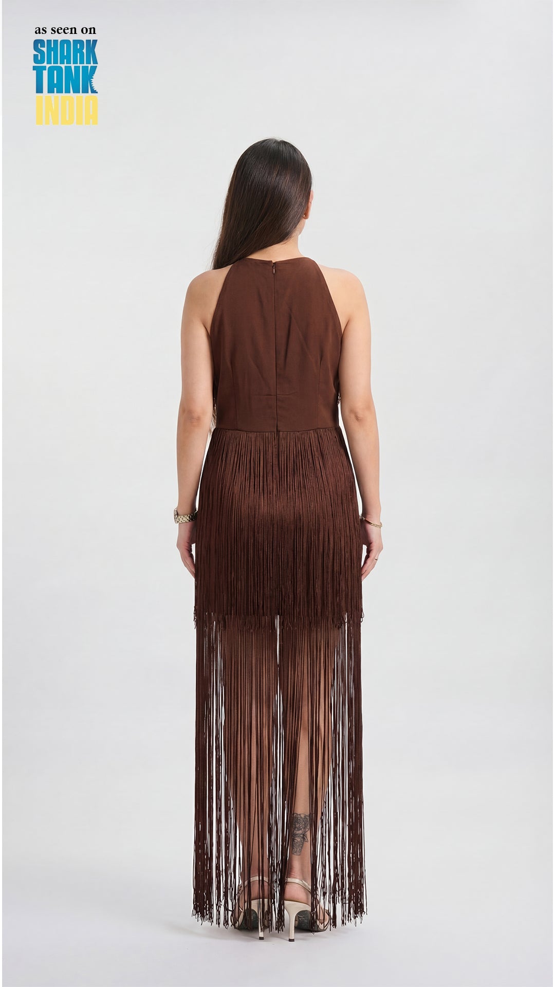 Crafted with a sleek, body-skimming silhouette, the dress is elevated by its halter neckline that beautifully frames the shoulders. The intricate fringe layering adds depth and texture, creating a fluid, eye-catching effect that feels both glamorous and modern. Whether you're heading to a cocktail evening, a party, or a special celebration, Fringes ensures all eyes are on you.