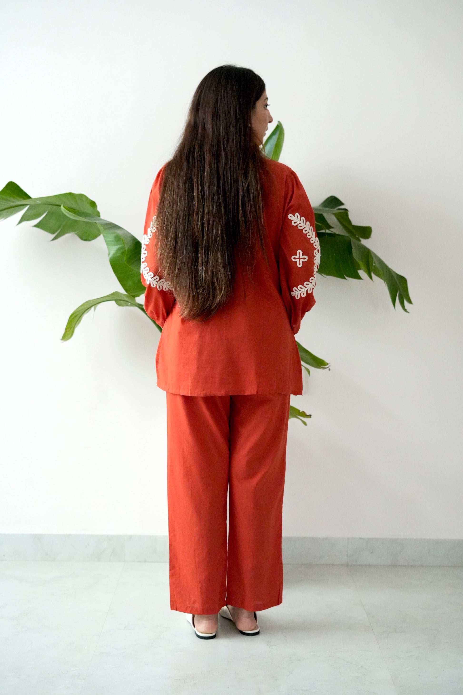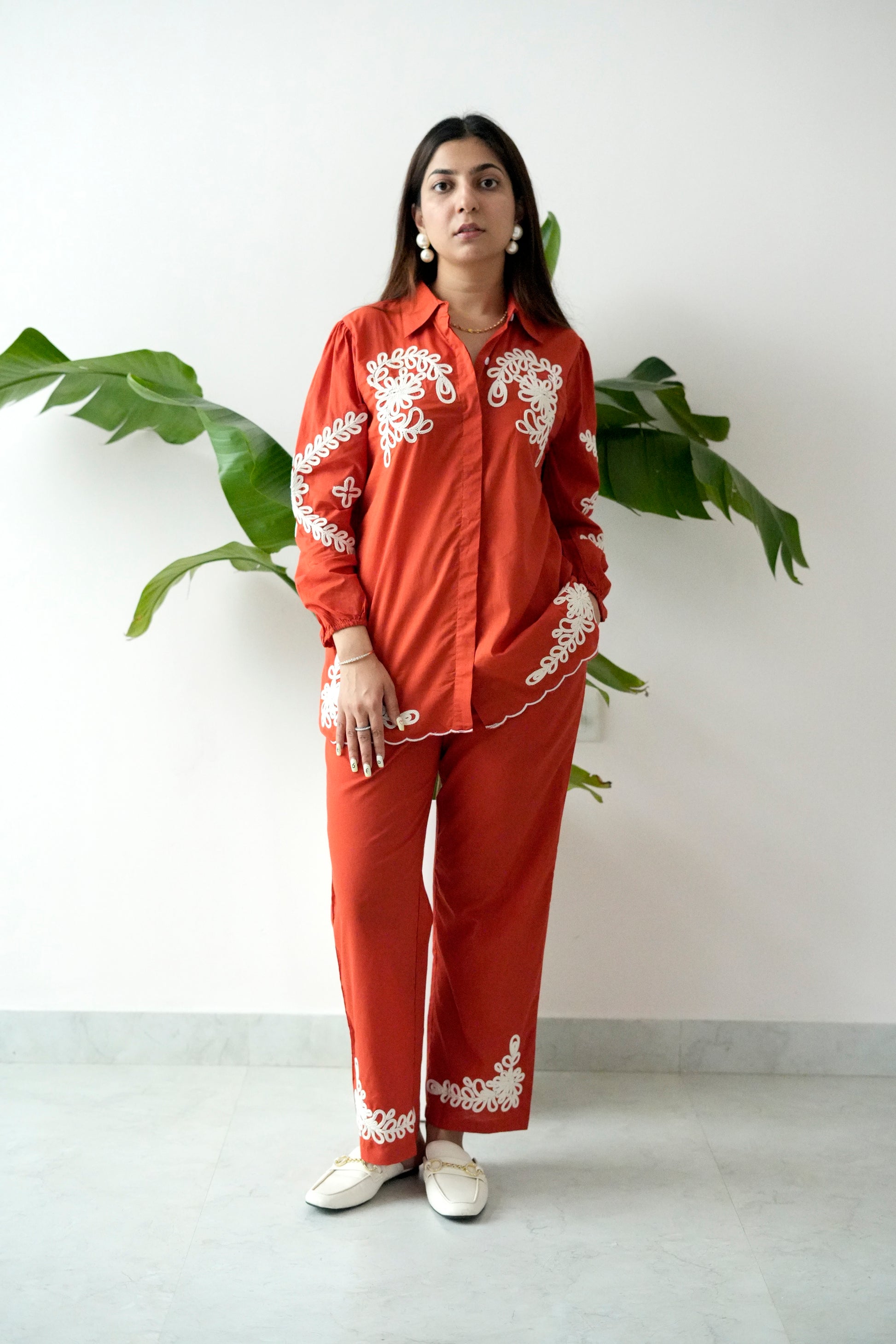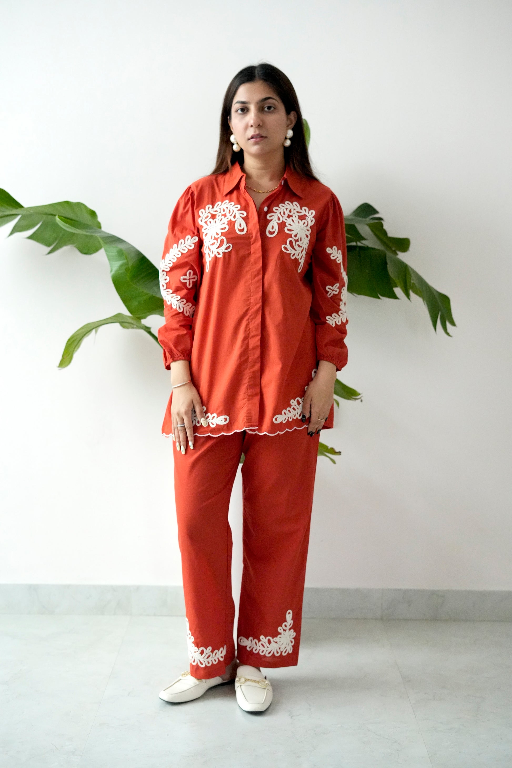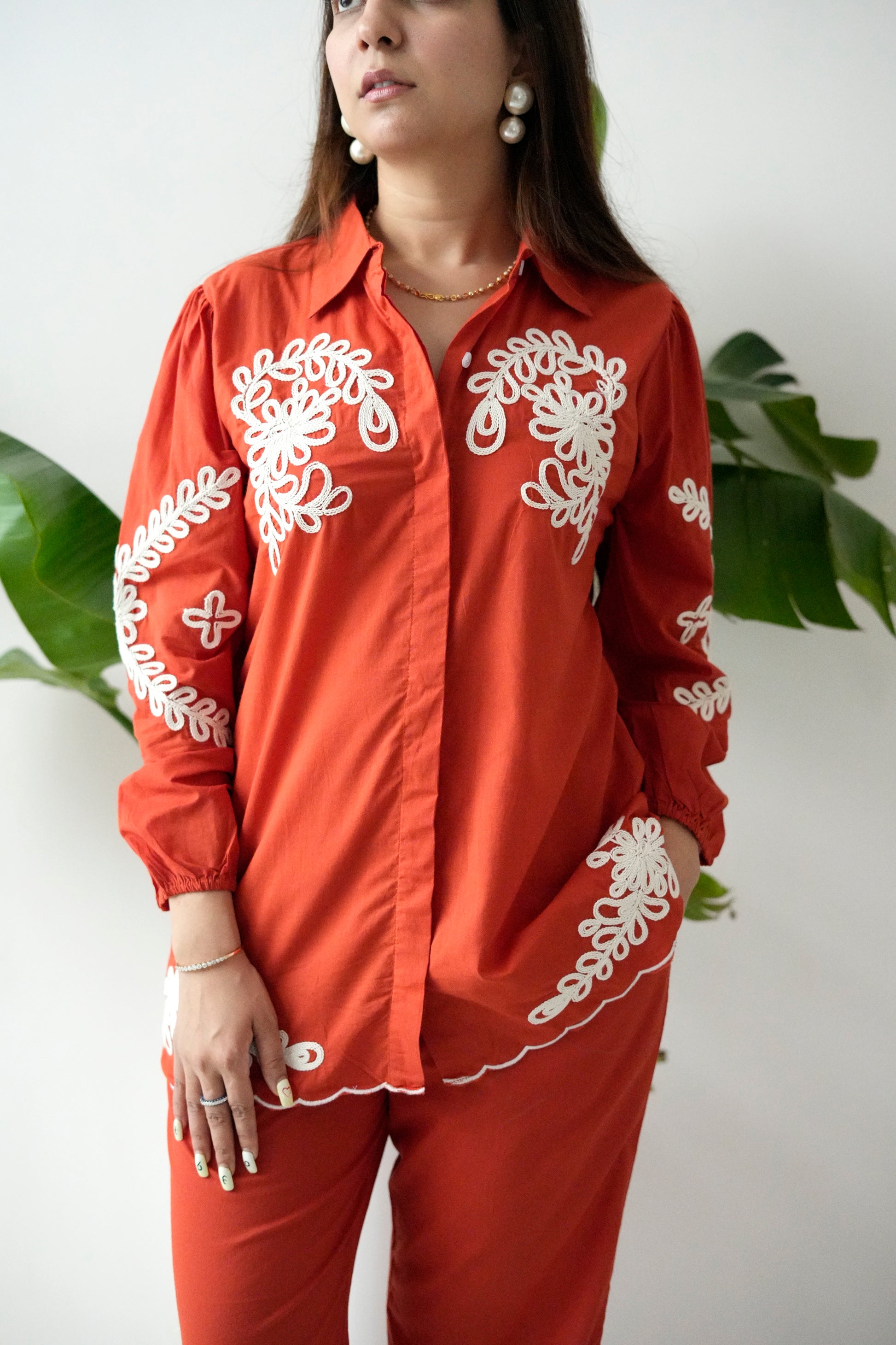 Crafted from breathable cotton fabric, the set features a collared shirt adorned with intricate contrast embroidery on the front, sleeves, and hem — paired with coordinated straight-fit trousers that mirror the same handcrafted detailing. Whether for brunches, travel, or casual gatherings, “Go To Go” is your perfect all-day outfit that feels as good as it looks.