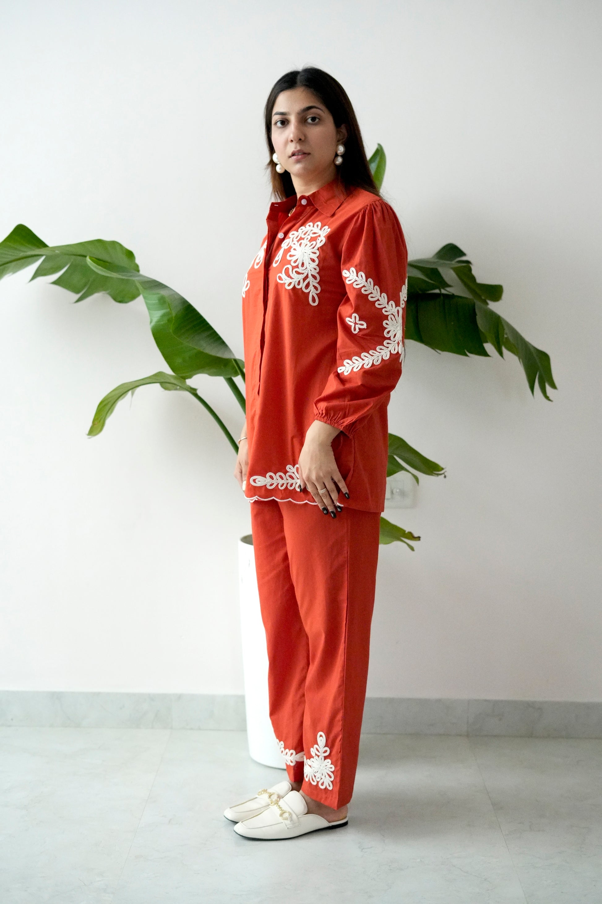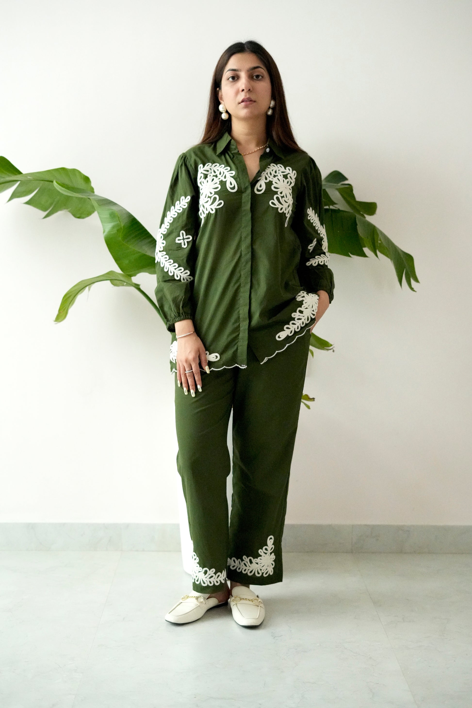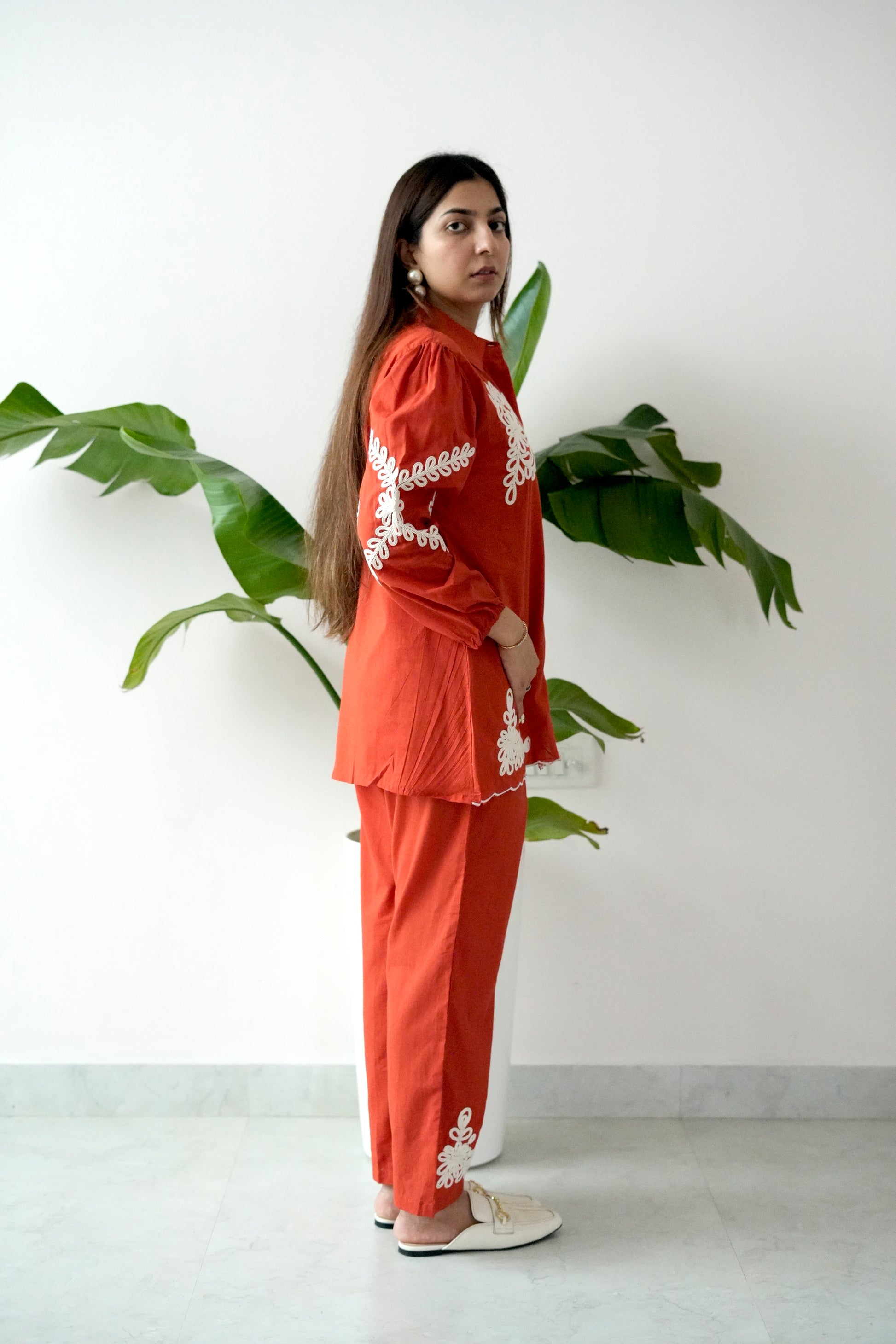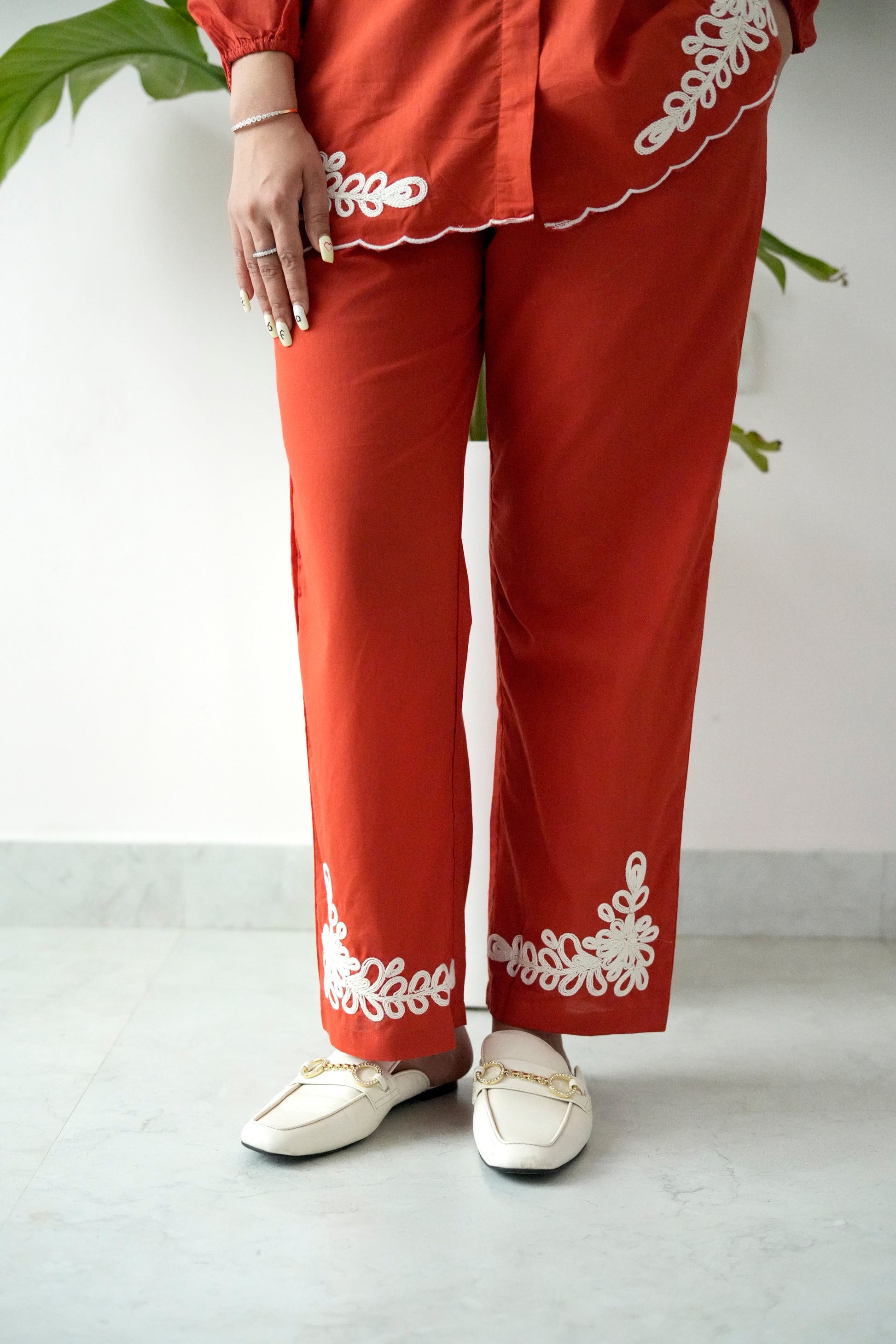 Crafted from breathable cotton fabric, the set features a collared shirt adorned with intricate contrast embroidery on the front, sleeves, and hem — paired with coordinated straight-fit trousers that mirror the same handcrafted detailing. Whether for brunches, travel, or casual gatherings, “Go To Go” is your perfect all-day outfit that feels as good as it looks.