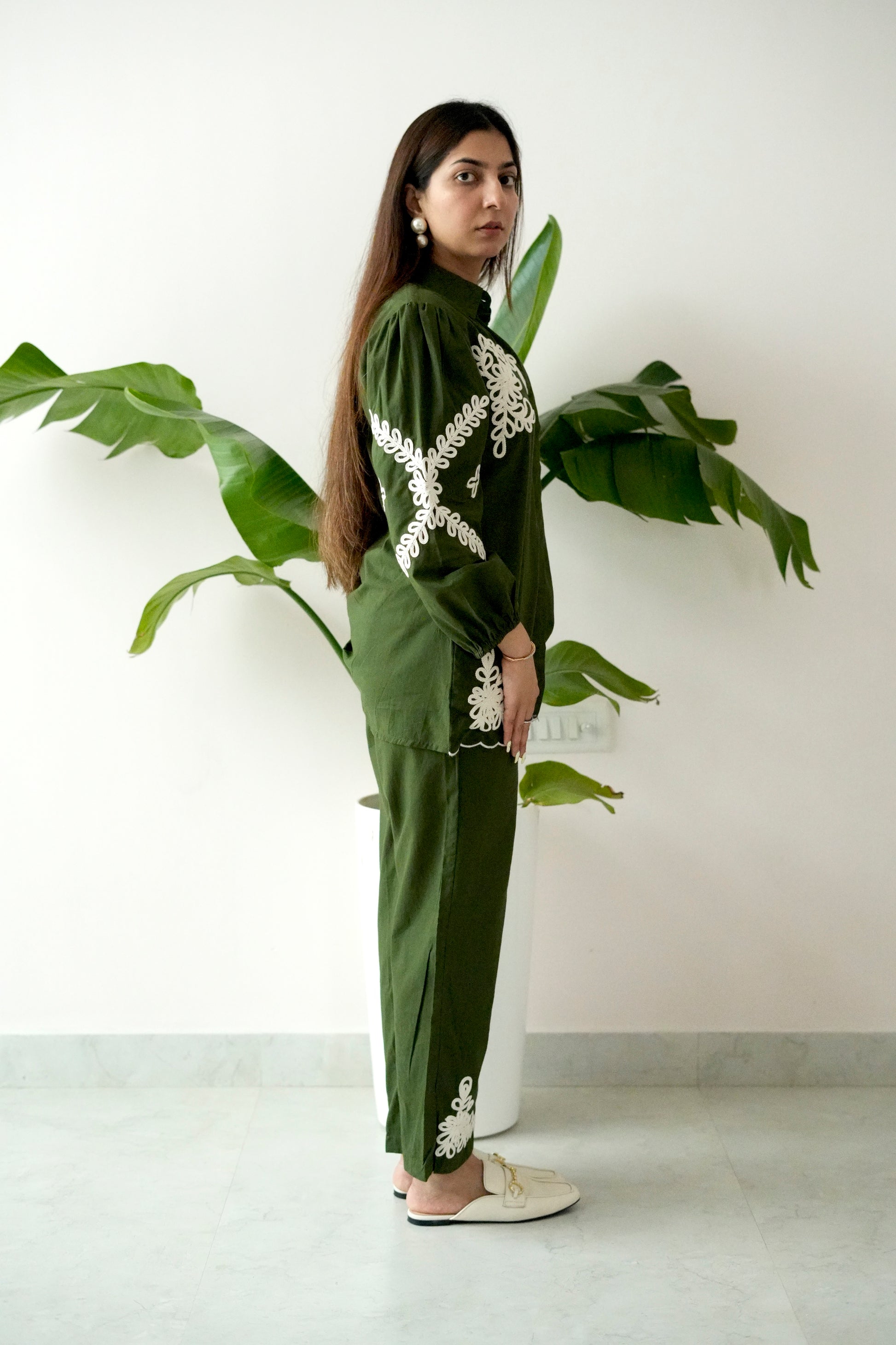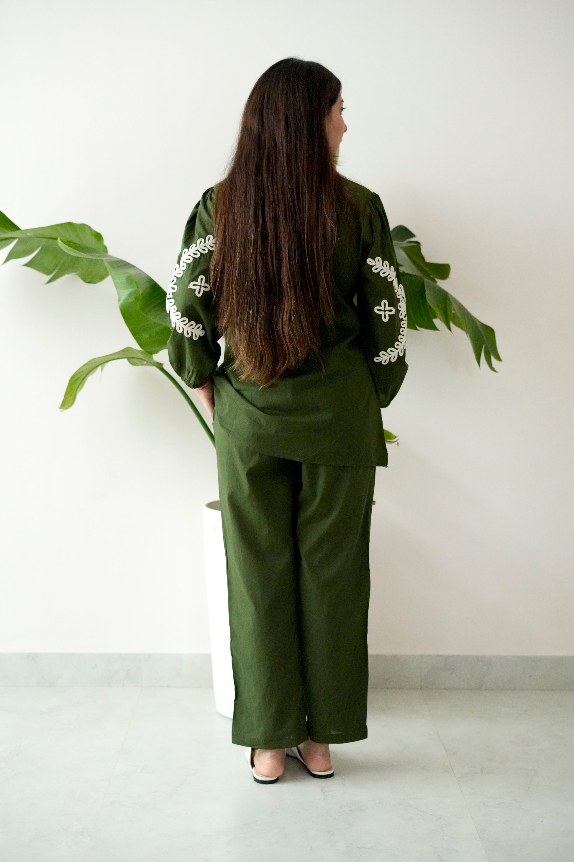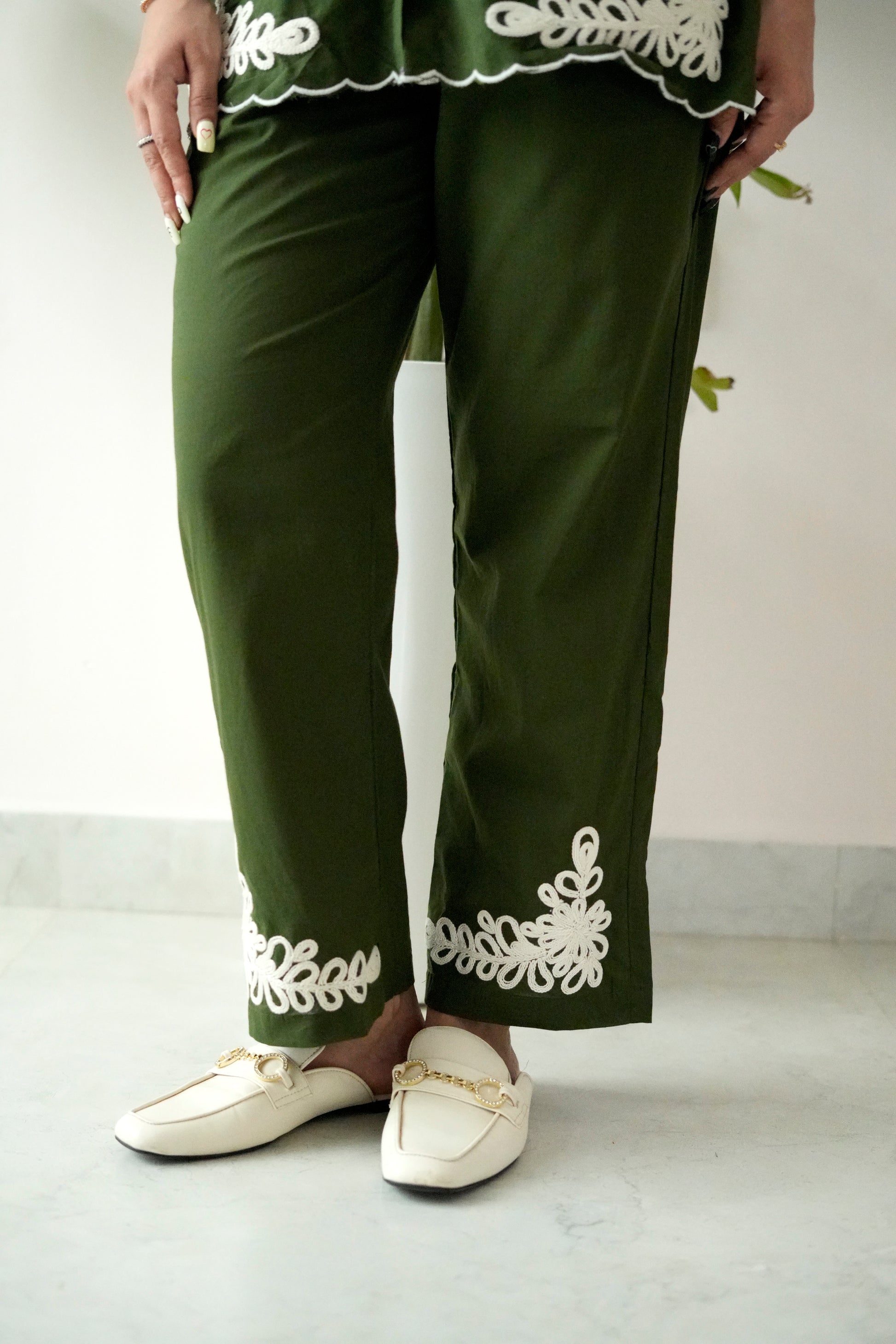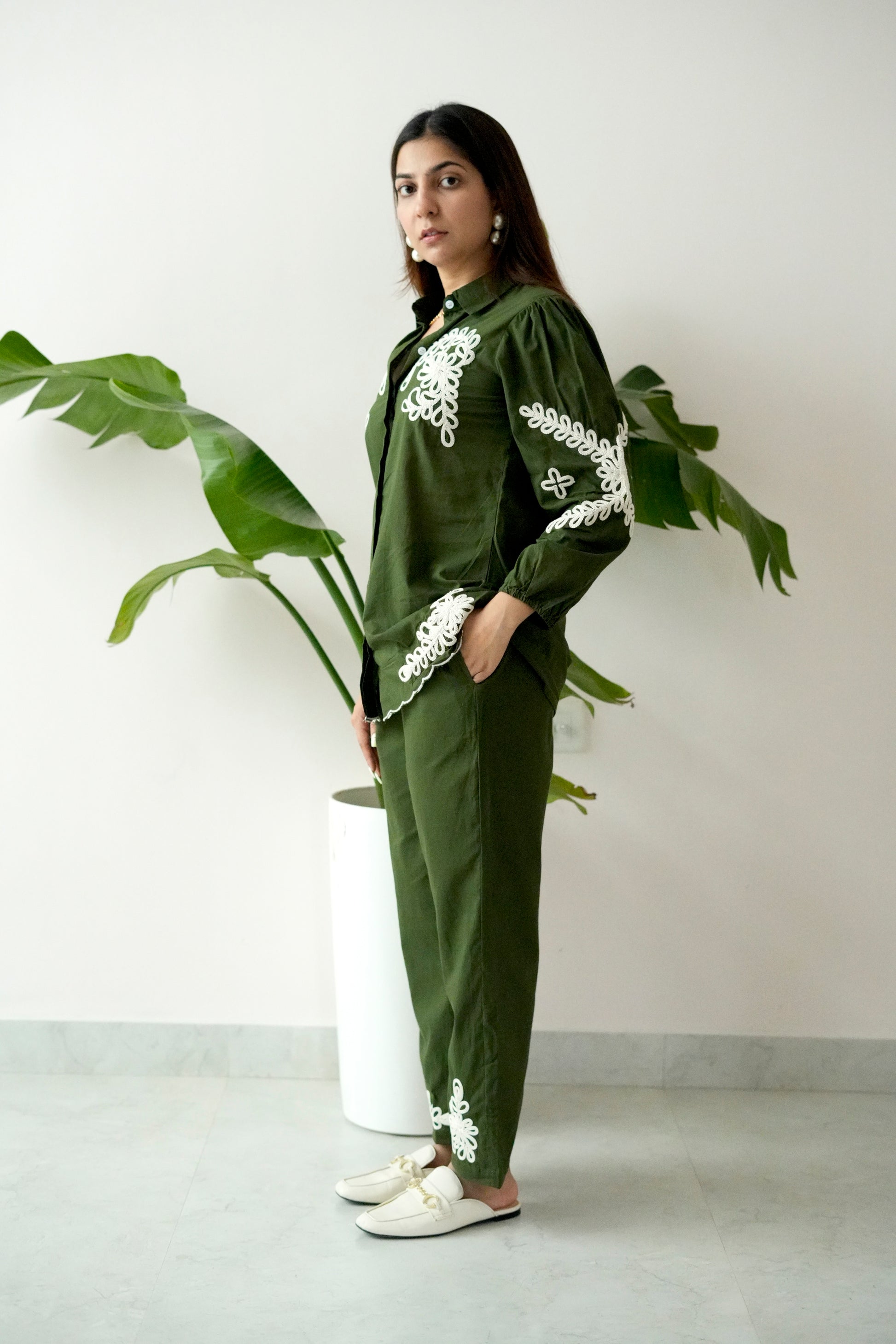 Crafted from breathable cotton fabric, the set features a collared shirt adorned with intricate contrast embroidery on the front, sleeves, and hem — paired with coordinated straight-fit trousers that mirror the same handcrafted detailing. Whether for brunches, travel, or casual gatherings, “Go To Go” is your perfect all-day outfit that feels as good as it looks.