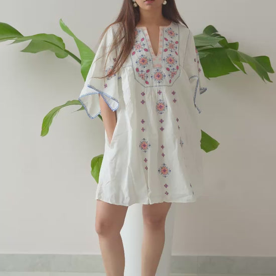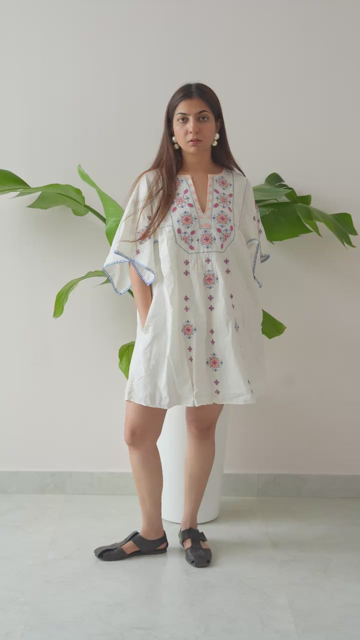 Give your wardrobe a vintage twist with our Grandmaa dress. This breezy cotton mini dress features charming floral embroidery, a flattering V-neckline, and flared sleeves with delicate detailing. Perfect for casual outings, vacations, or just a cozy day at home – it’s comfort and style, all in one.