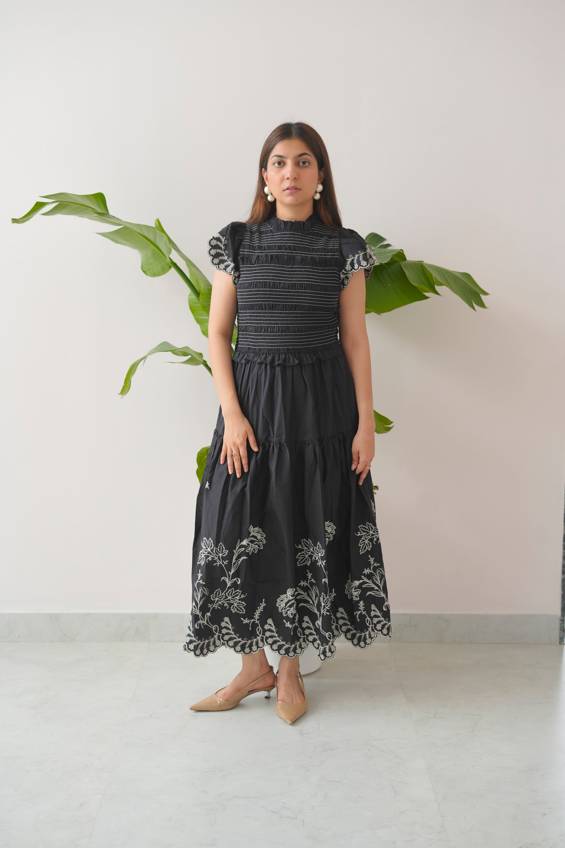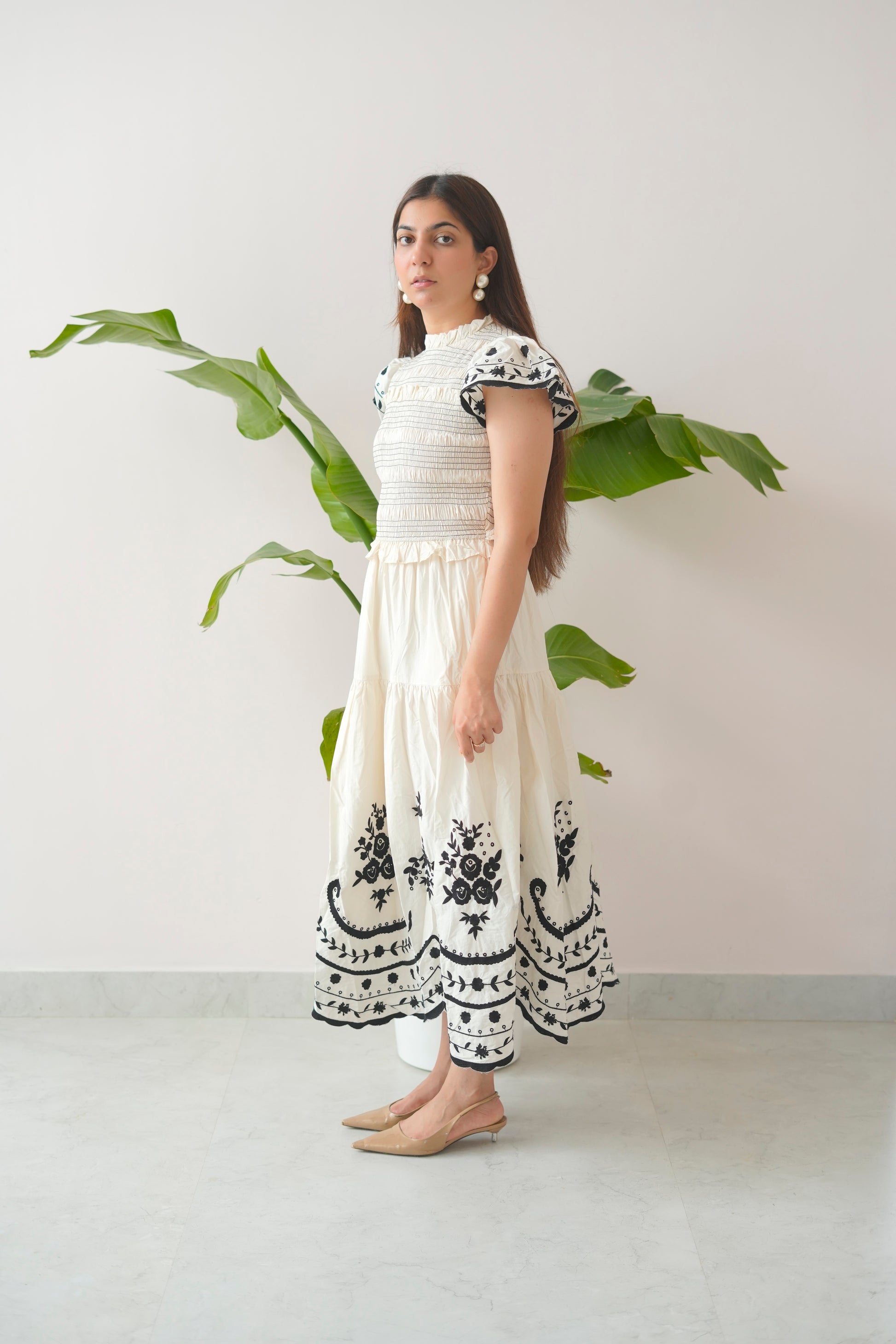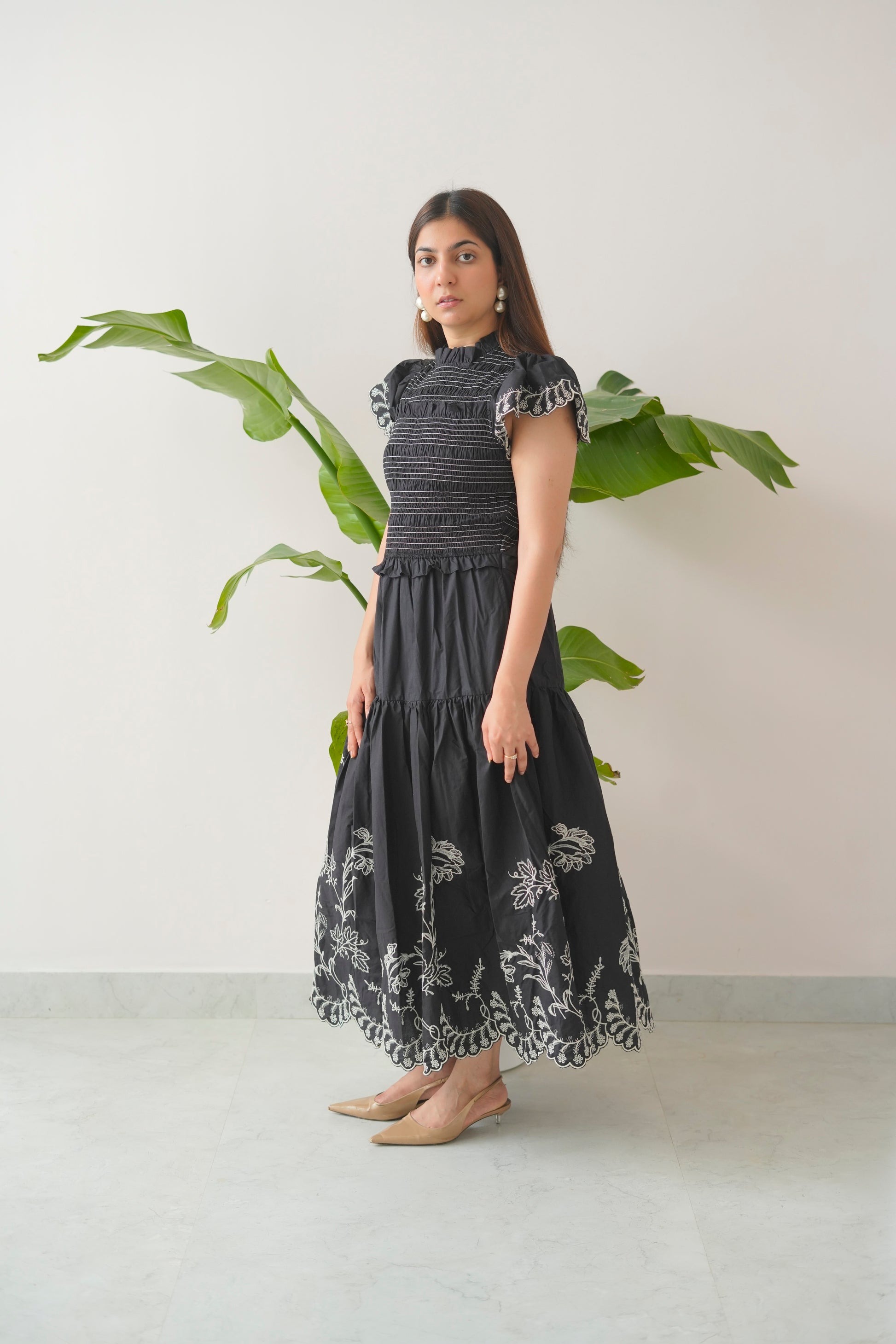 Crafted with a smocked bodice for a flattering fit, High Tight features delicate ruffled sleeves, tiered panels that move with ease, and bold embroidered hems that add a statement finish. Its high neck design adds a touch of sophistication, while the soft cotton fabric ensures breathable comfort all day long.