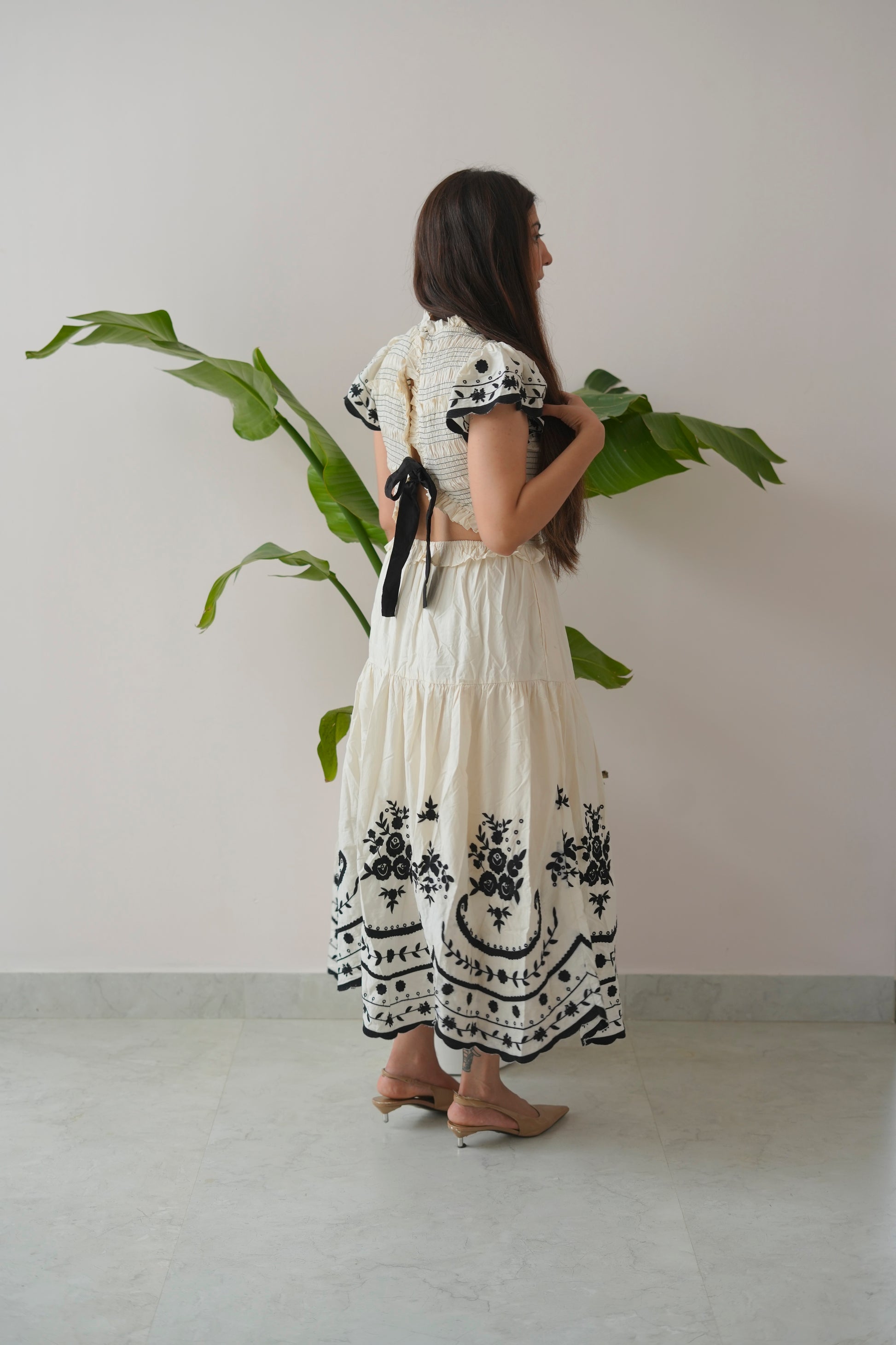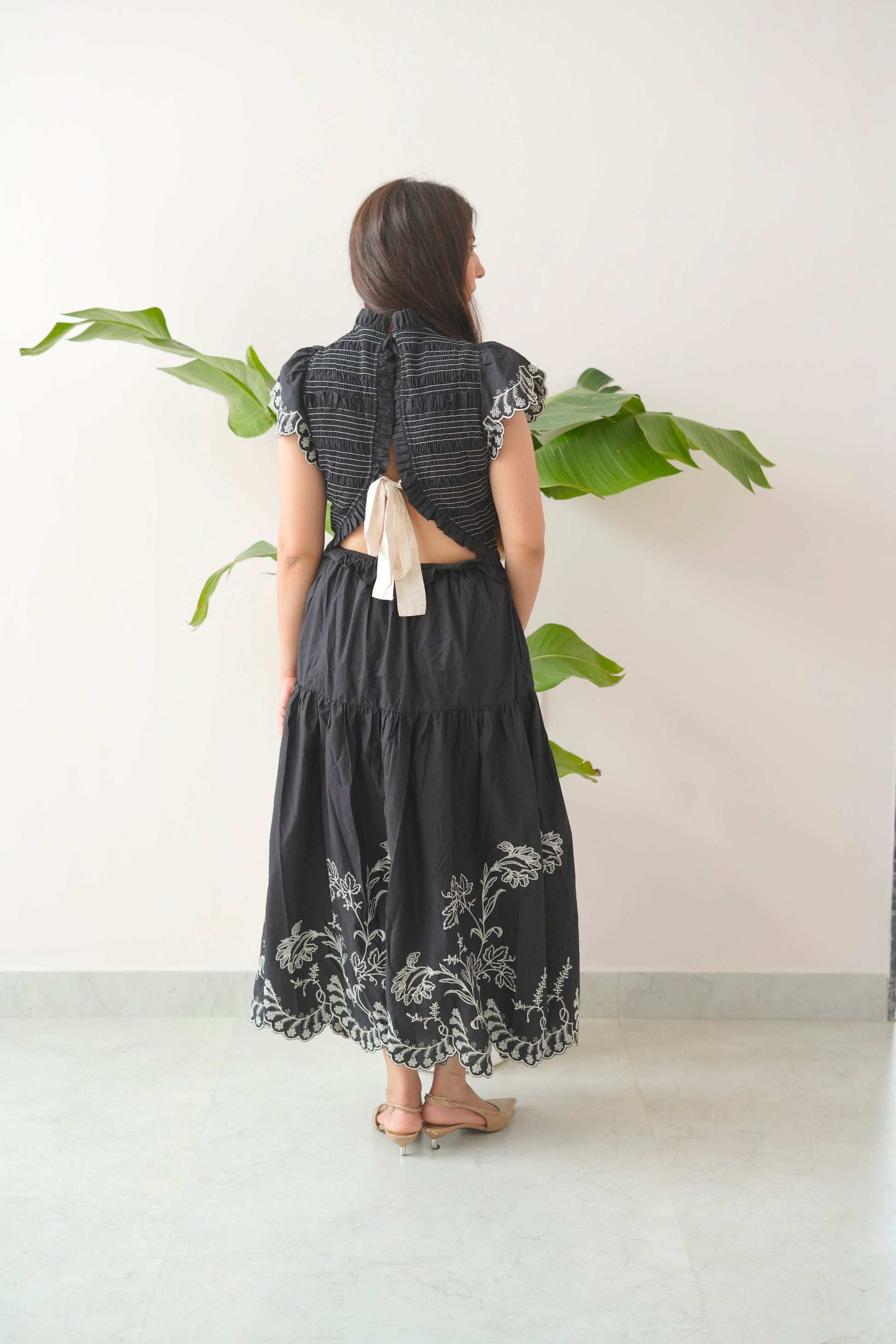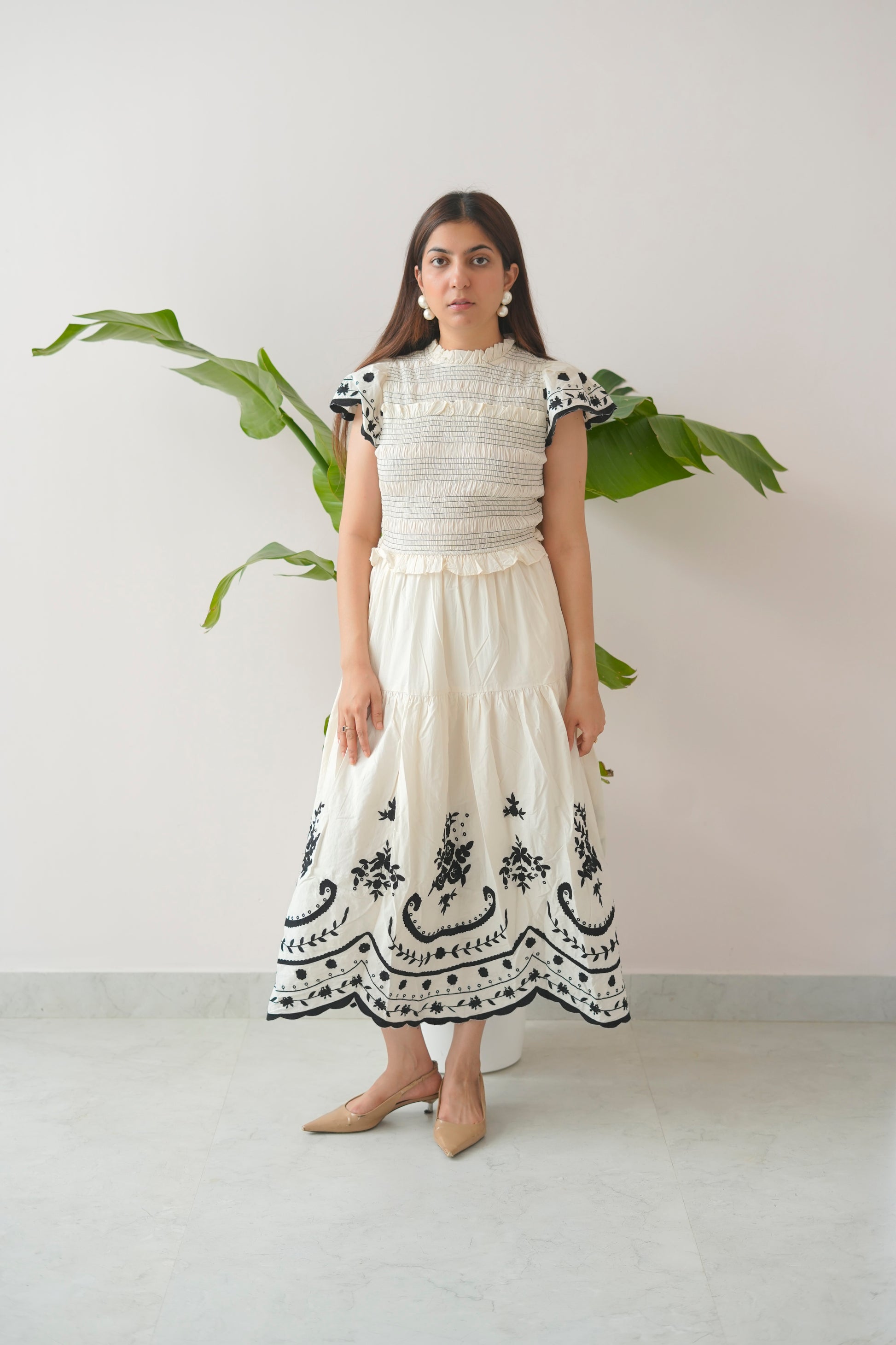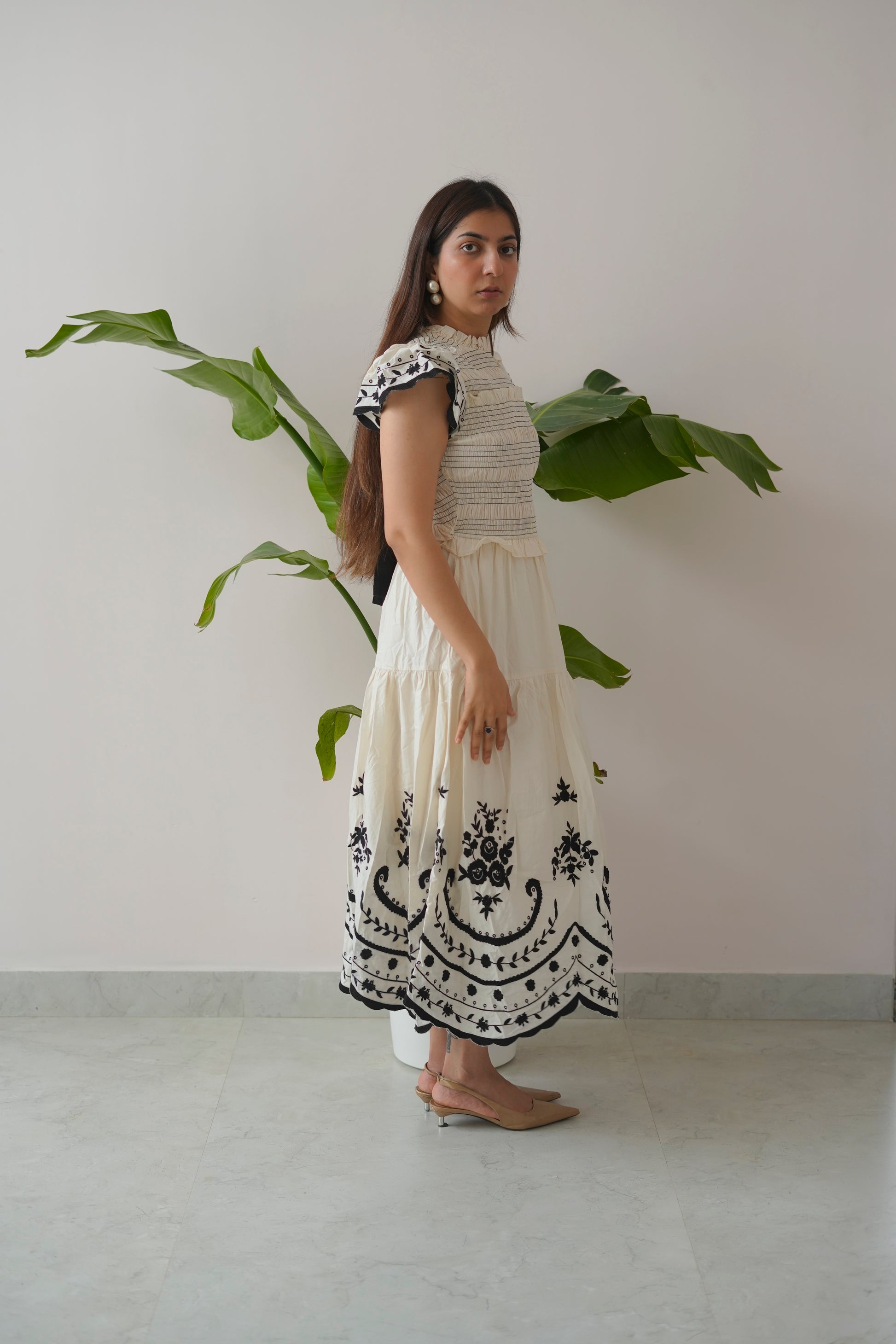 Crafted with a smocked bodice for a flattering fit, High Tight features delicate ruffled sleeves, tiered panels that move with ease, and bold embroidered hems that add a statement finish. Its high neck design adds a touch of sophistication, while the soft cotton fabric ensures breathable comfort all day long.