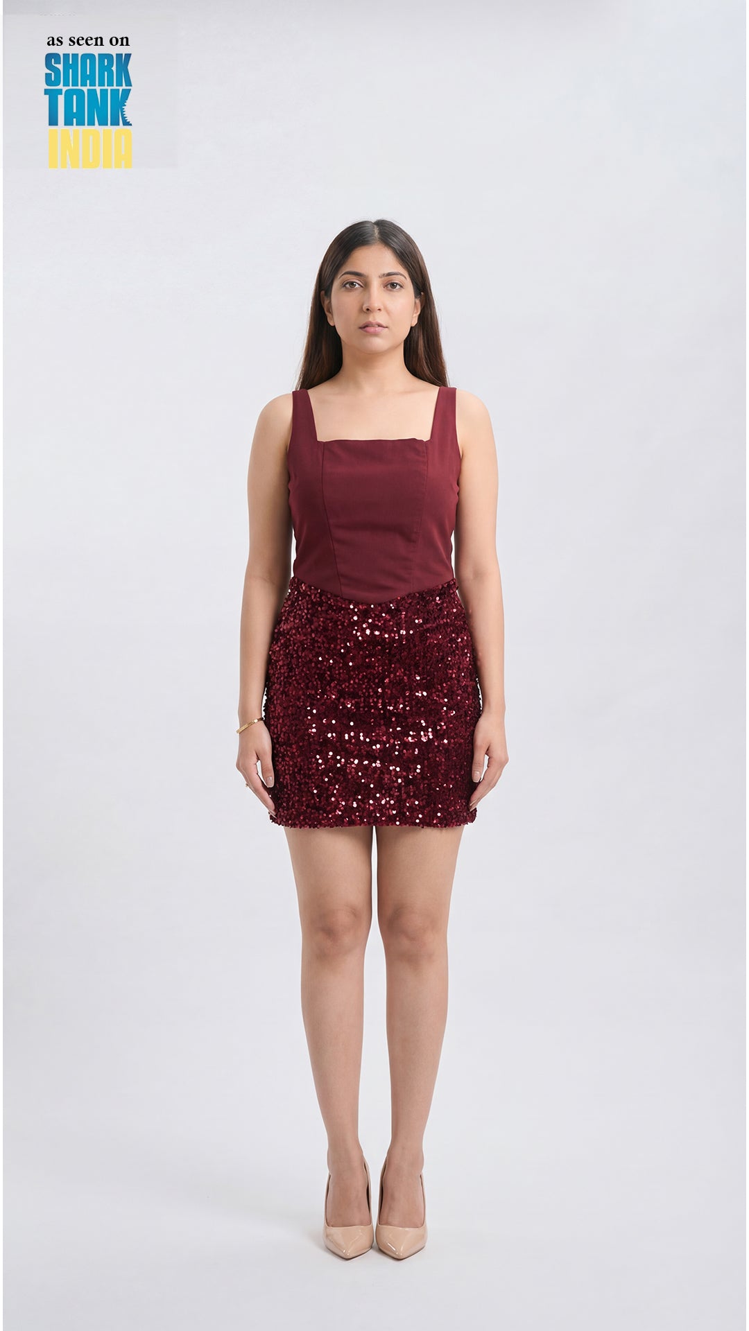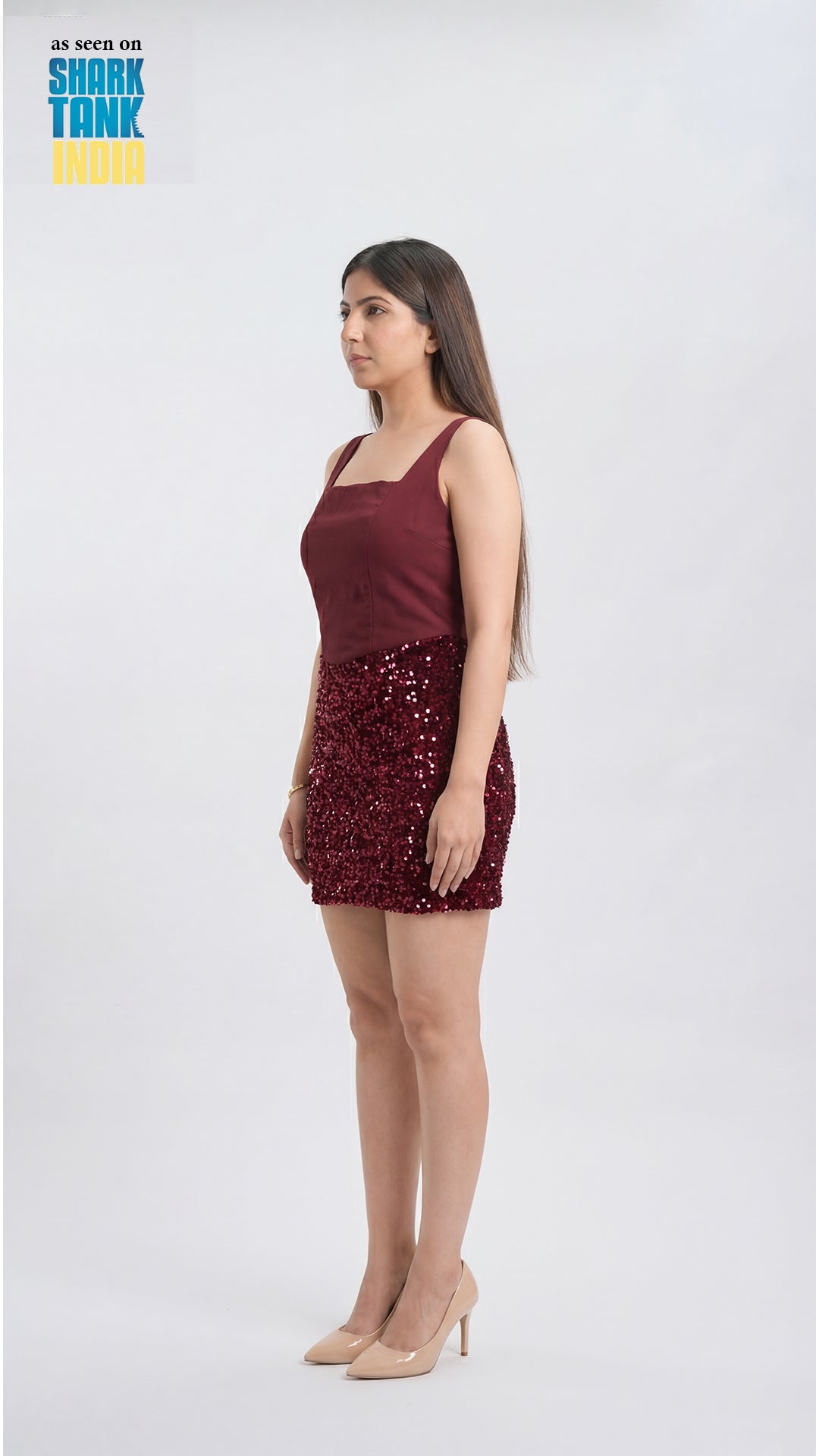 The fitted top features a clean, square neckline with broad straps, offering a modern, flattering frame for the shoulders and décolletage. As the silhouette flows downward, it transitions into a statement mini skirt adorned with intricate sequin detailing that catches the light from every angle. The contrast in textures adds depth and drama, making every step feel like a moment.
