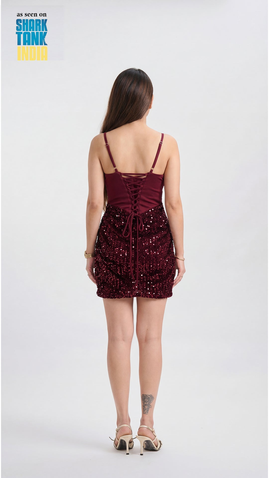 Turn up the heat with Laced Up, a dress designed for nights that demand bold elegance and undeniable presence. This striking piece blends a sleek, structured bodice with a dazzling sequined skirt—creating the perfect balance between refined sophistication and high-impact glamour. Drenched in a rich crimson hue, Laced Up is made to stand out, shimmer, and സ്വന്ത the spotlight with confidence.