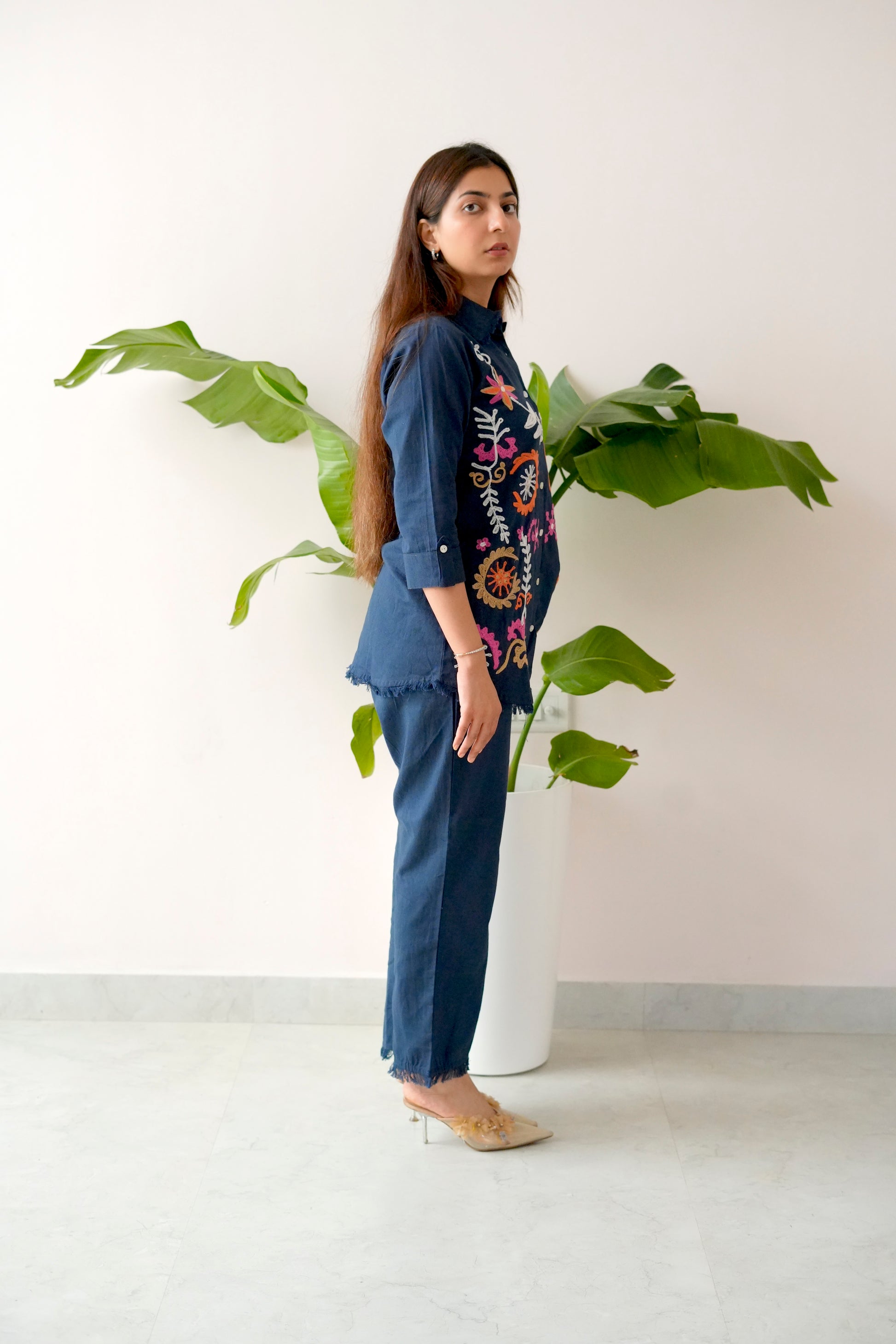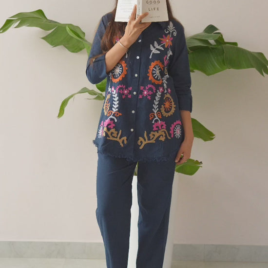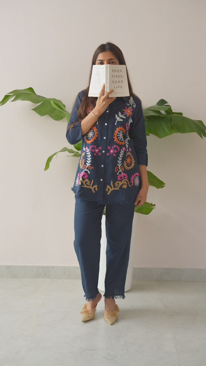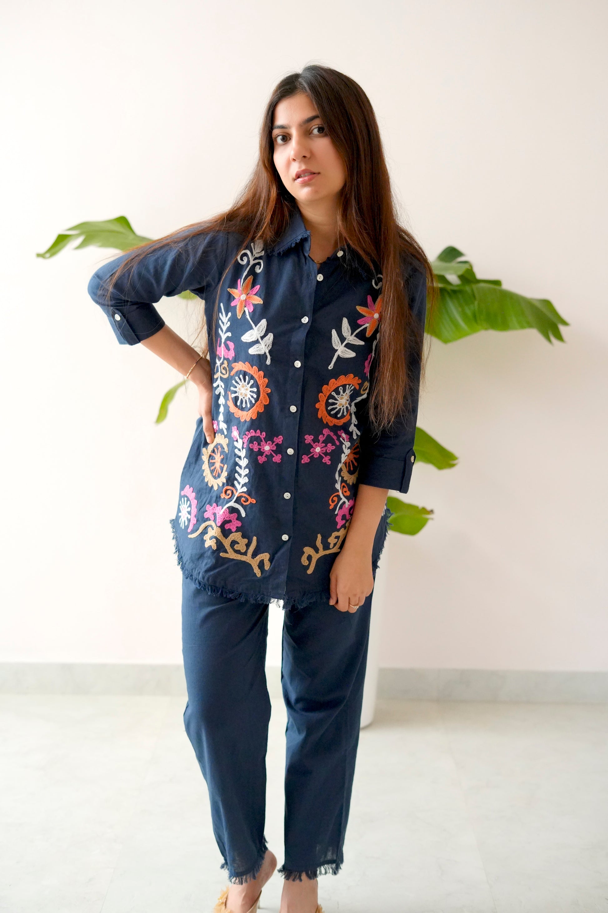Make a bold statement with our Lashkar Coord Set, a perfect fusion of comfort and contemporary ethnic style. This two-piece ensemble features a deep navy base adorned with vibrant, intricate embroidery that tells a story of tradition and artistry.