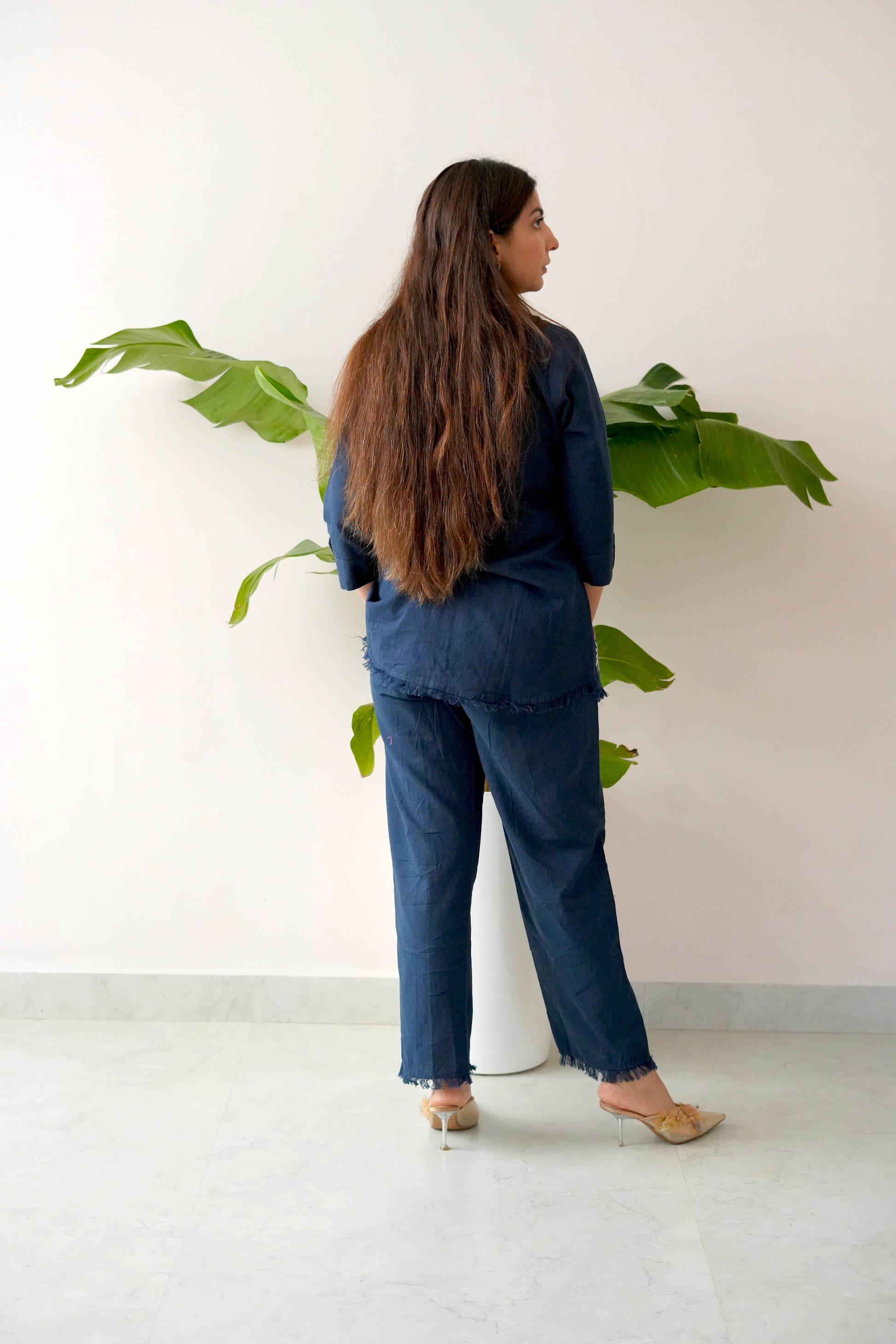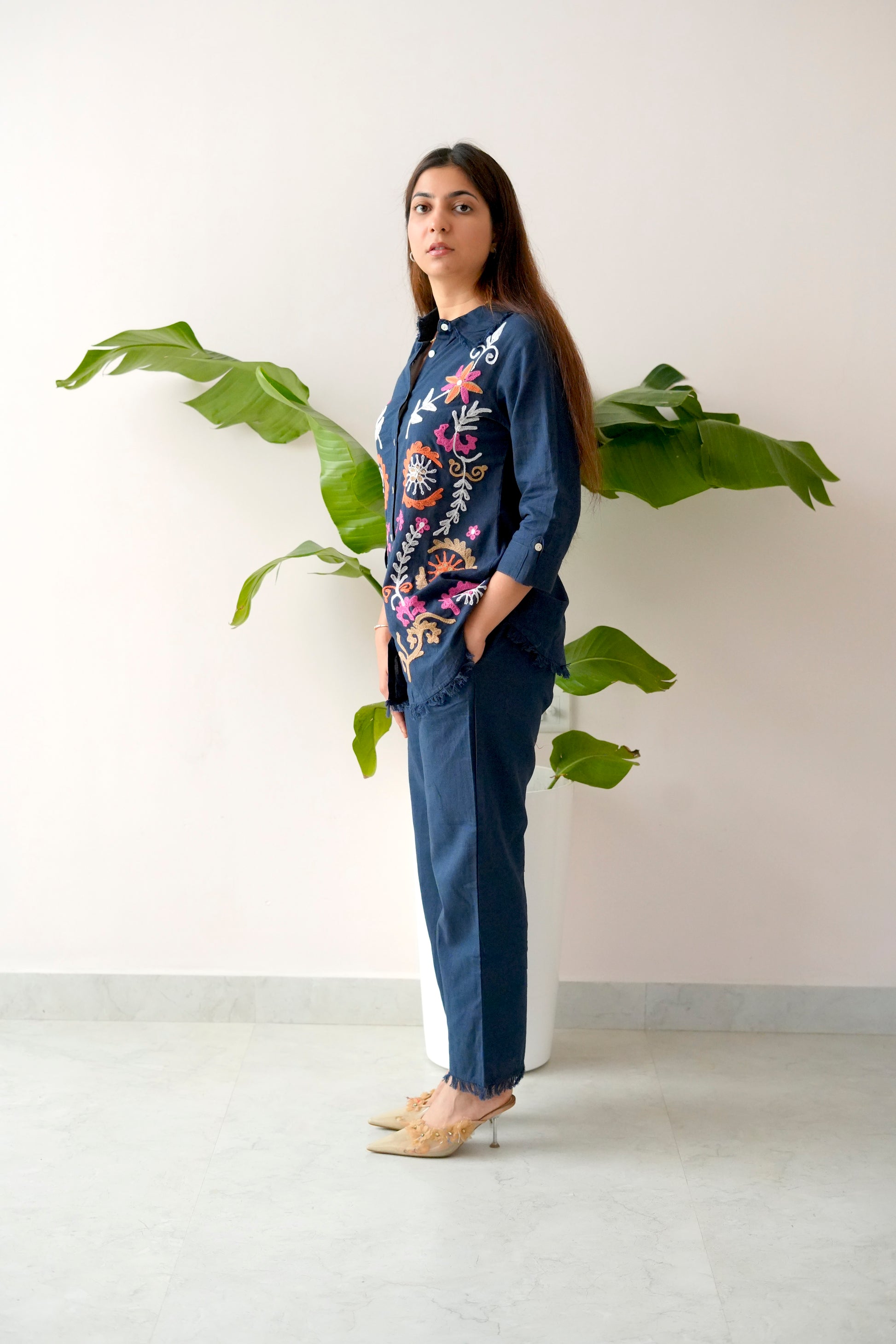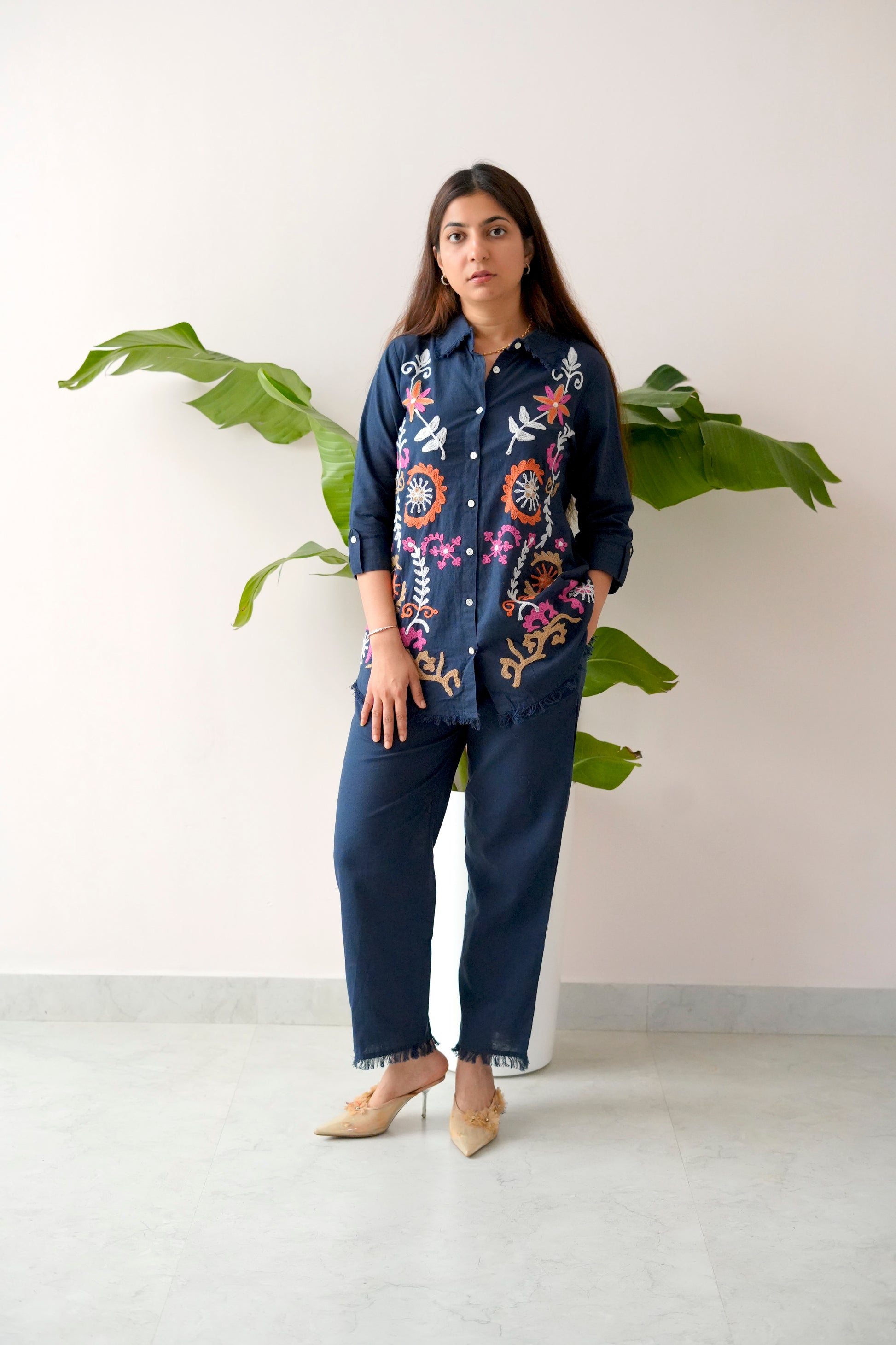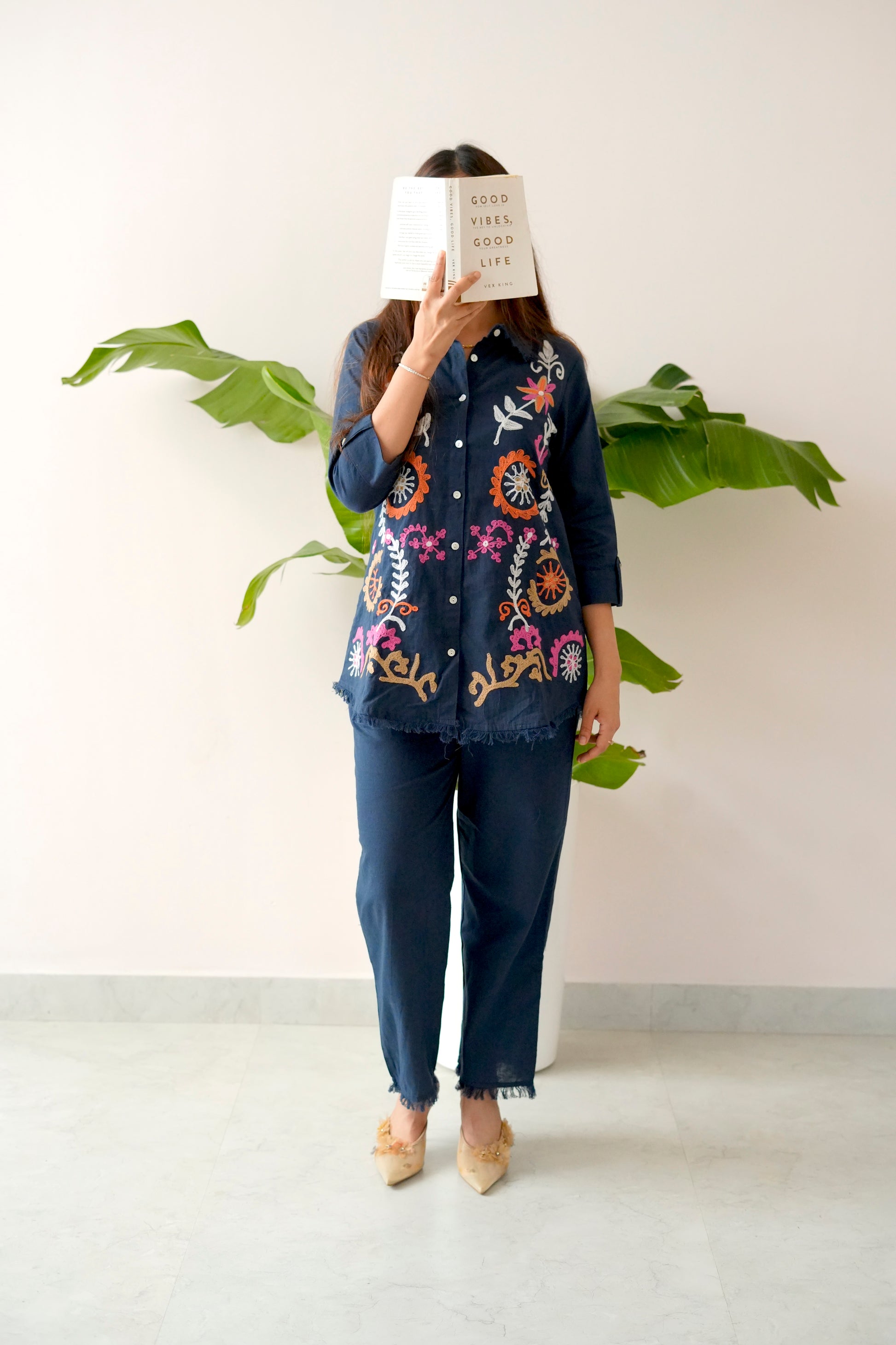 Make a bold statement with our Lashkar Coord Set, a perfect fusion of comfort and contemporary ethnic style. This two-piece ensemble features a deep navy base adorned with vibrant, intricate embroidery that tells a story of tradition and artistry.
