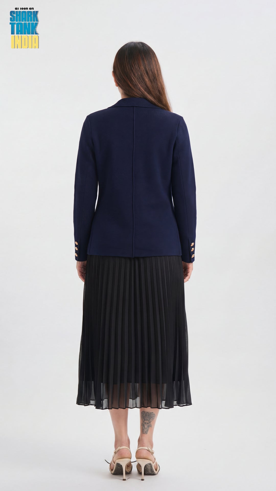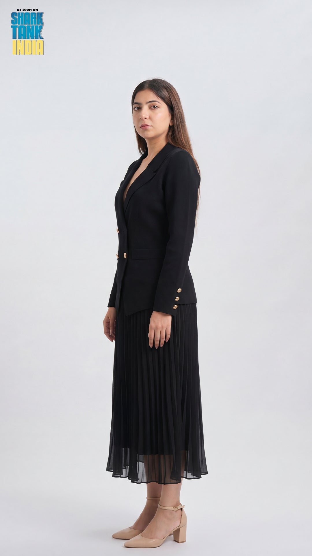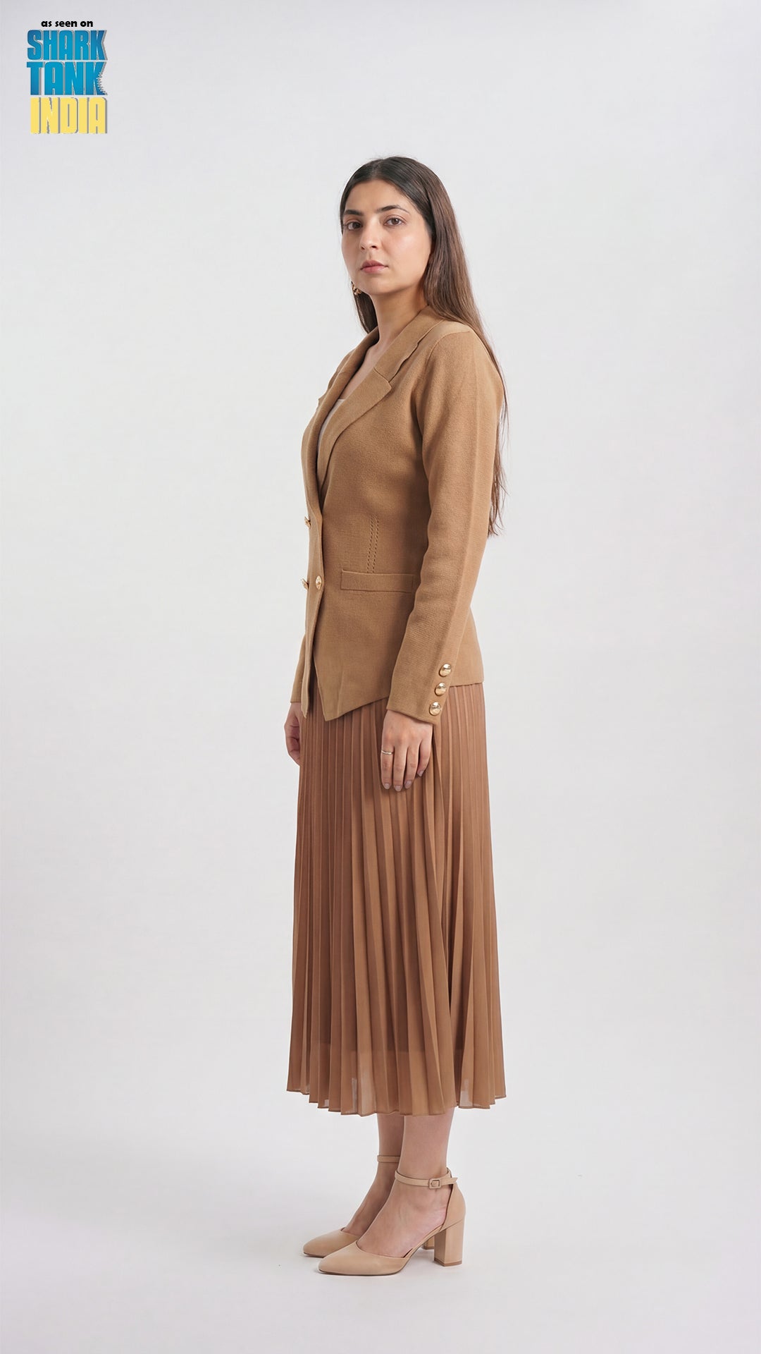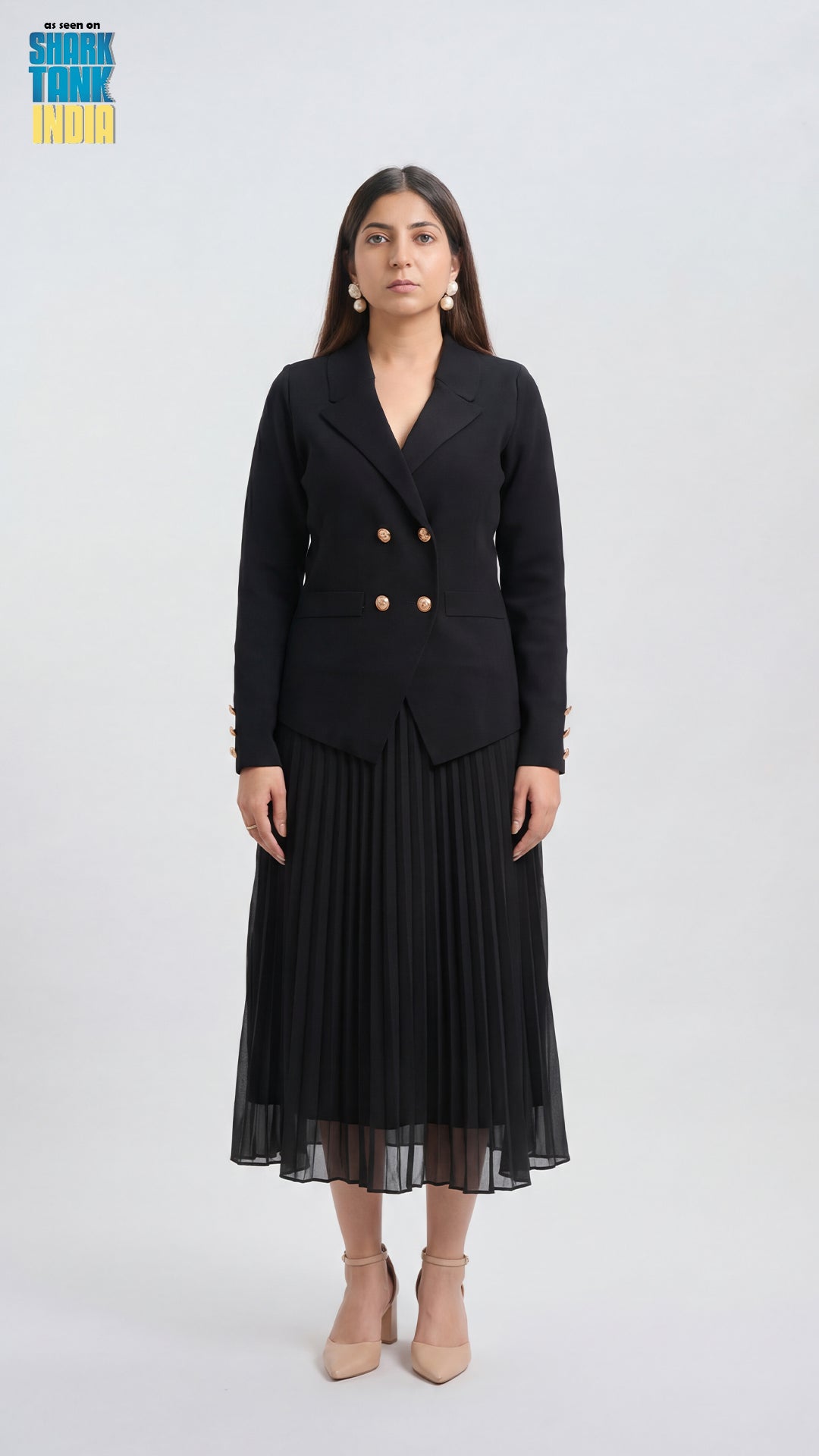 The set features a solid structured blazer paired with a flowy pleated midi skirt.