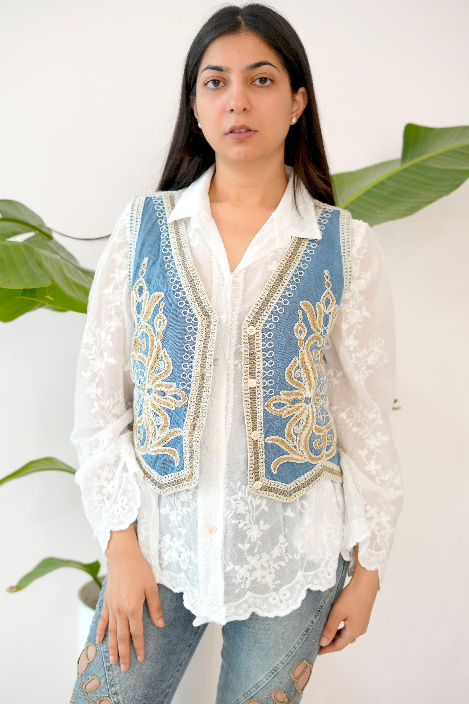 Crafted in soft blue denim with intricate threadwork in ivory and gold tones, it's designed to instantly elevate your basics. Throw it over shirts, kurtas, or even plain tees β and watch your outfit transform.