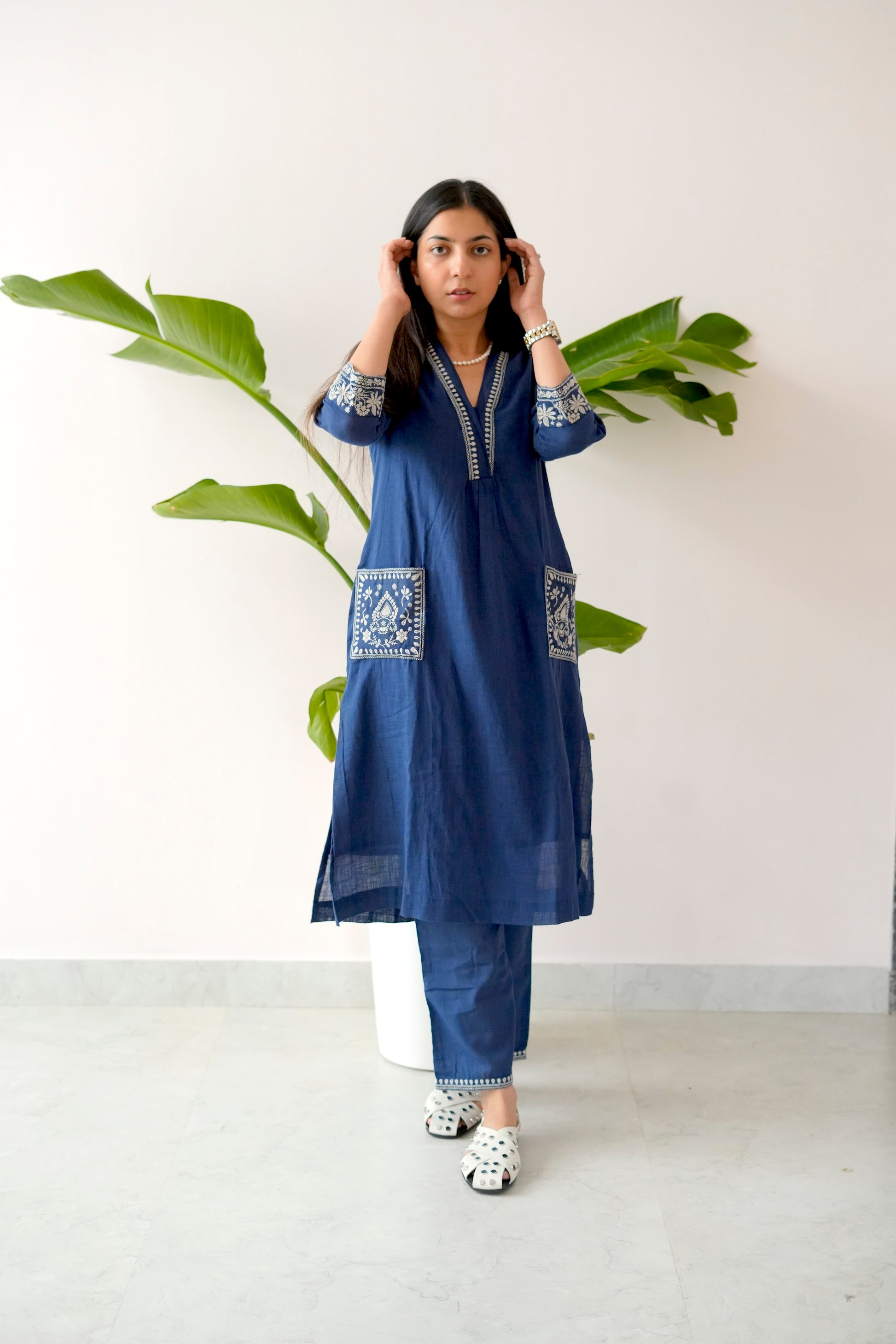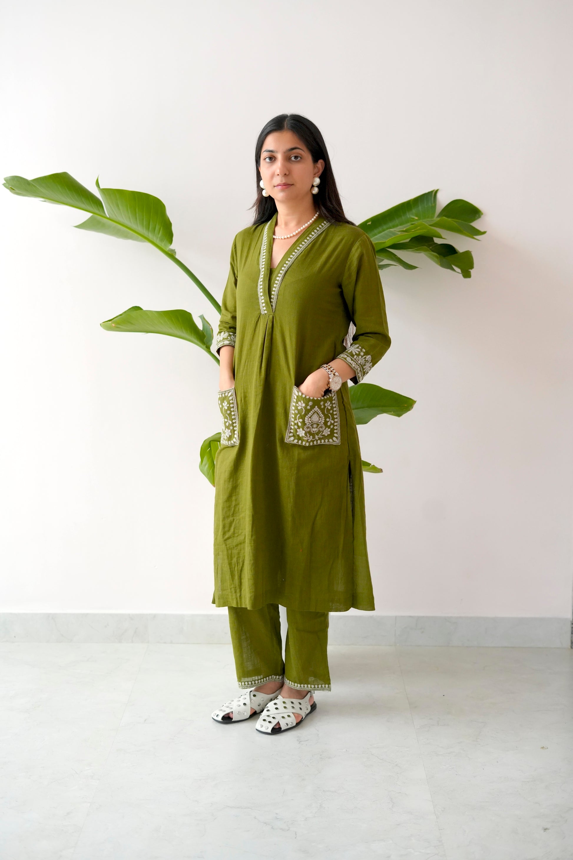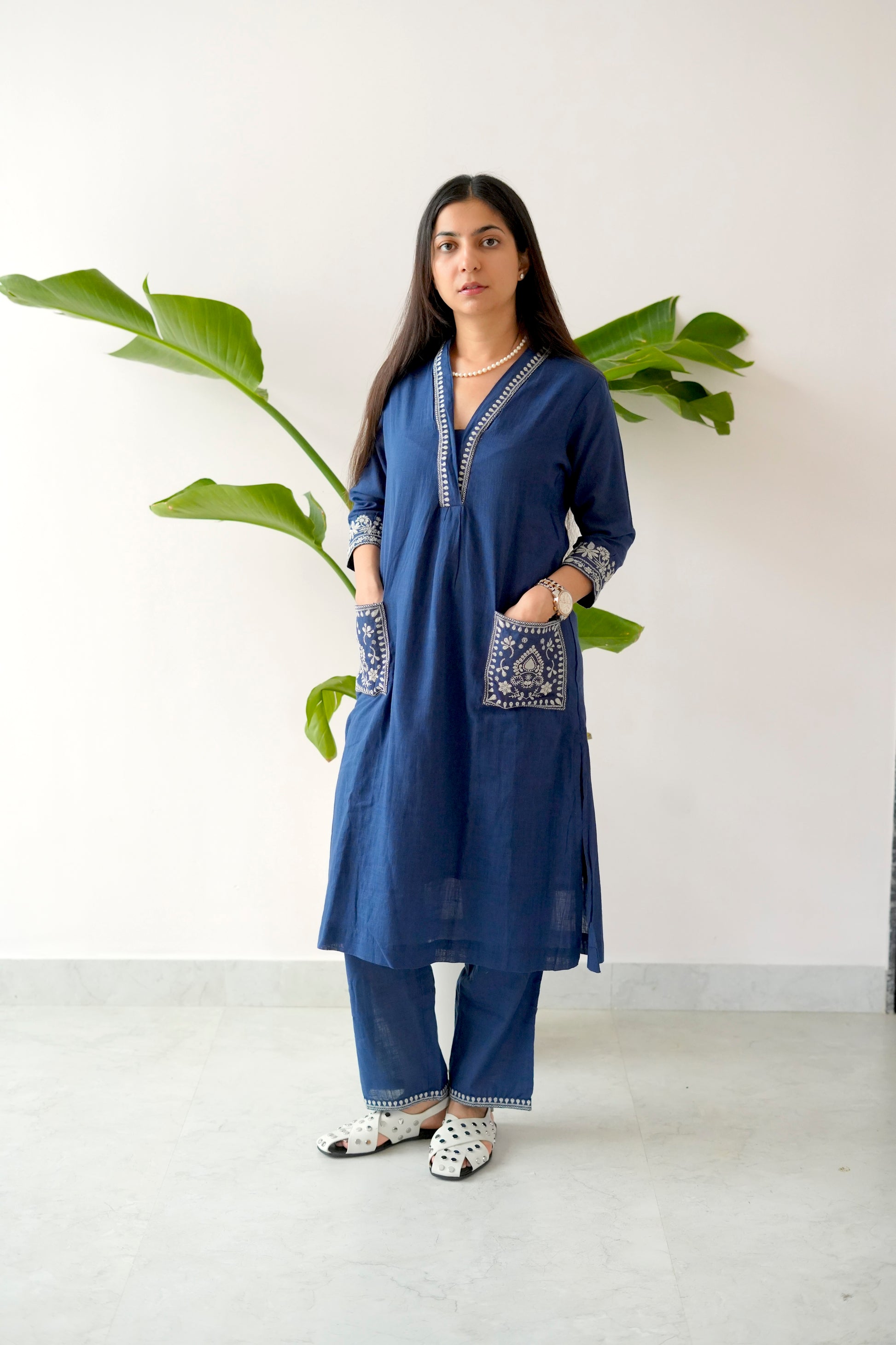Crafted from soft, breathable cotton, the kurta features an elegant V-neck with detailed hand embroidery along the neckline, cuffs, and front patch pockets – adding both beauty and function. The matching straight pants are finished with subtle thread detailing on the hem, keeping the silhouette crisp yet comfortable.