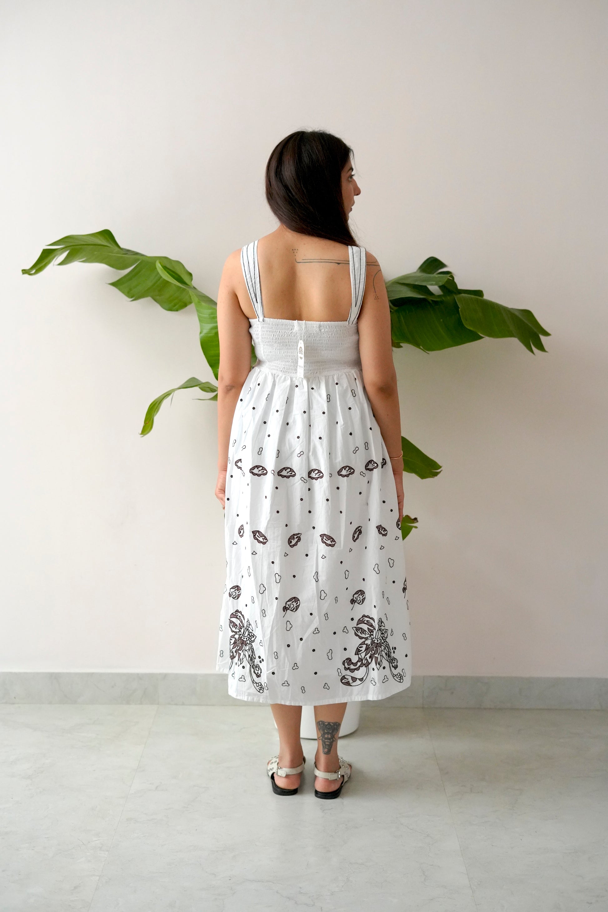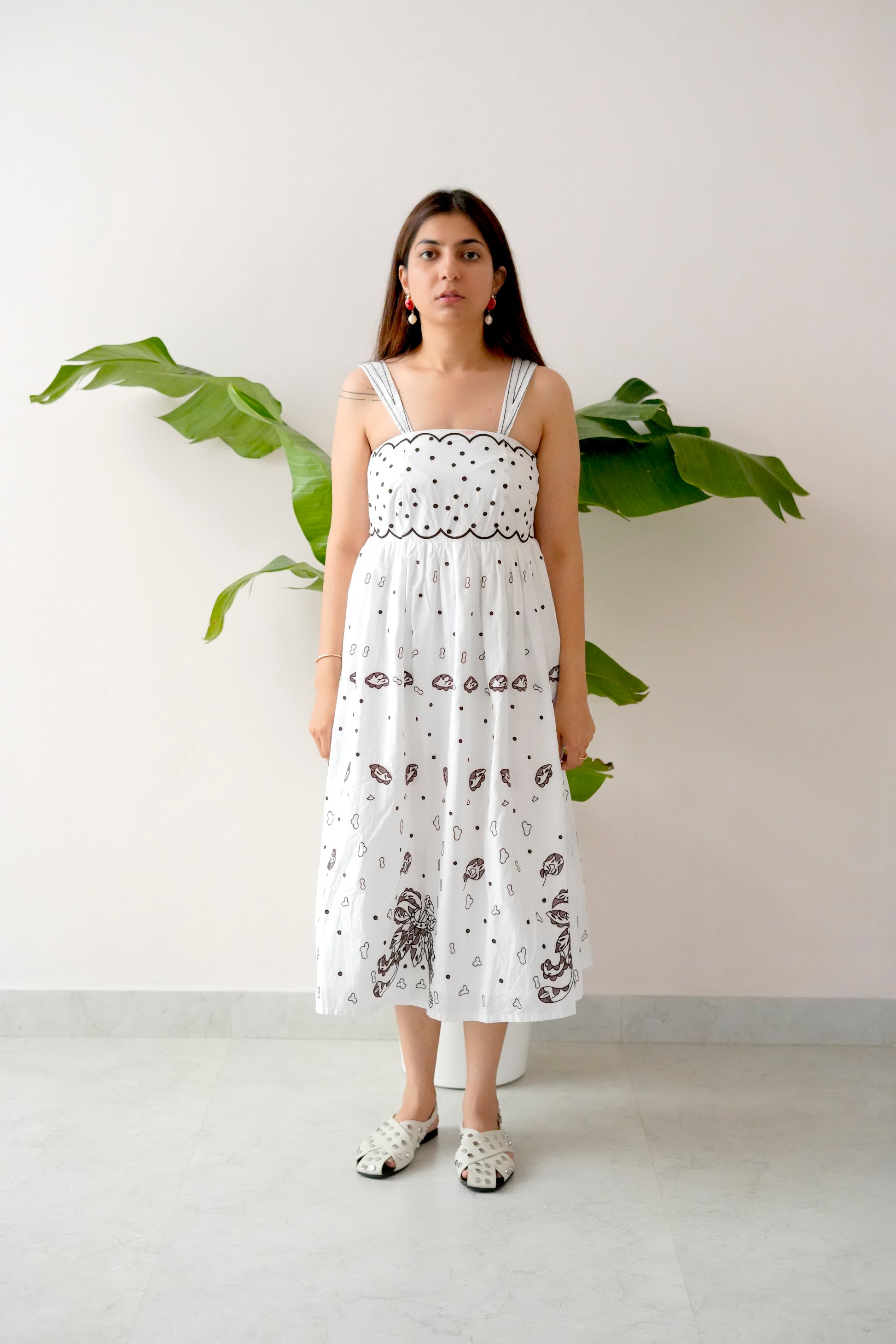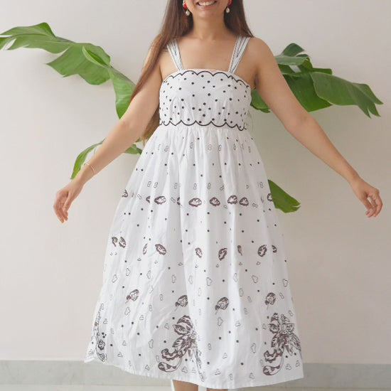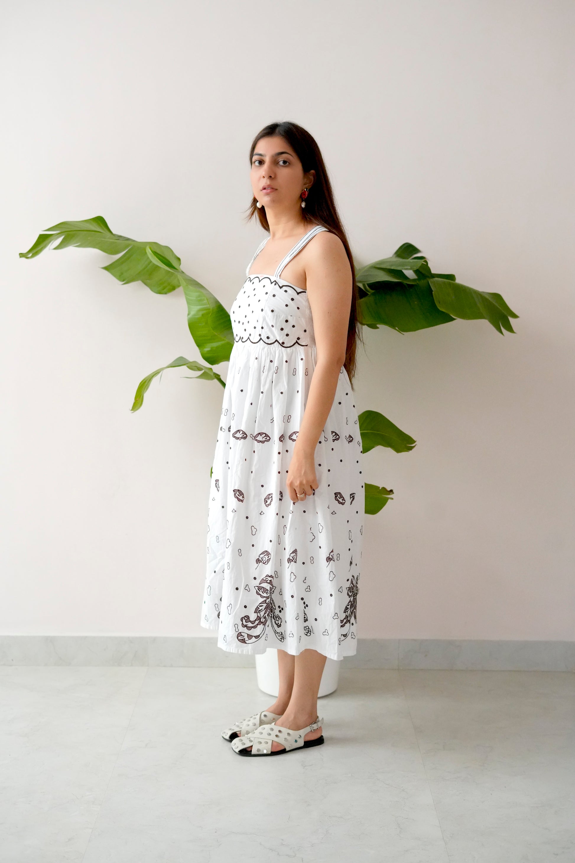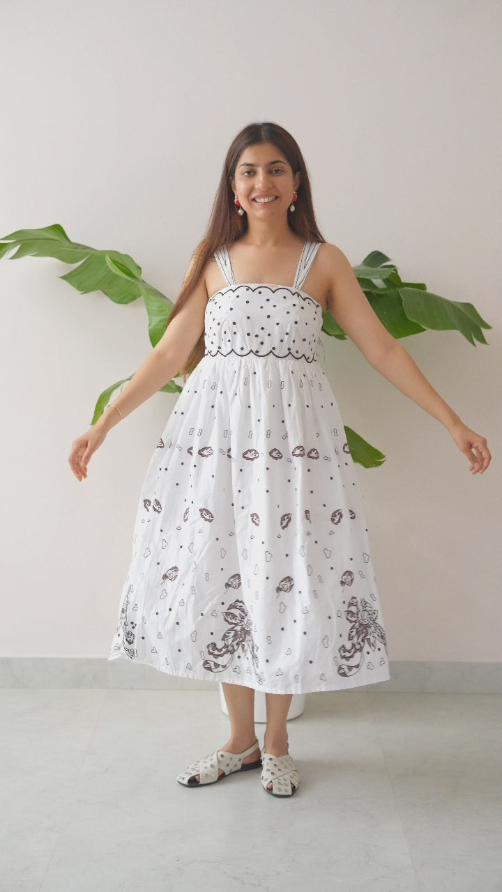 This breezy white midi dress is crafted in soft cotton and features a scalloped neckline, playful polka dots, and delicate abstract prints that add a dreamy charm to your look. The flowy silhouette and double-strap design make it perfect for staying cool and stylish all day long.