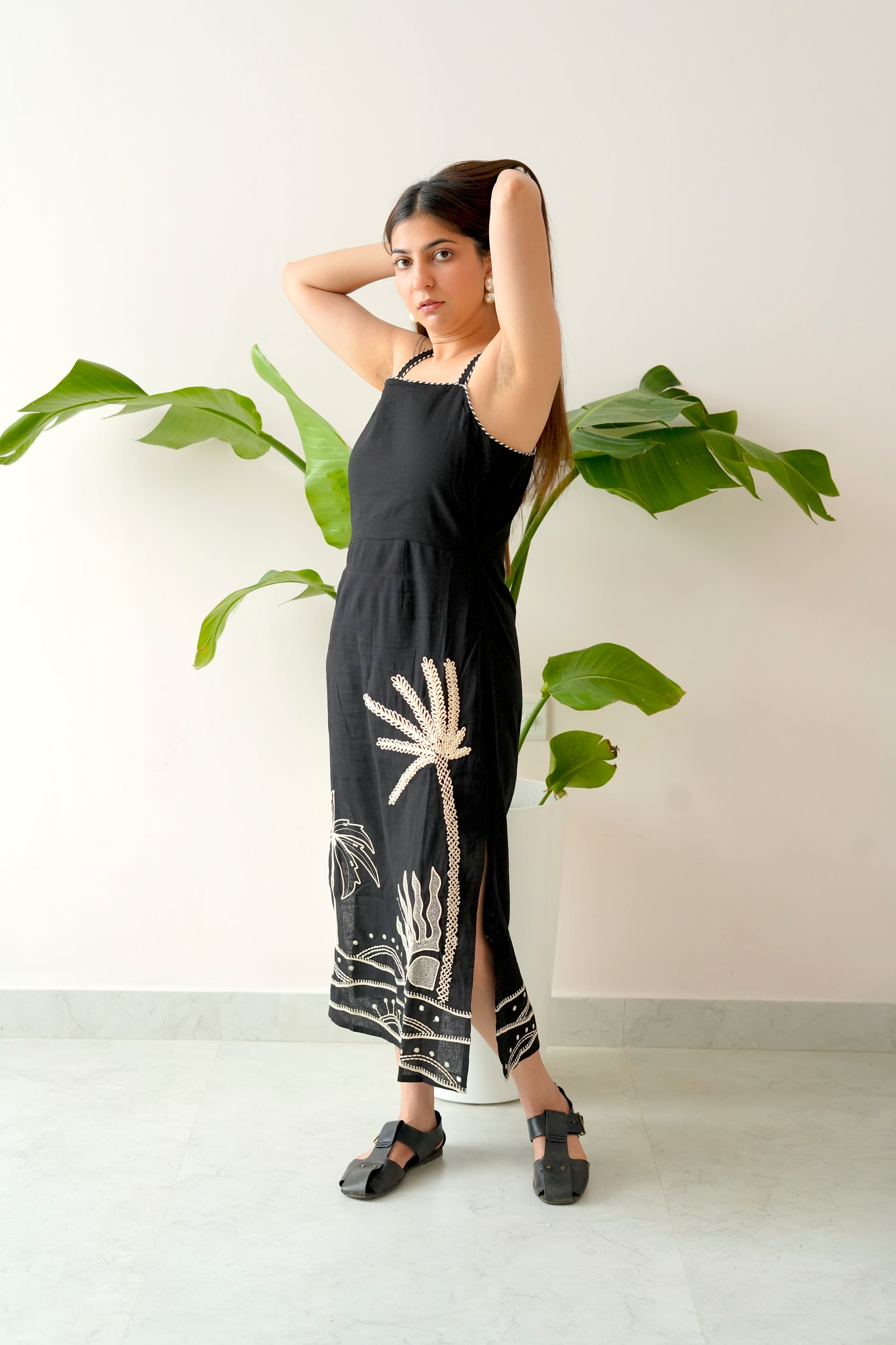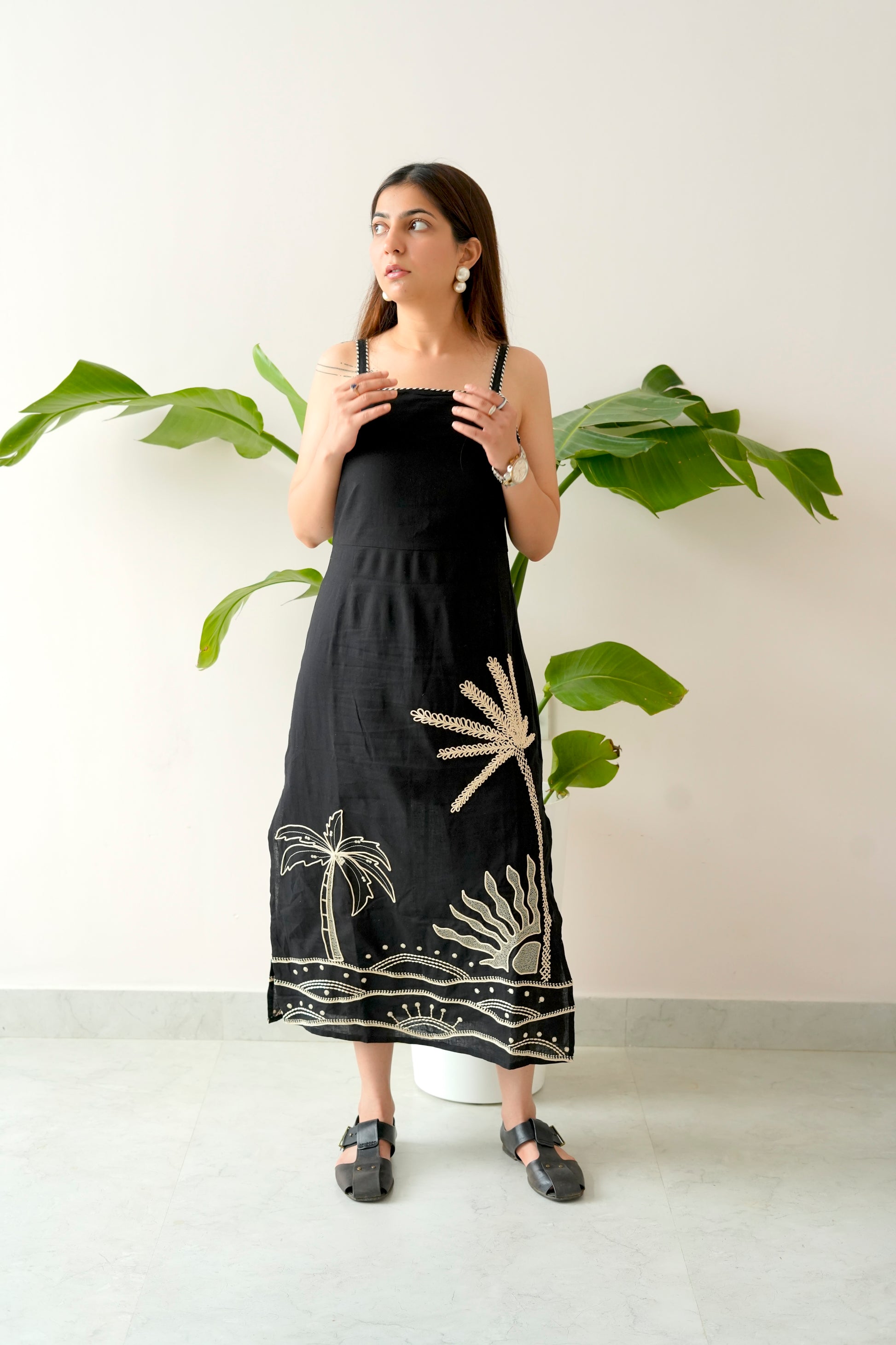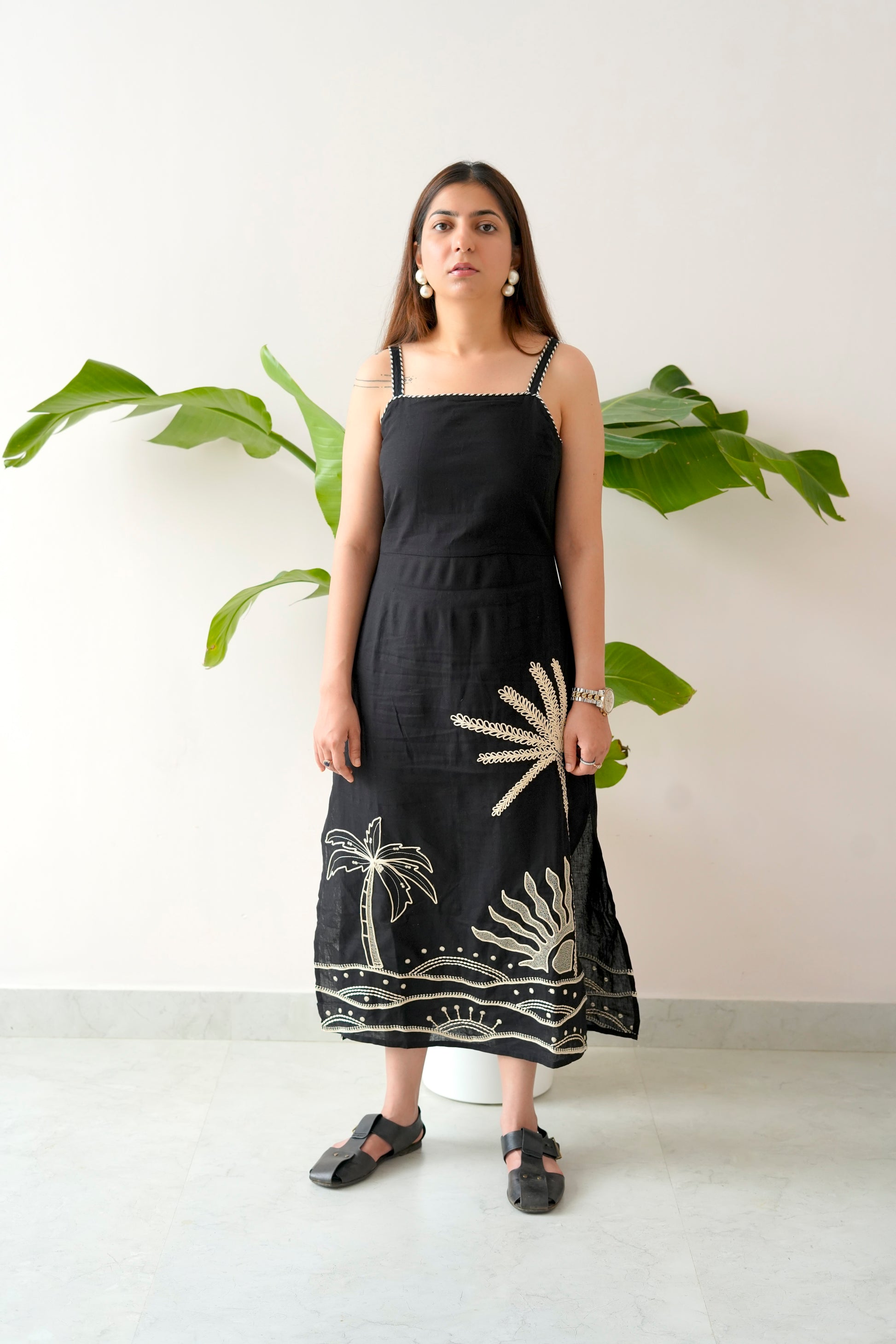 Meet Panjim – the dress that captures the soulful vibe of sun, sand, and sea in every detail. Crafted in timeless black, this midi dress features delicate straps and hand-done motifs of palm trees and the setting sun, bringing a touch of tropical artistry to your wardrobe.
