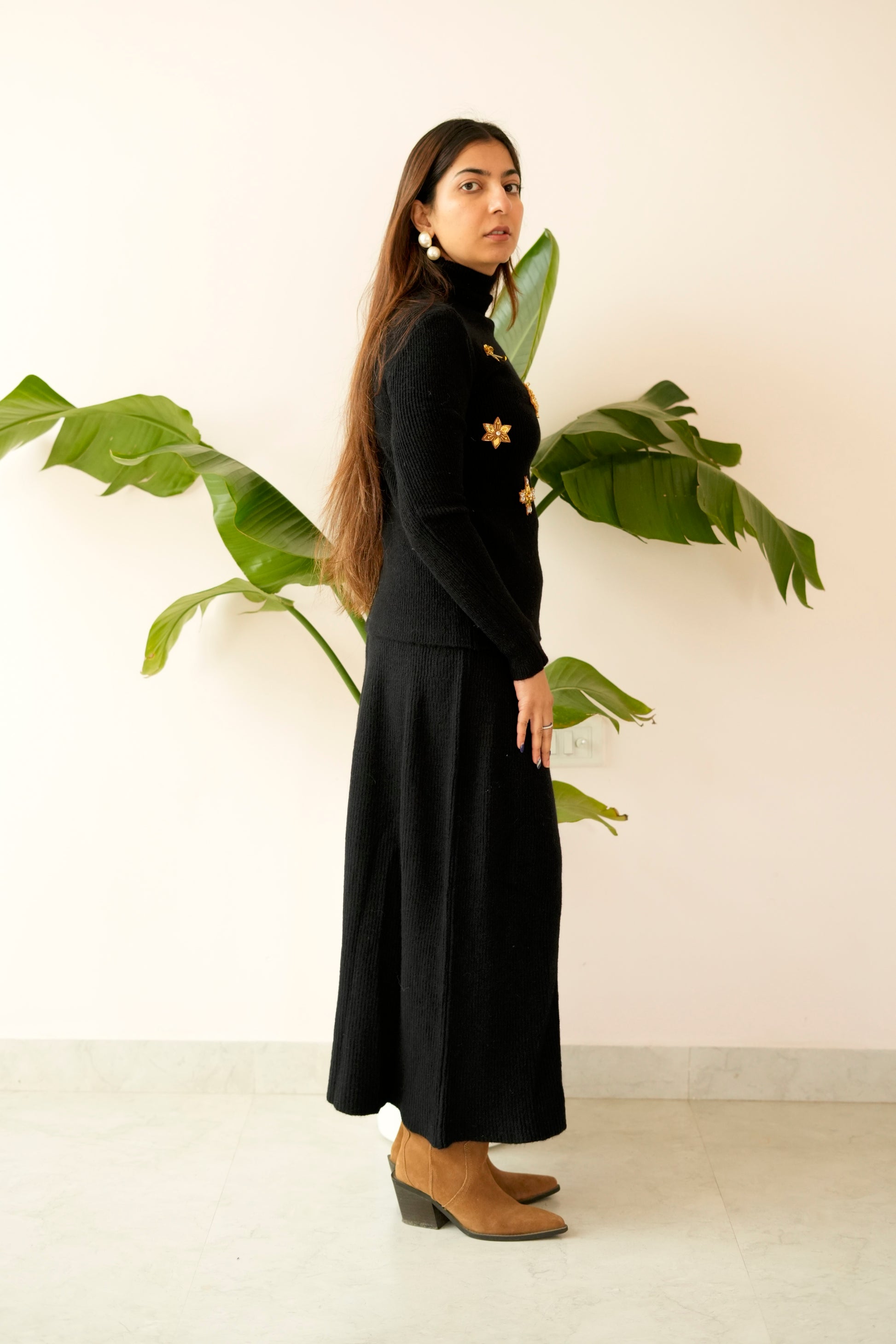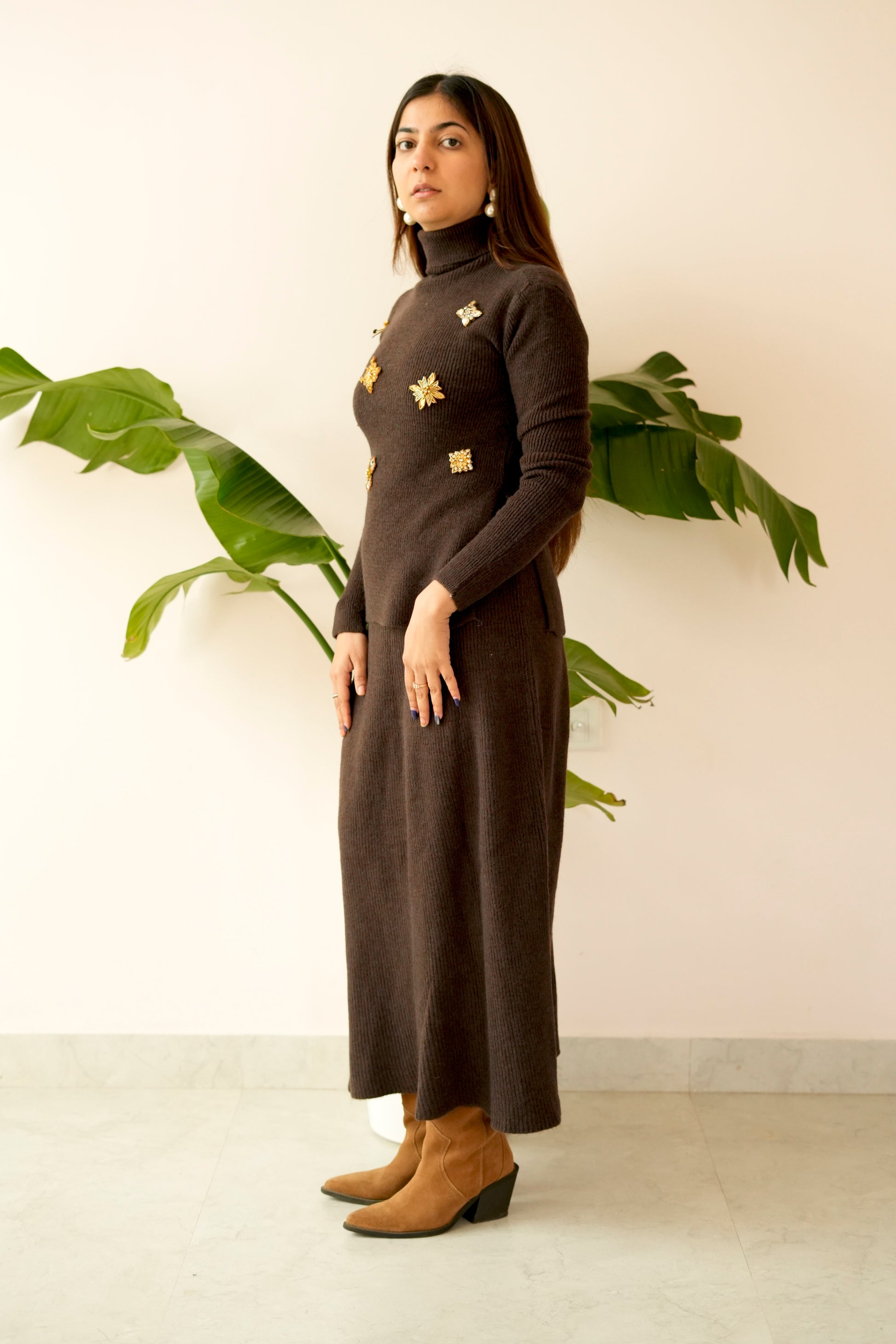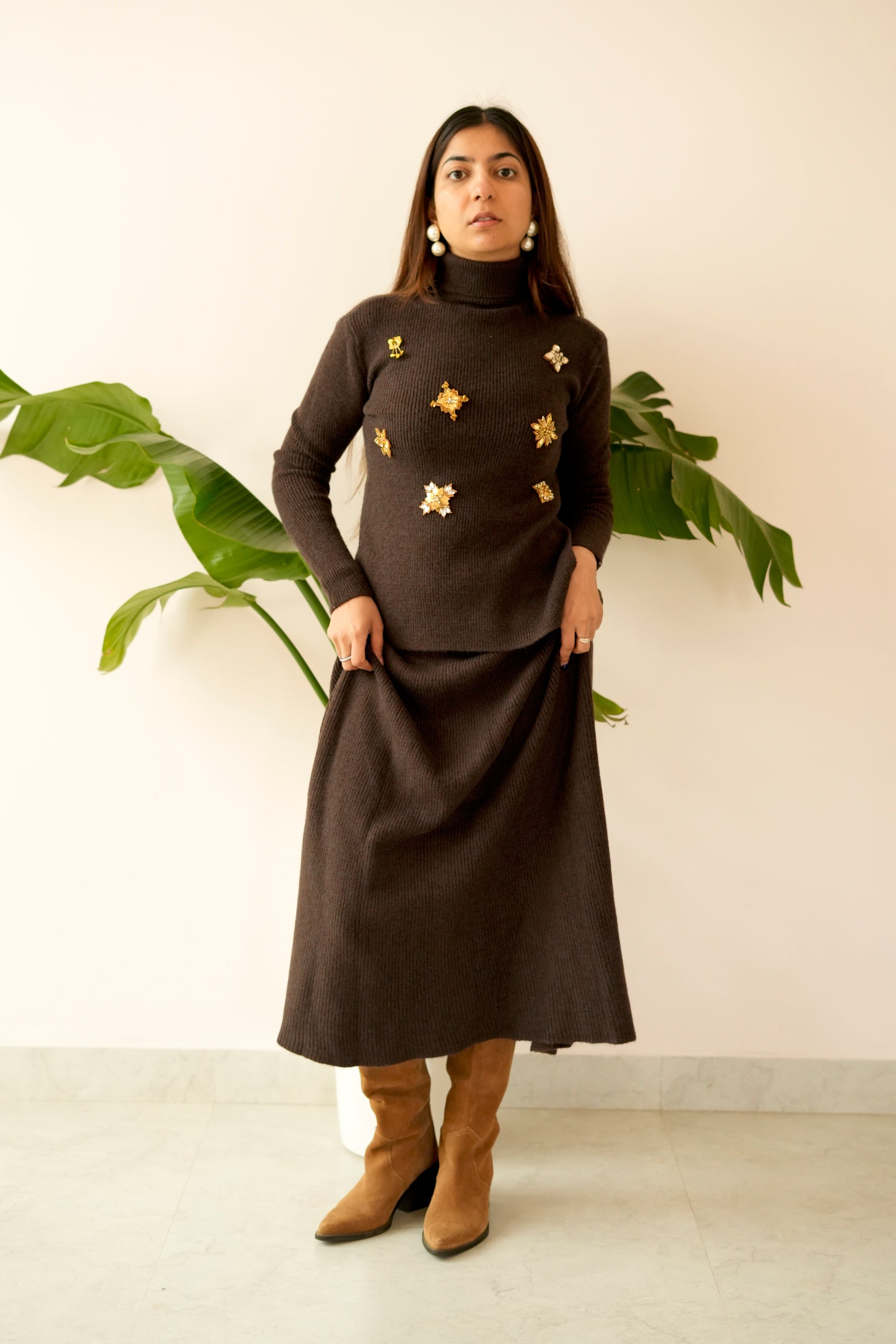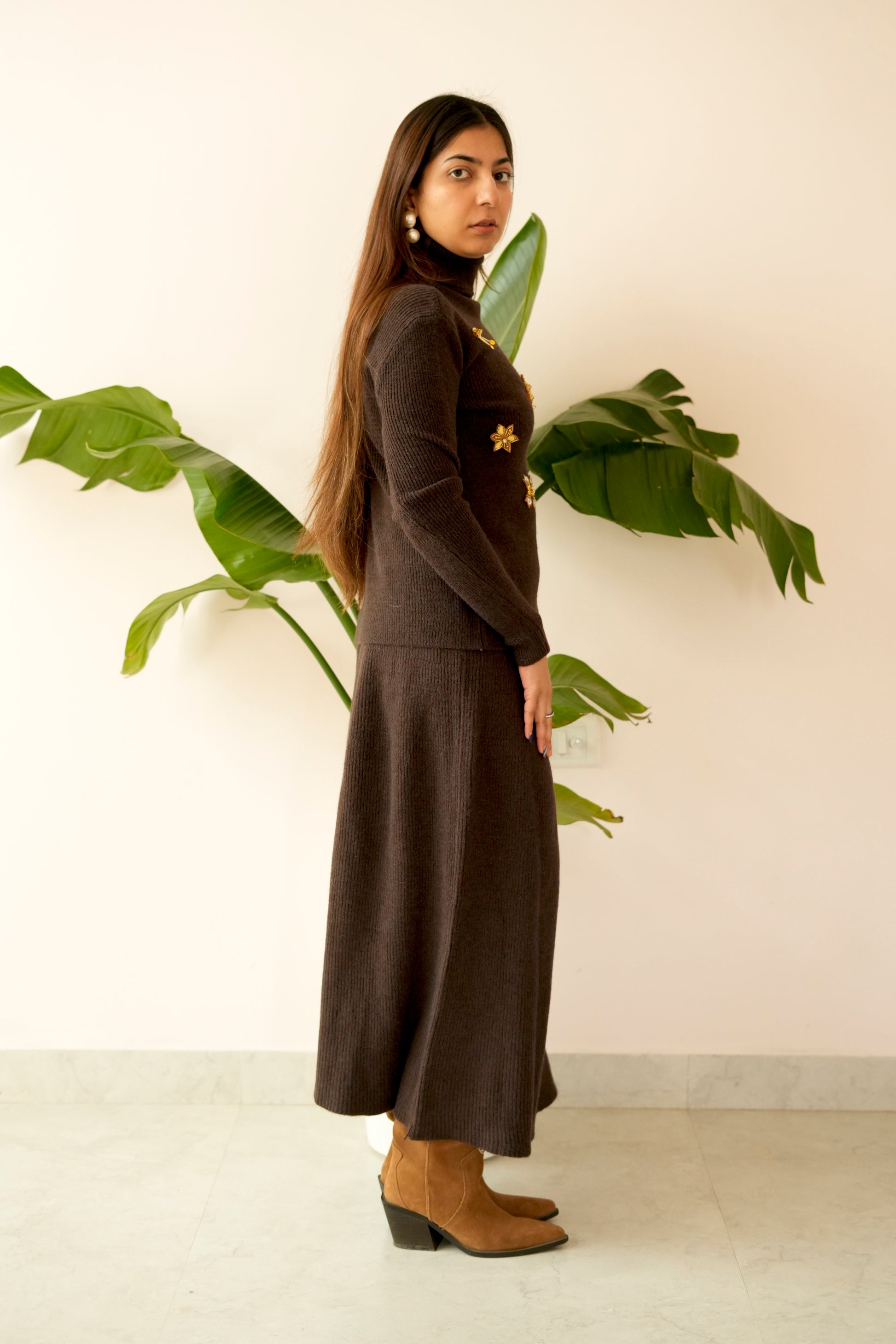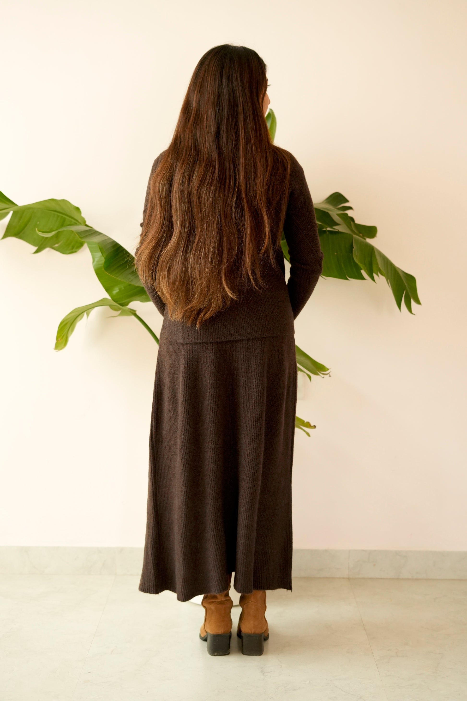The high-neck, full-sleeve knit top offers a clean, structured fit, while the straight-fit long skirt creates a flattering, elongated silhouette. Whether worn as a complete set or styled separately, this co-ord is a versatile winter essential that transitions seamlessly from day to evening.