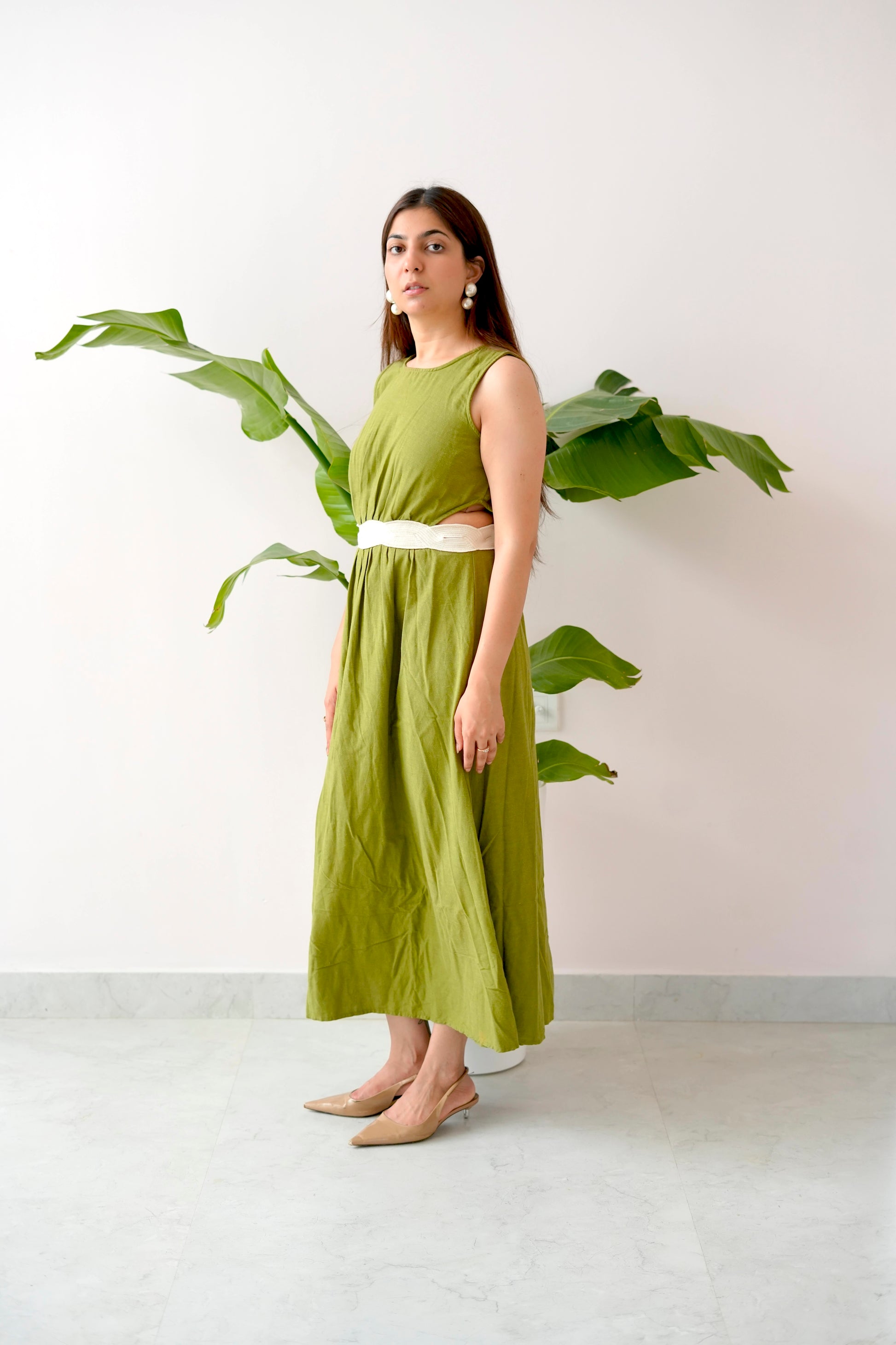 Featuring a soft, flowy silhouette crafted from breathable cotton, itโs cinched at the waist with a unique snakeskin-inspired woven belt that adds just the right amount of bite. Cut-out sides give it a contemporary twist, while the relaxed, sleeveless design keeps it cool and timeless.