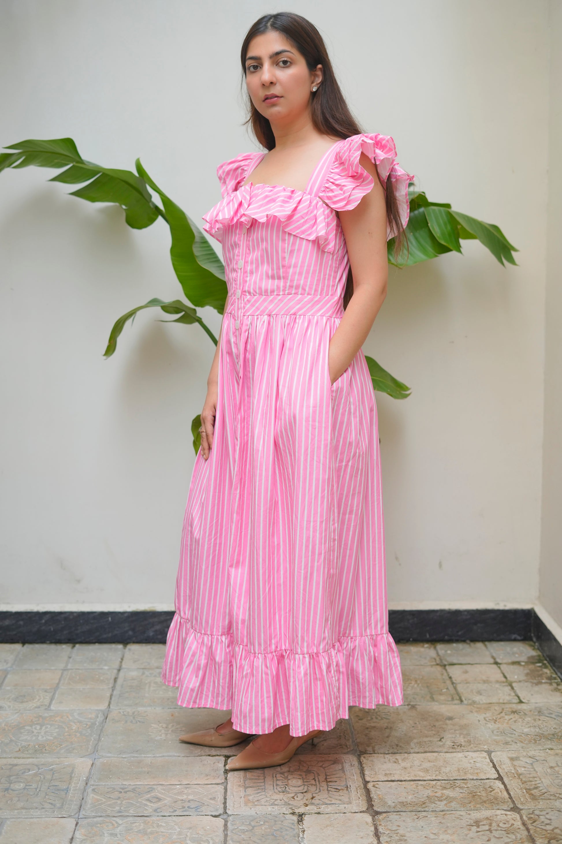 Crafted from lightweight, breathable cotton, Sushi features a button-down front, fluttery shoulder straps, and a flowy A-line silhouette with a flounce hem for that extra bounce. Available in dreamy pastel shades of pink, blue, and yellow, this dress is all about keeping your vibe bright, cheerful, and effortlessly chic.